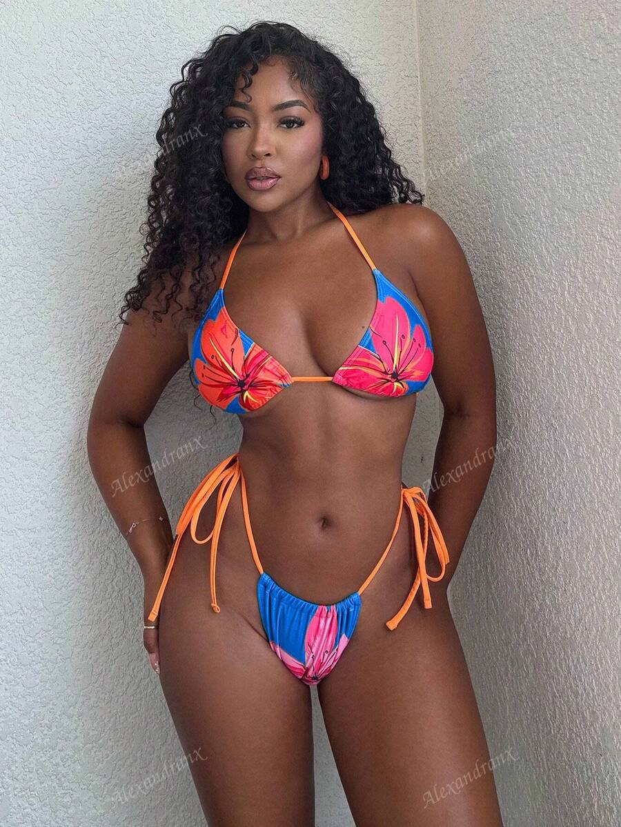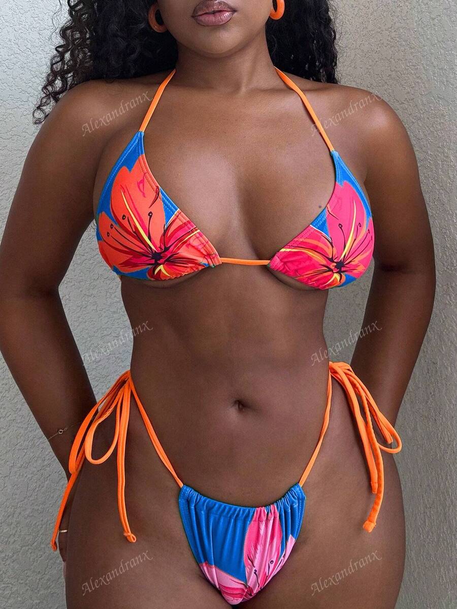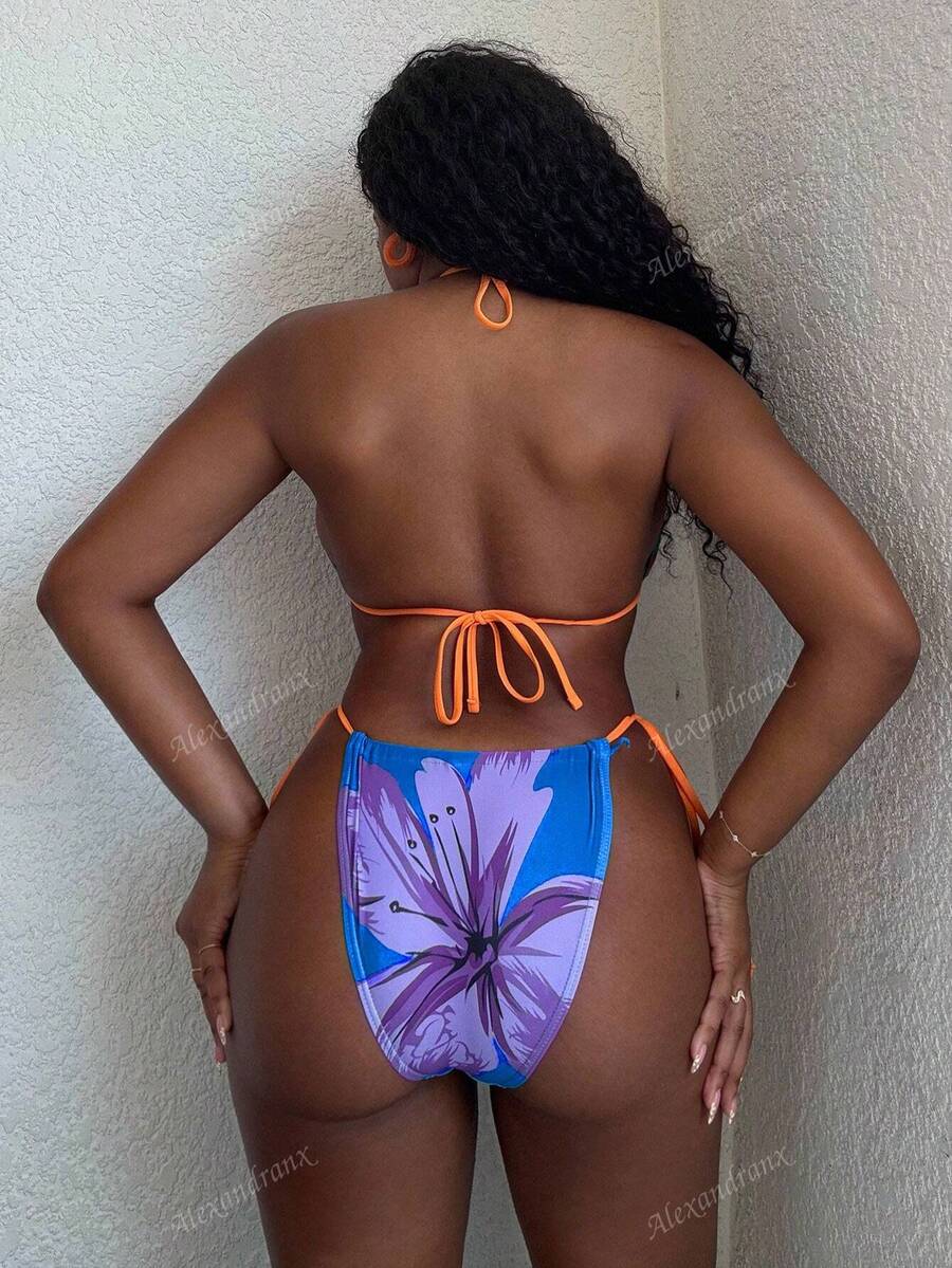 Alexandranx conjunto de bikini de 2 piezas con estampado floral de verano, brasier triangular de halter y bottom con lazos laterales