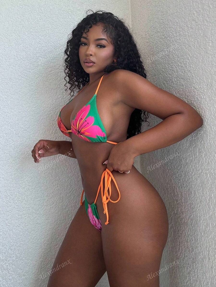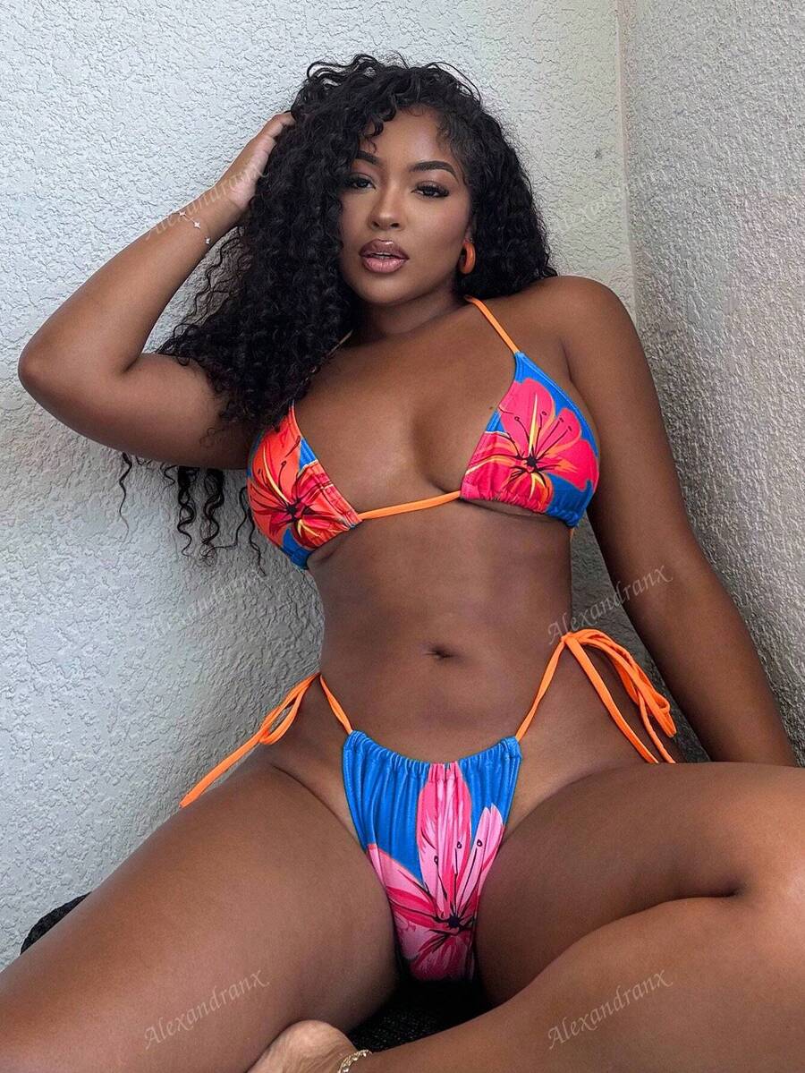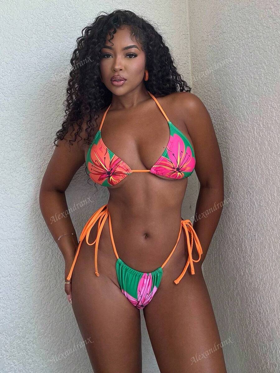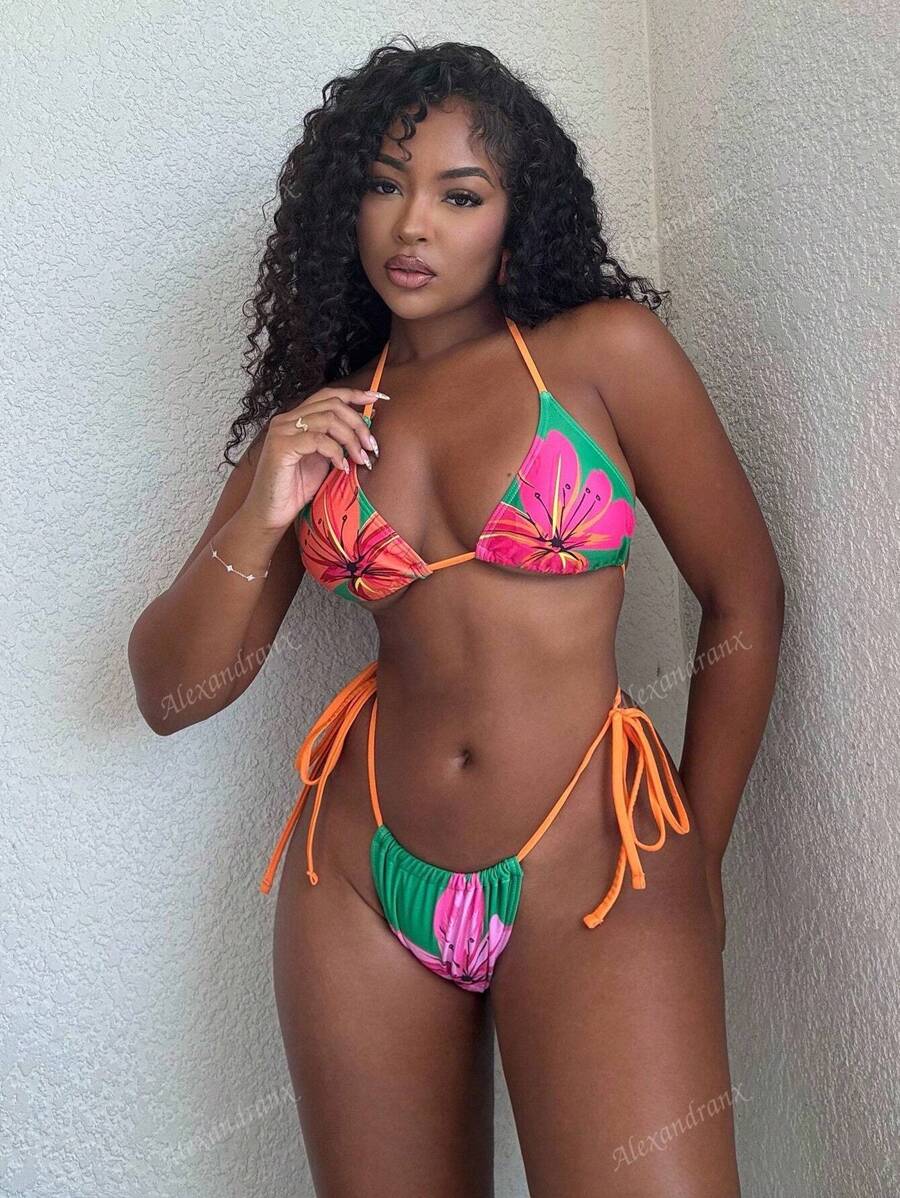 Alexandranx conjunto de bikini de 2 piezas con estampado floral de verano, brasier triangular de halter y bottom con lazos laterales