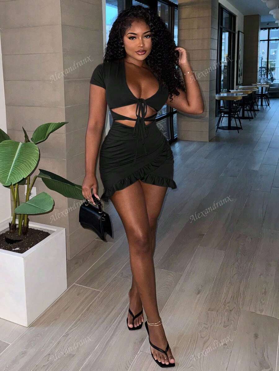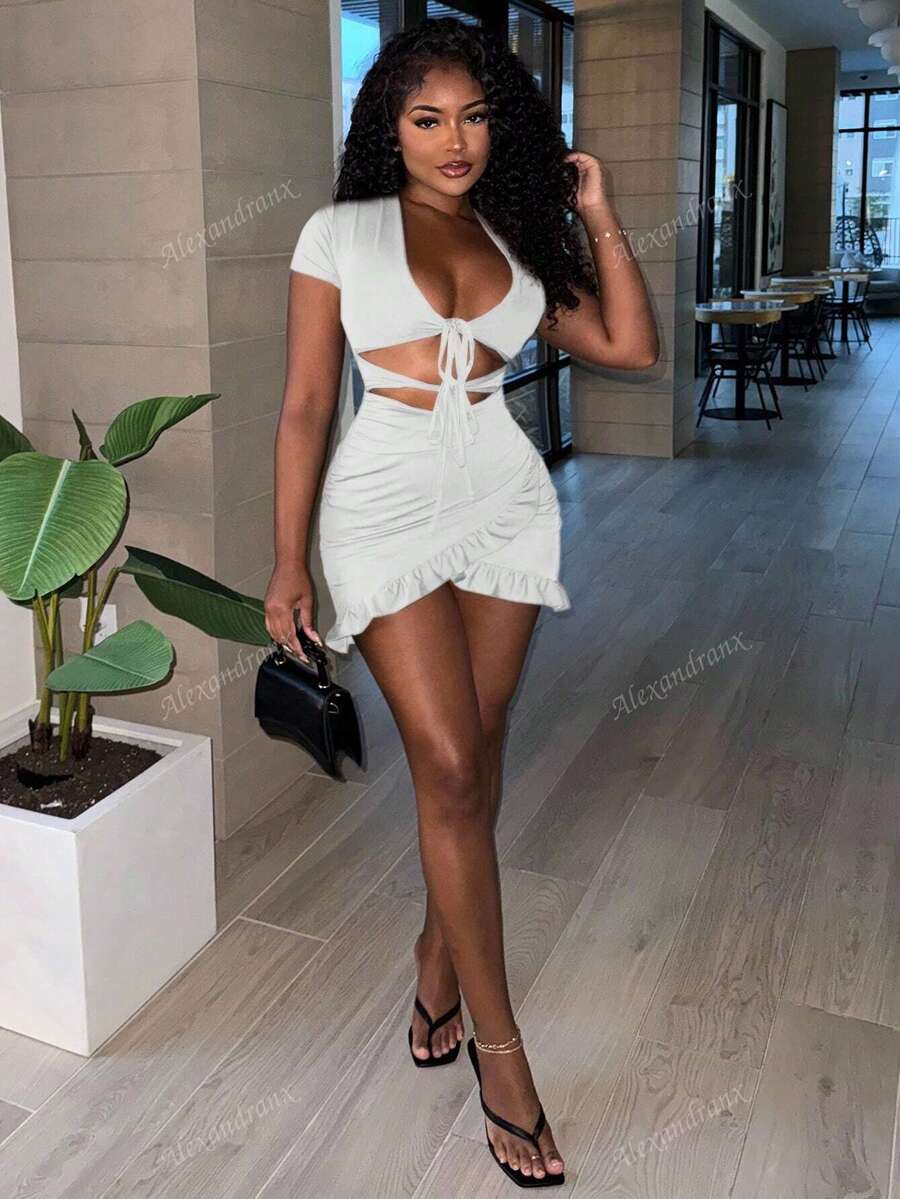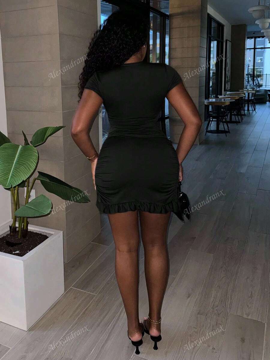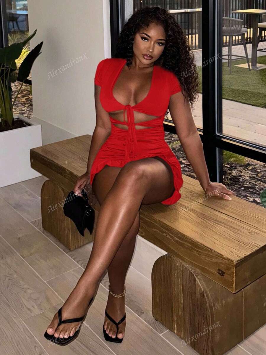 Alexandranx vestido bajo cruzado ribete con fruncido con abertura delantera con cordon