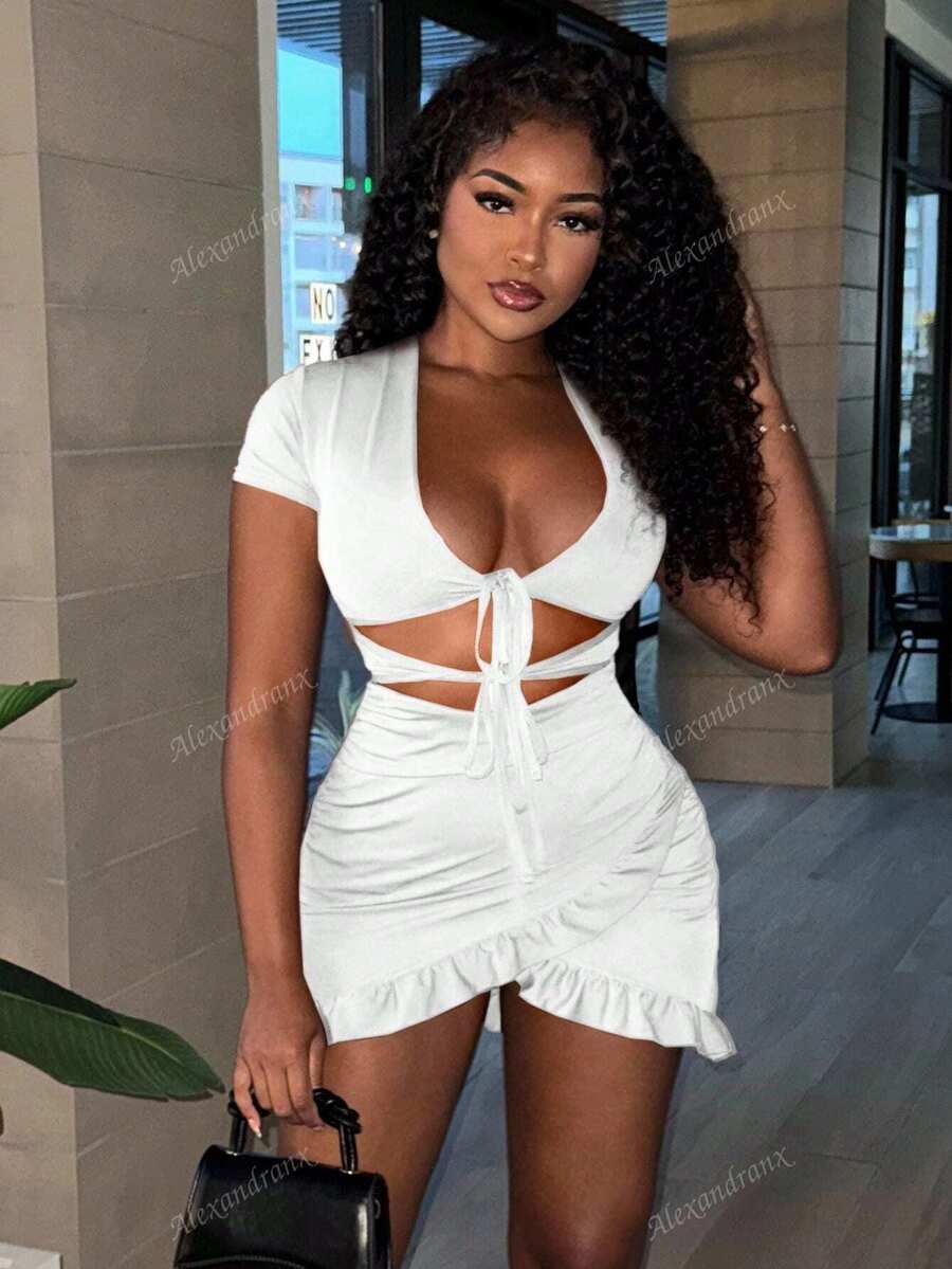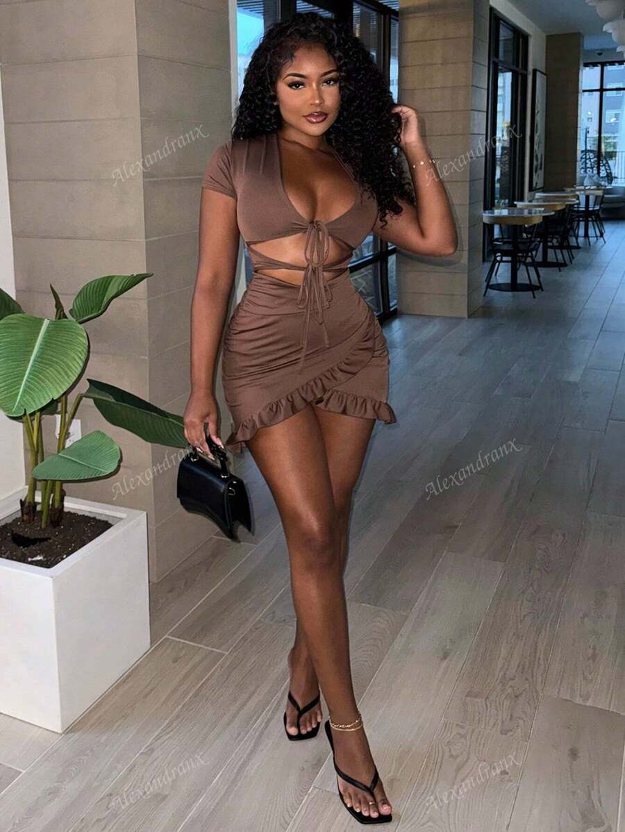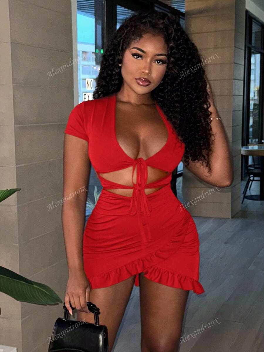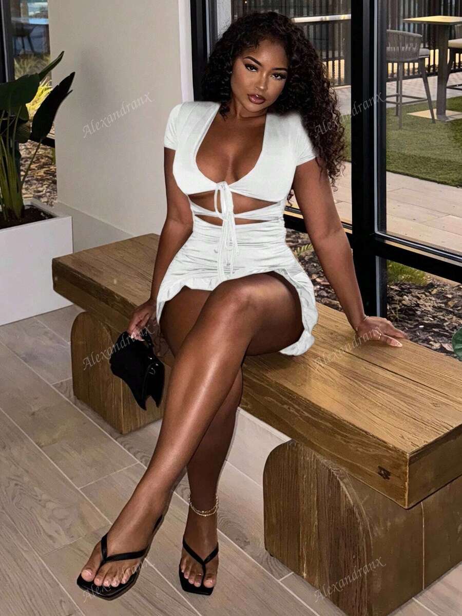 Alexandranx vestido bajo cruzado ribete con fruncido con abertura delantera con cordon