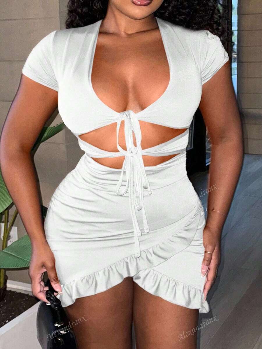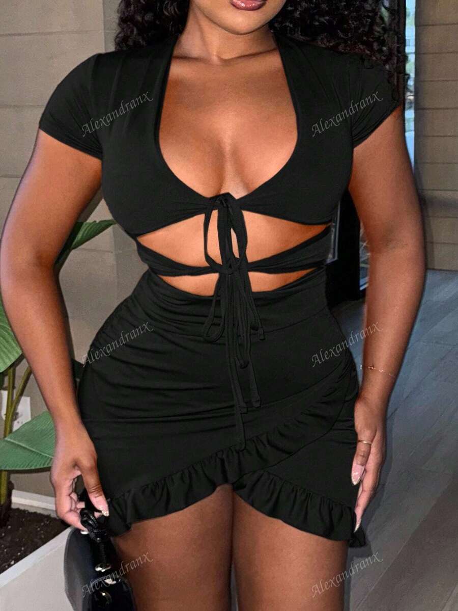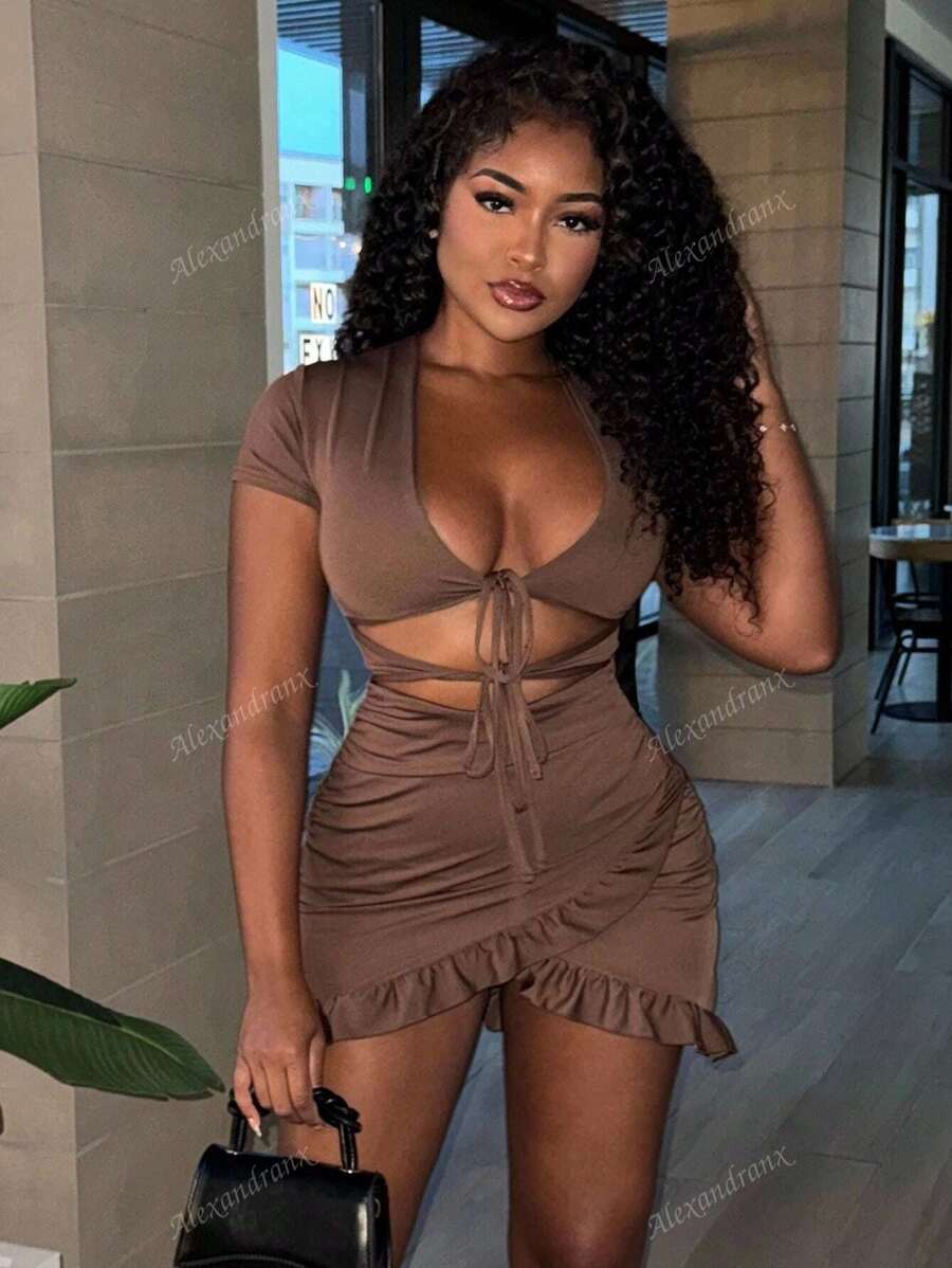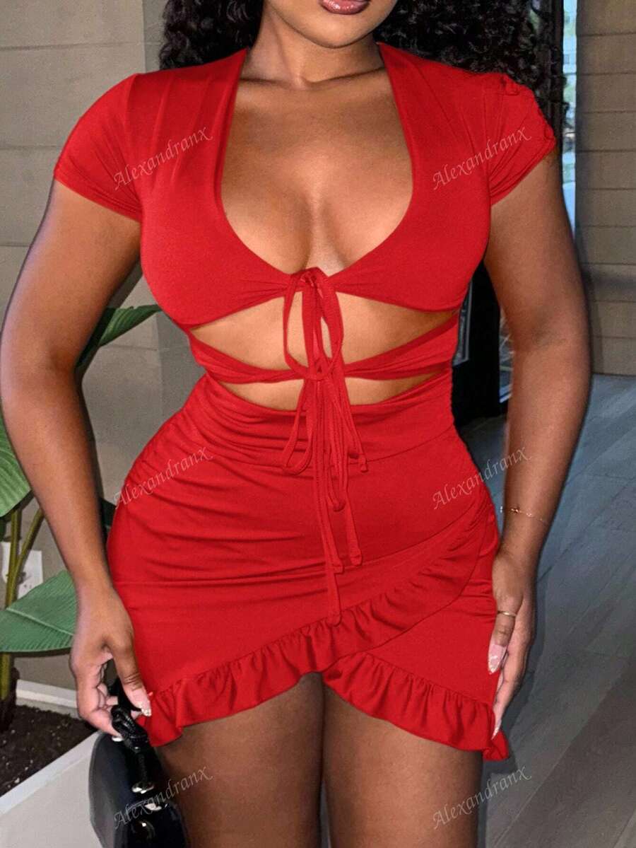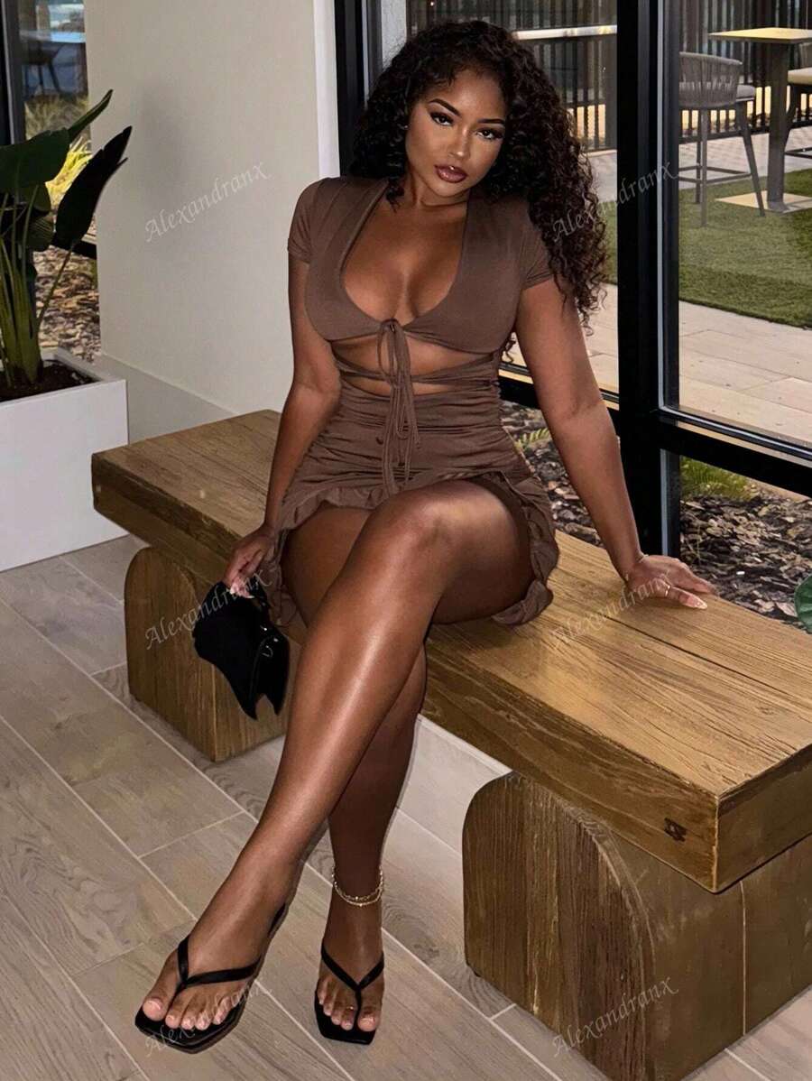 Alexandranx vestido bajo cruzado ribete con fruncido con abertura delantera con cordon
