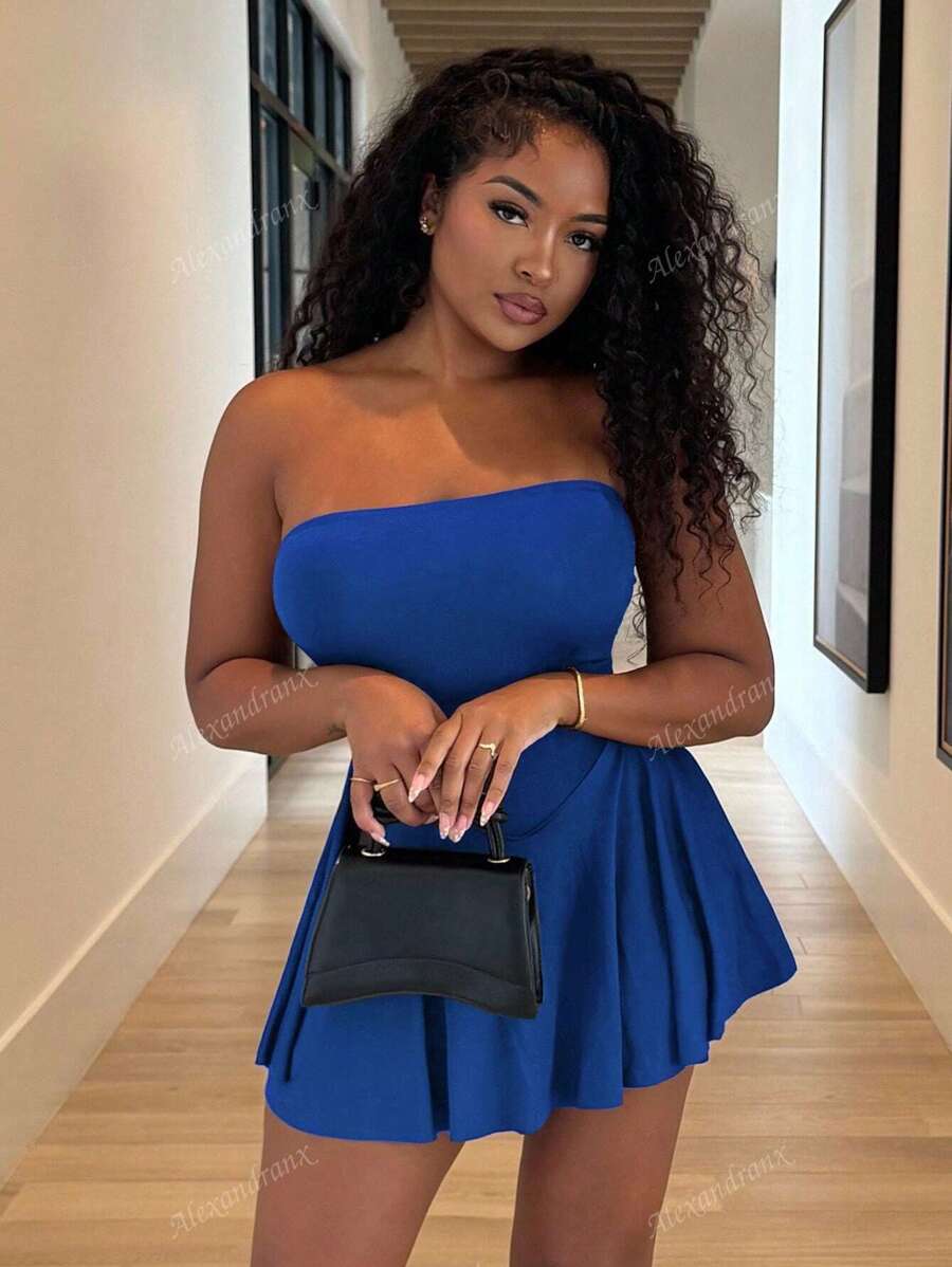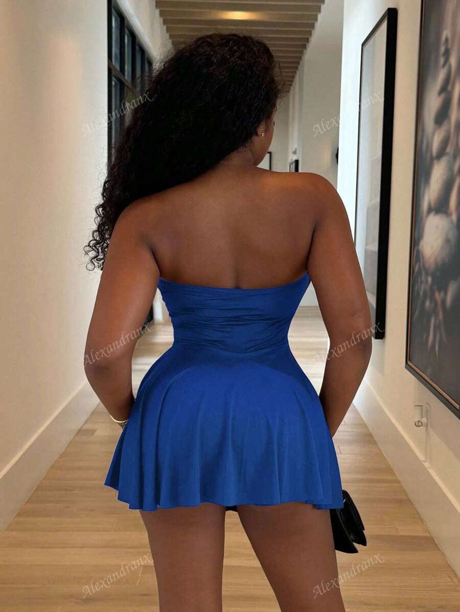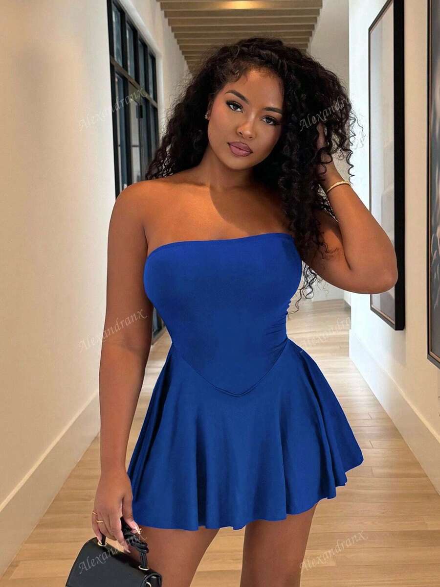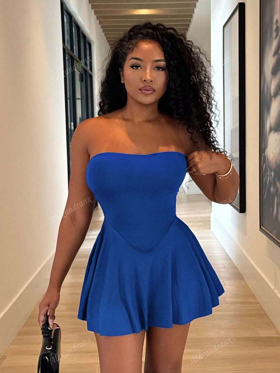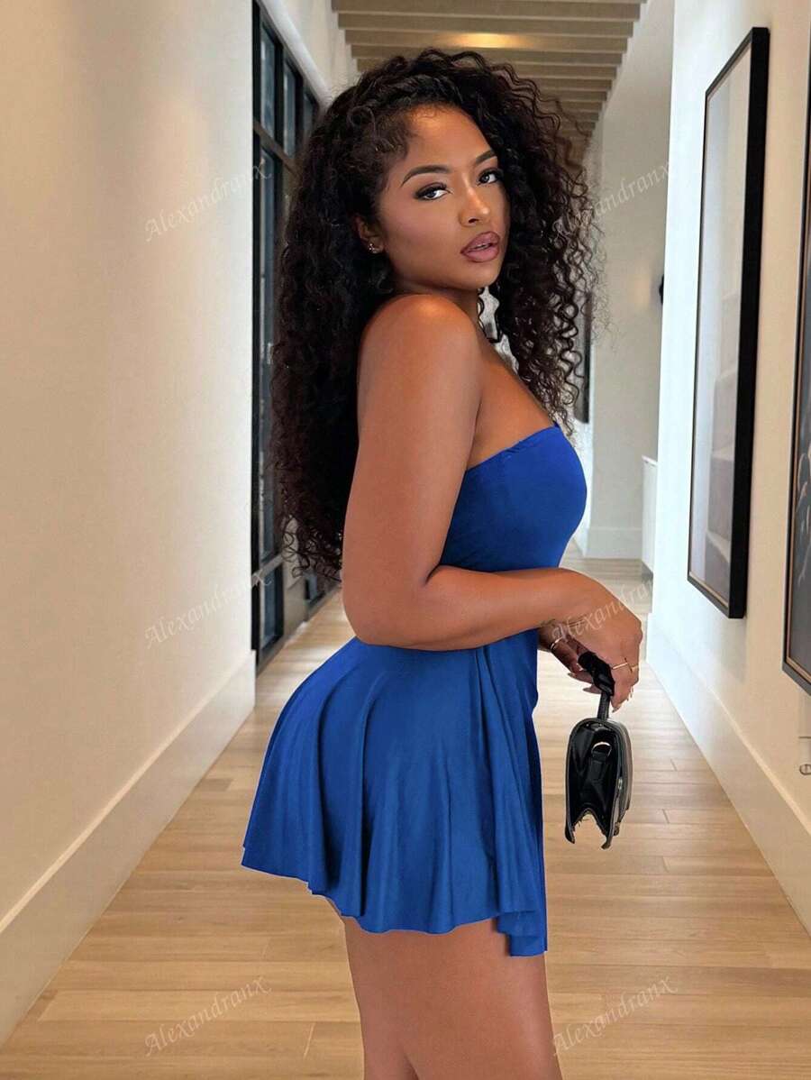 Alexandranx vestido minifalda elegante de color azul solido para mujer