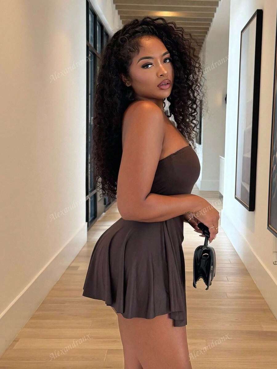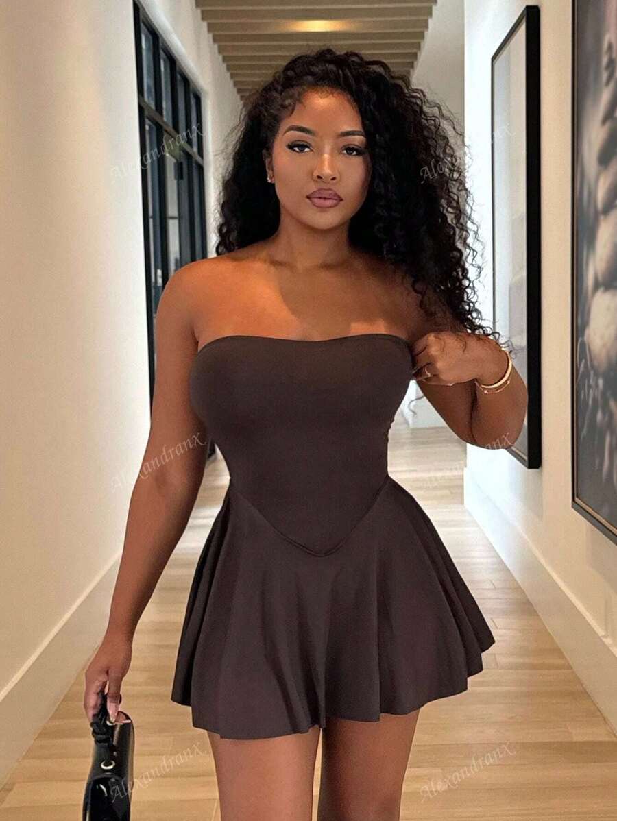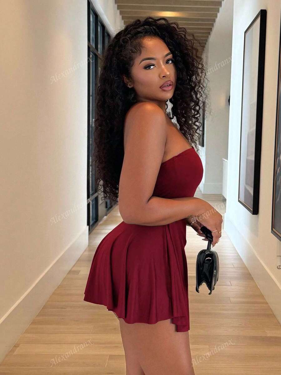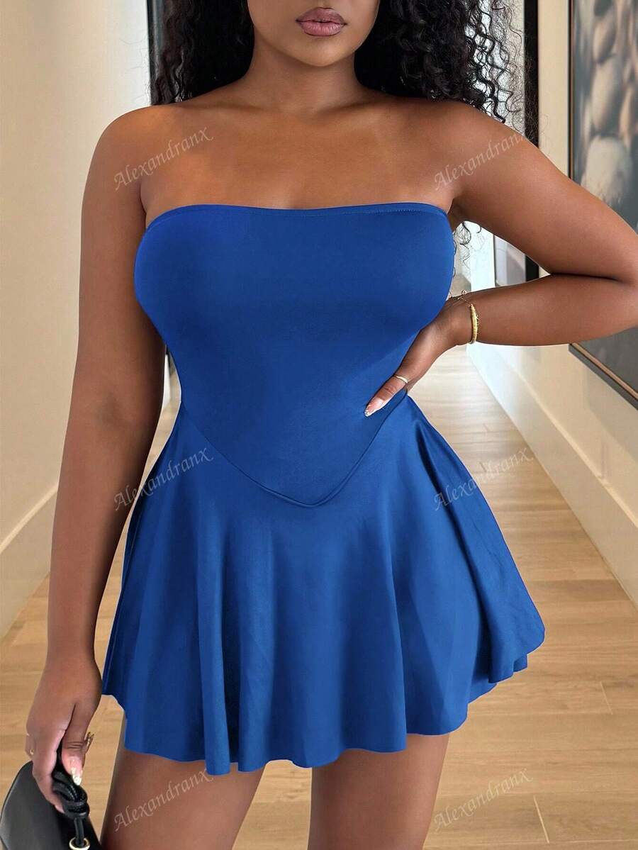 Alexandranx vestido minifalda elegante de color azul solido para mujer