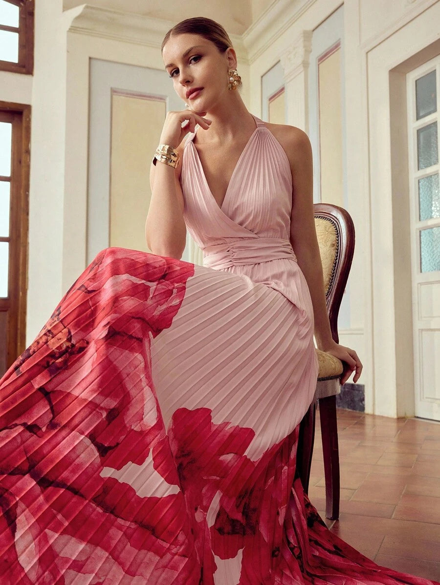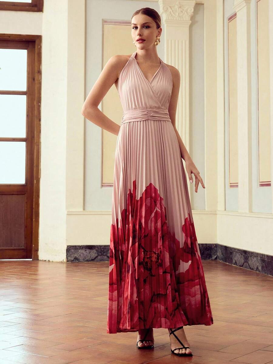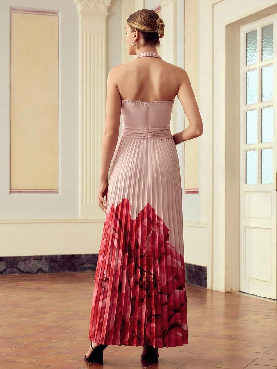 Vestido elegante de mujer con estampado floral, cintura plisada y cuello halter