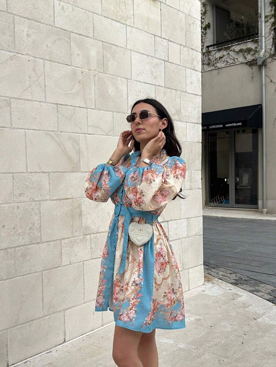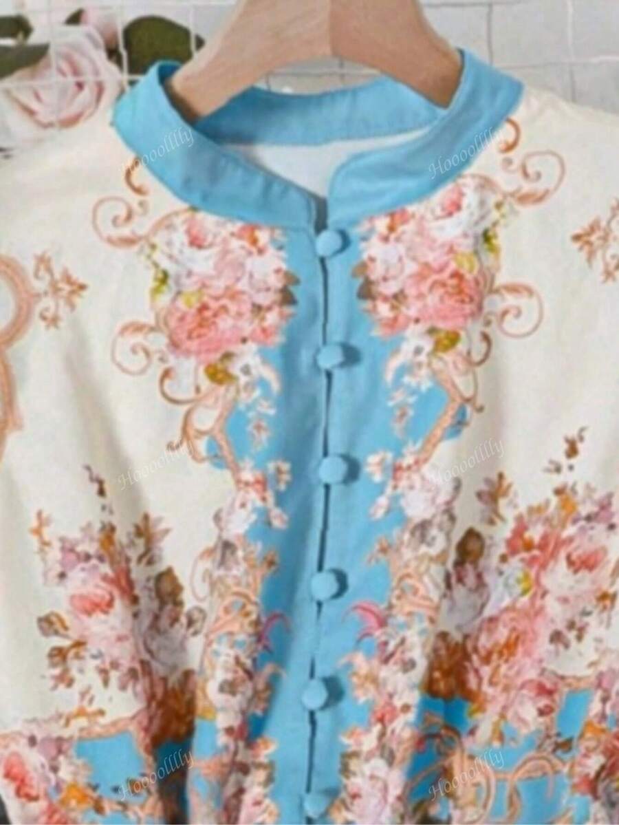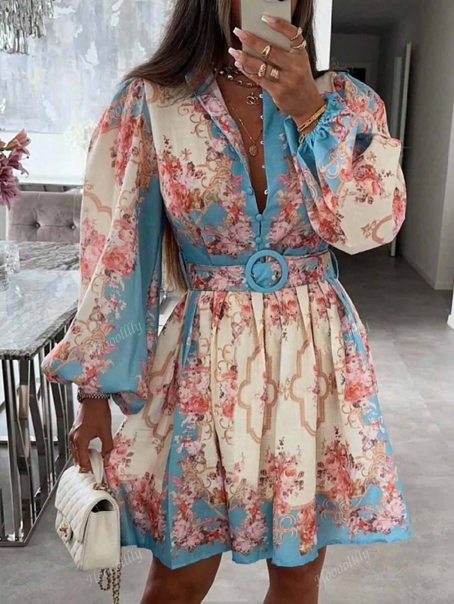Vestido elegante de manga farol con cordones, de alta calidad, con patron floral aleatorio y estilo retro, para otono e invierno (incluye cinturon)