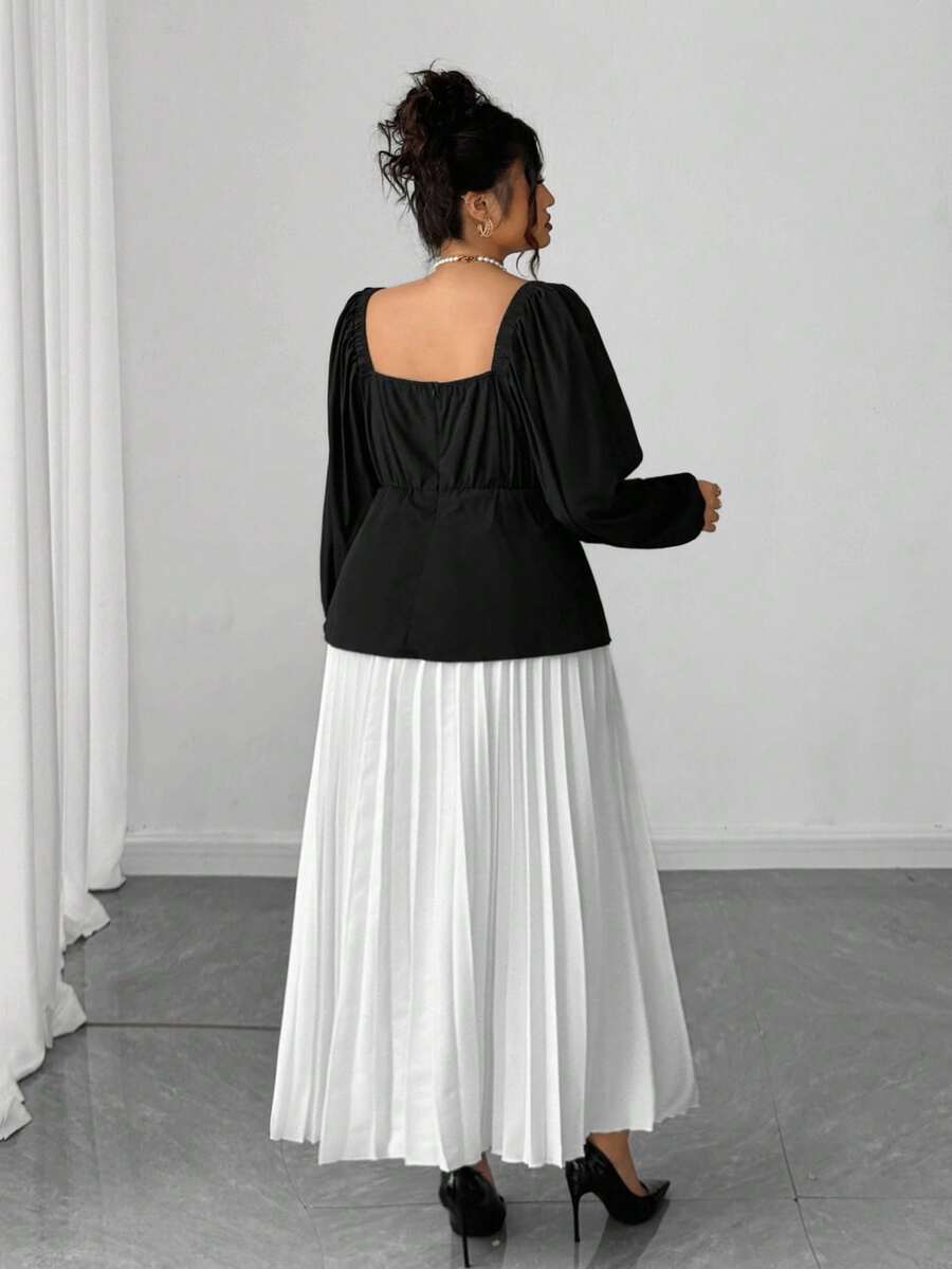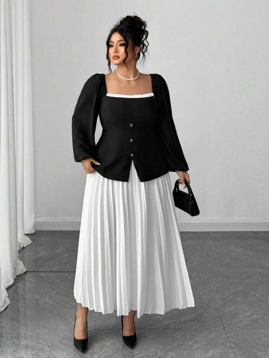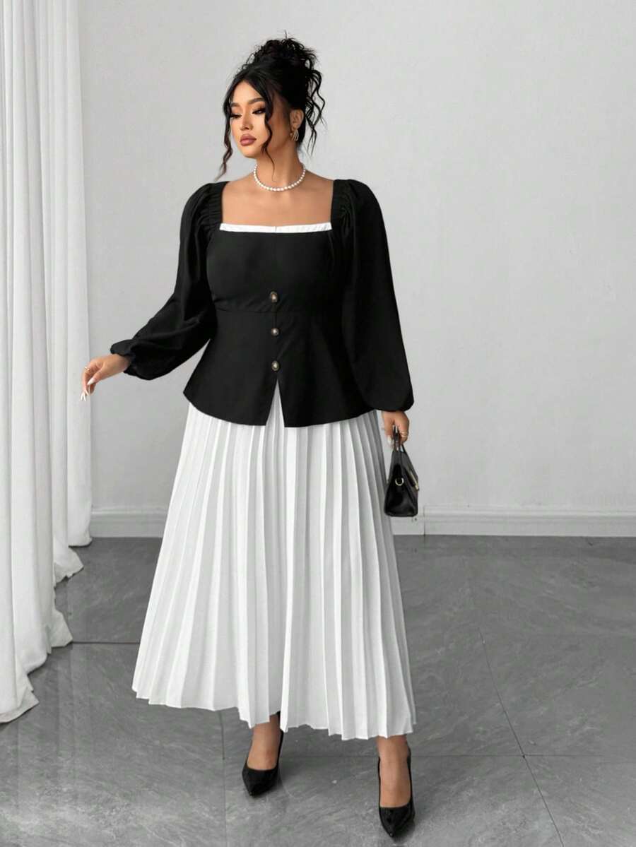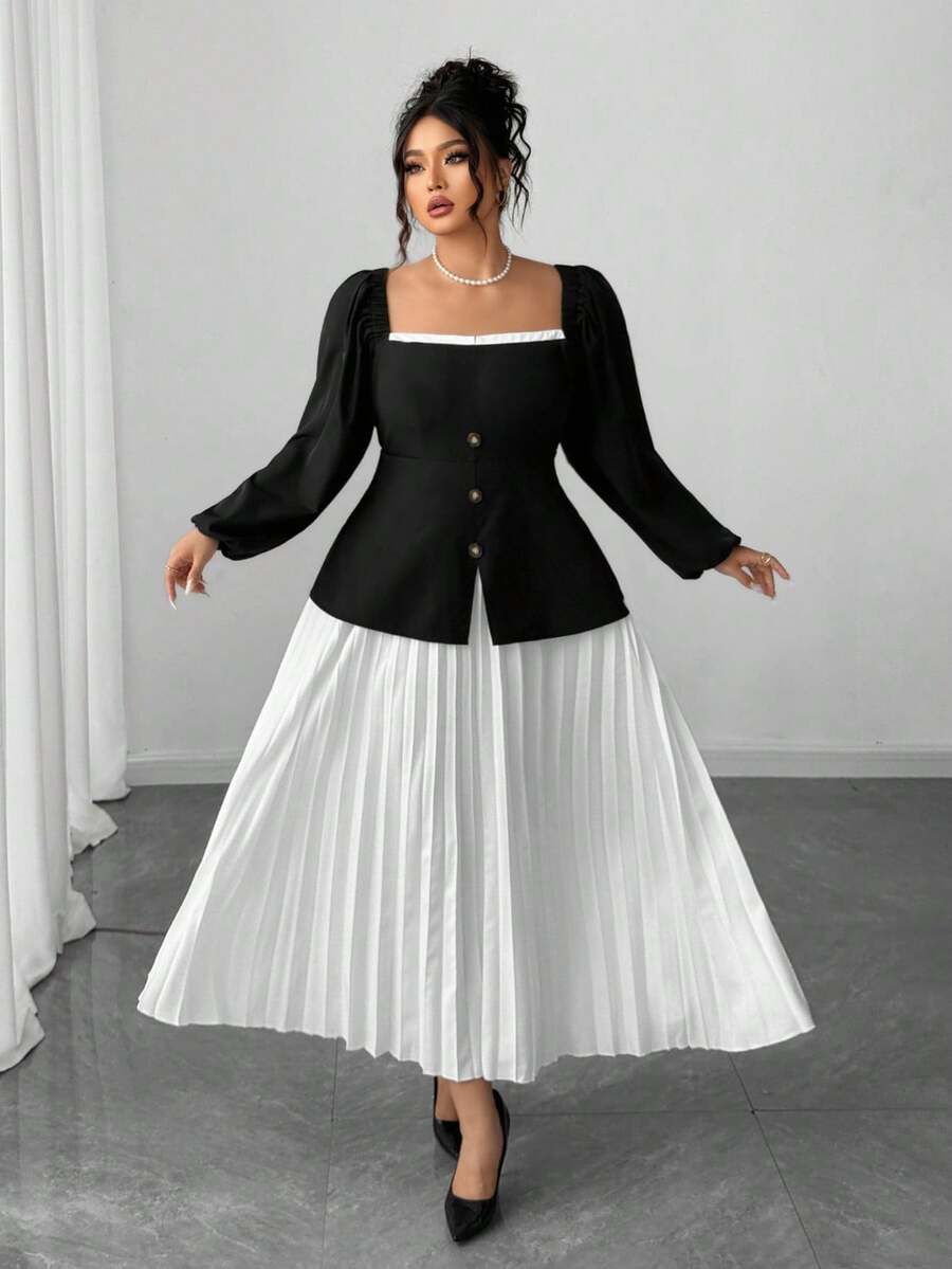 Vestido corto con cuello cuadrado, mangas abullonadas y falda plisada, efecto estilizante, talla grande