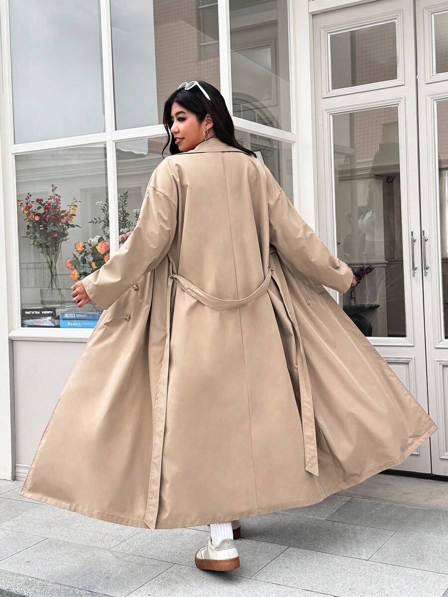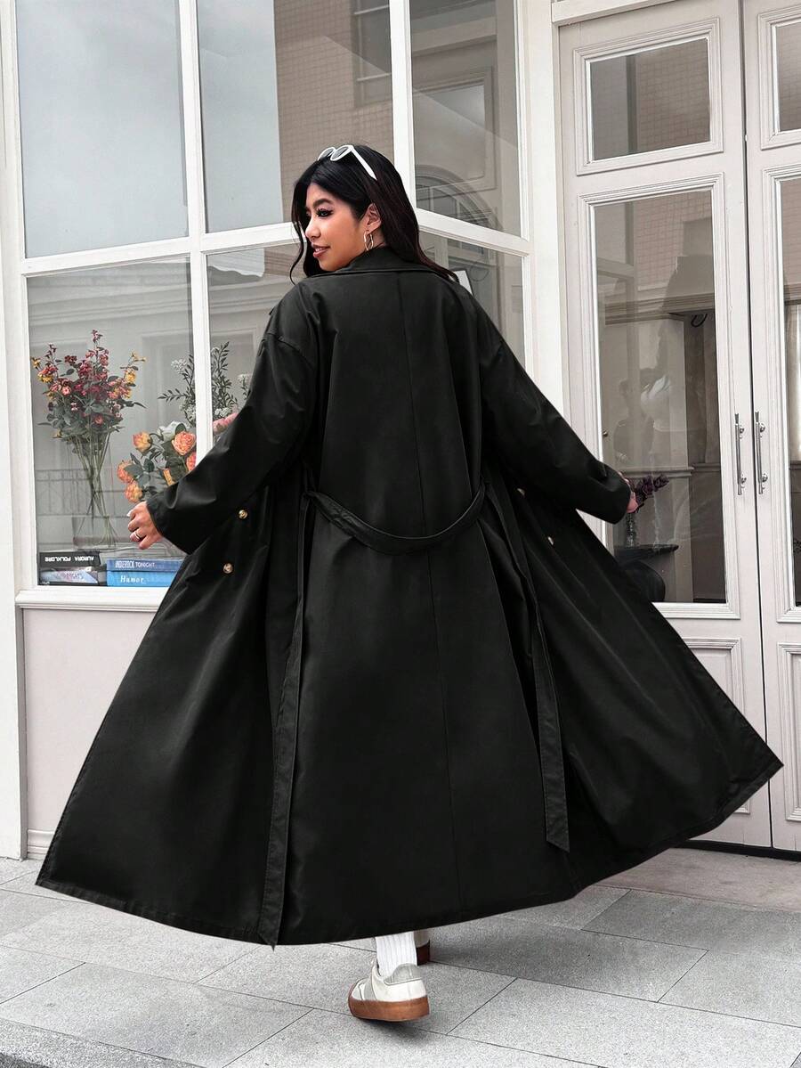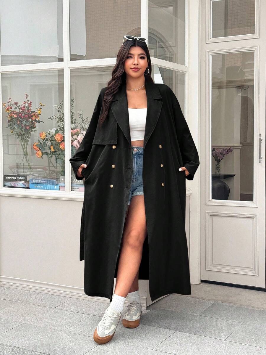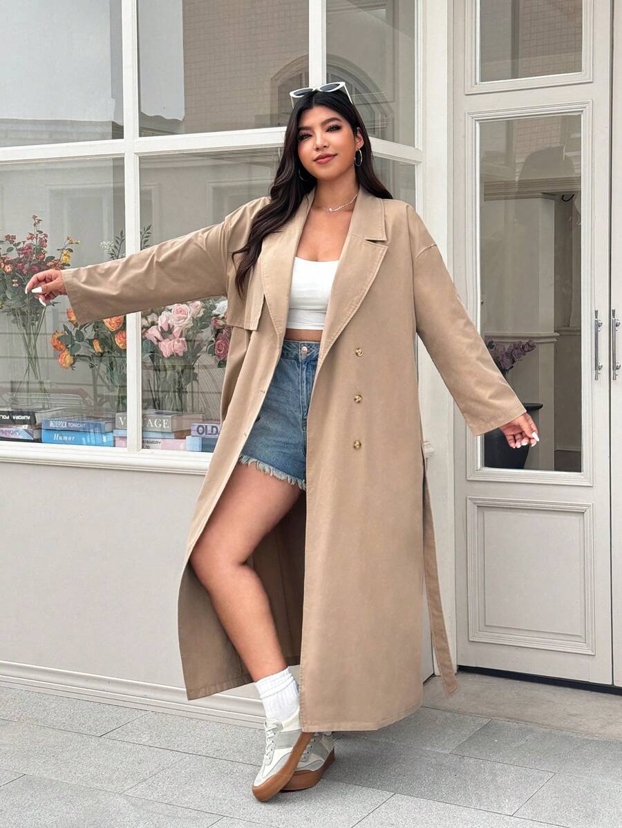 Abrigo de trinchera de doble botonadura de unicolor casual para mujer talla grande, otono