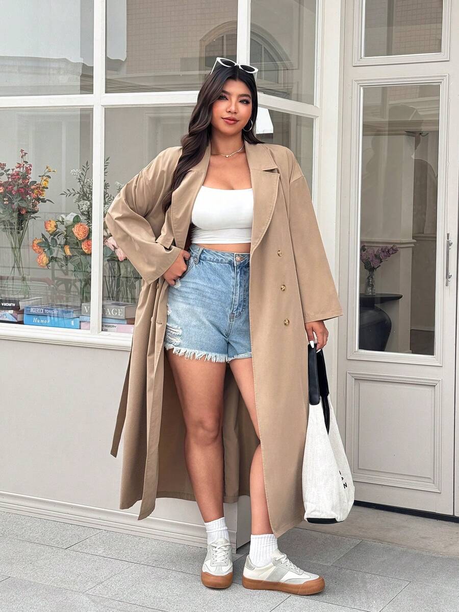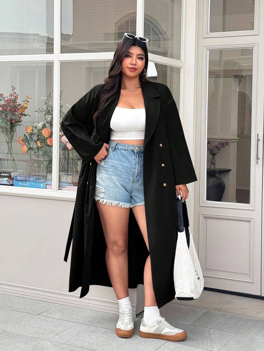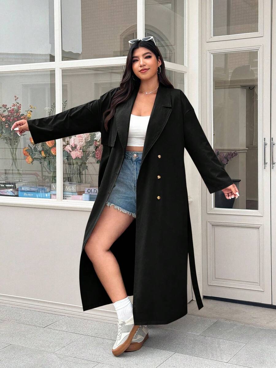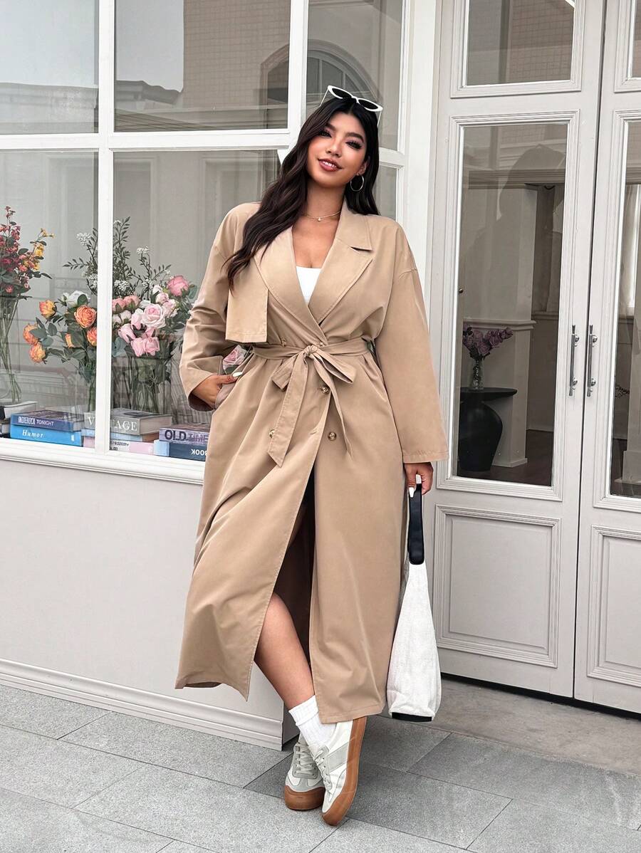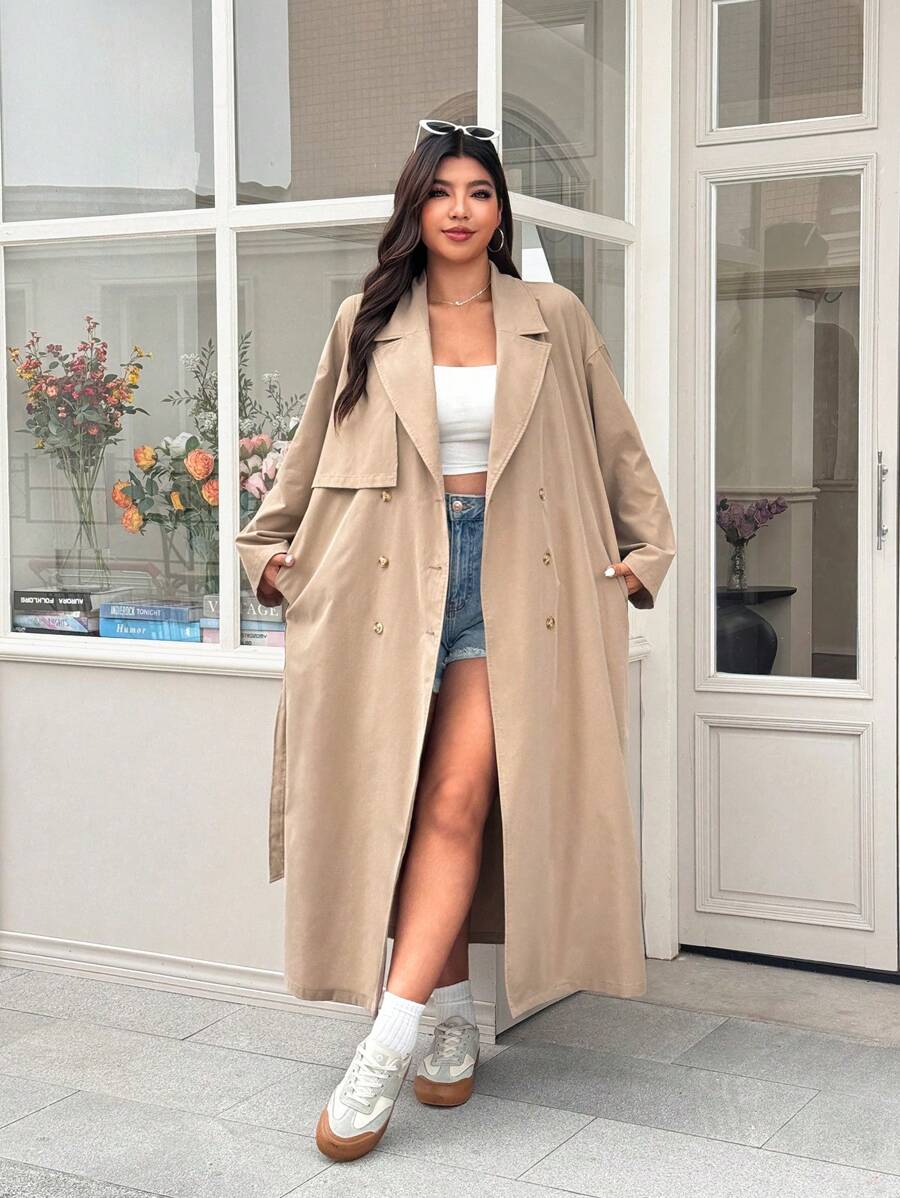 Abrigo de trinchera de doble botonadura de unicolor casual para mujer talla grande, otono