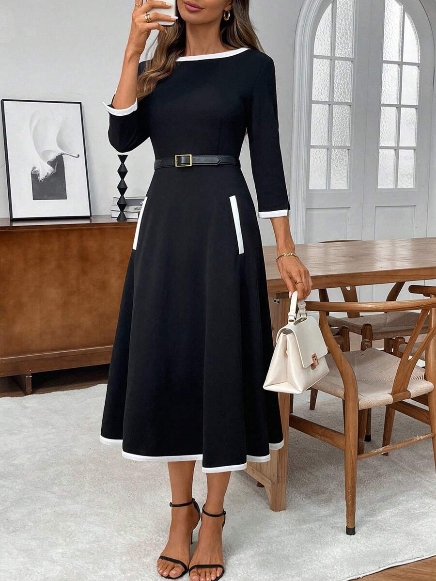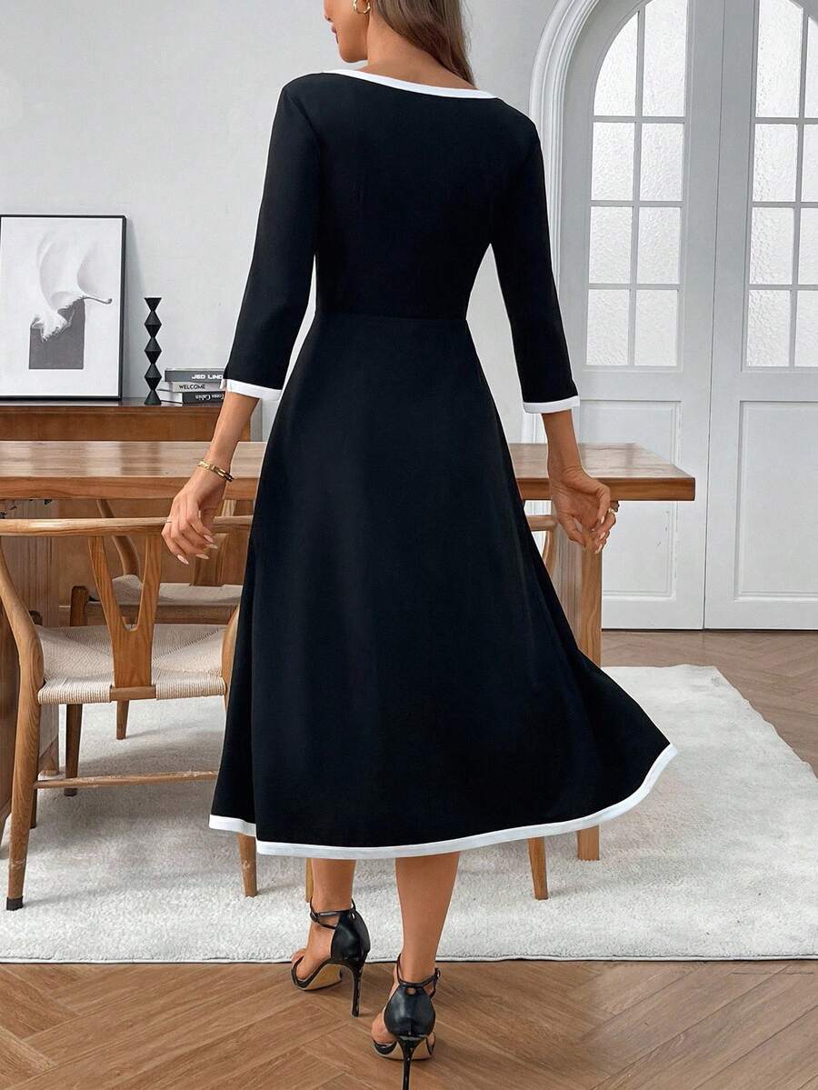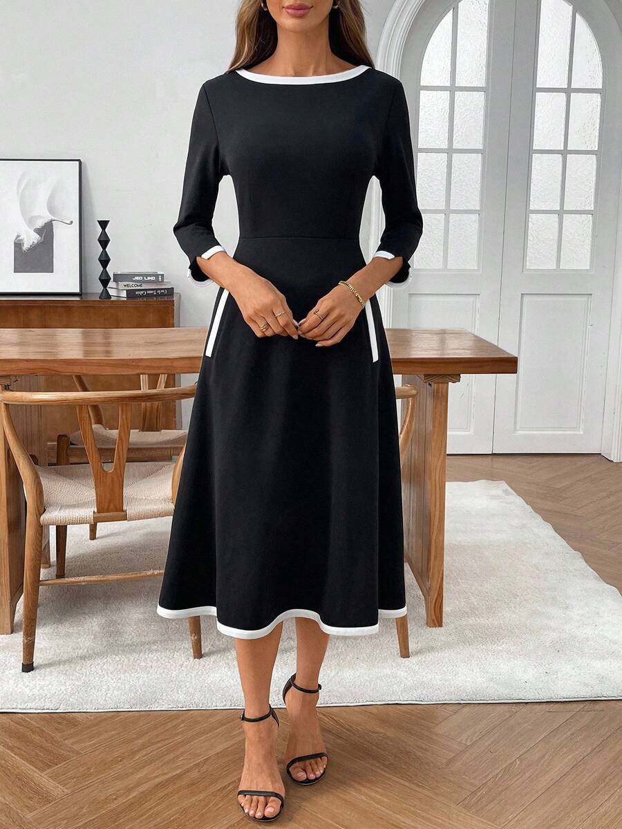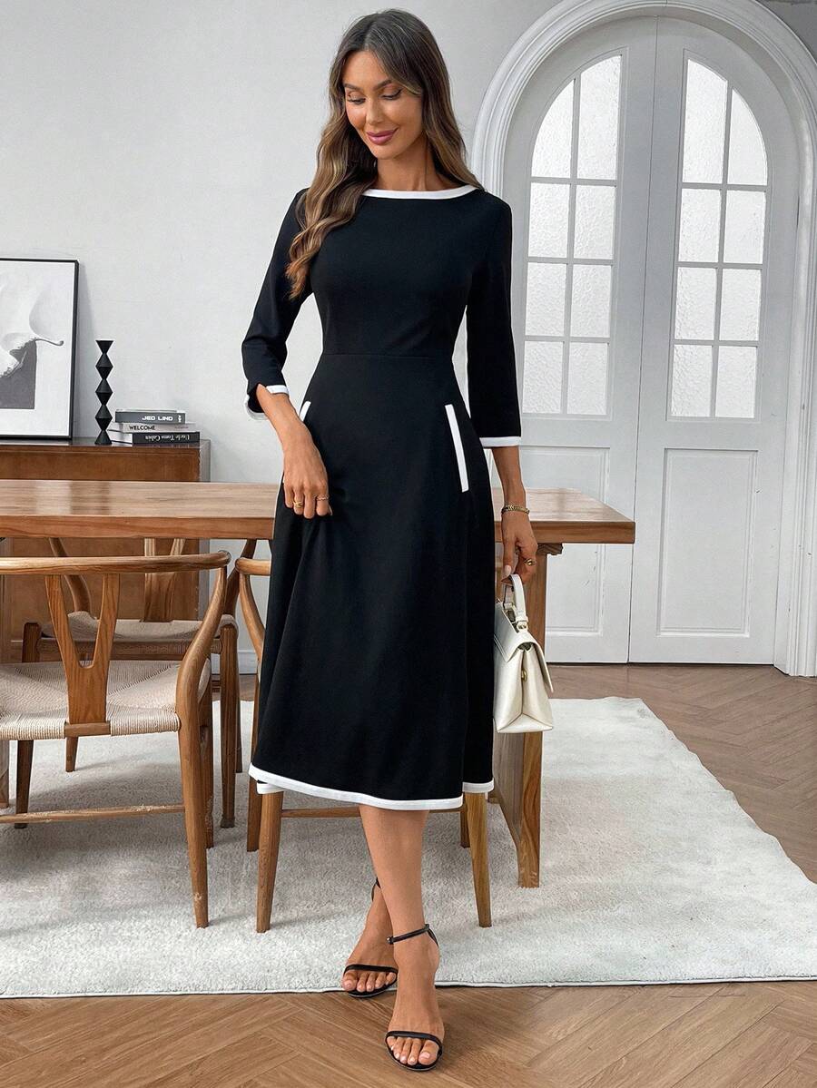 Vestido elegante de media manga con cuello redondo y bloque de color para uso diario
