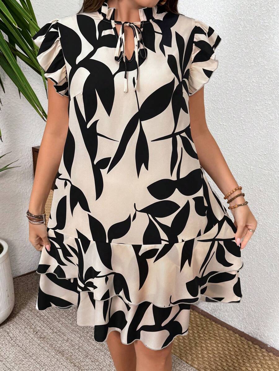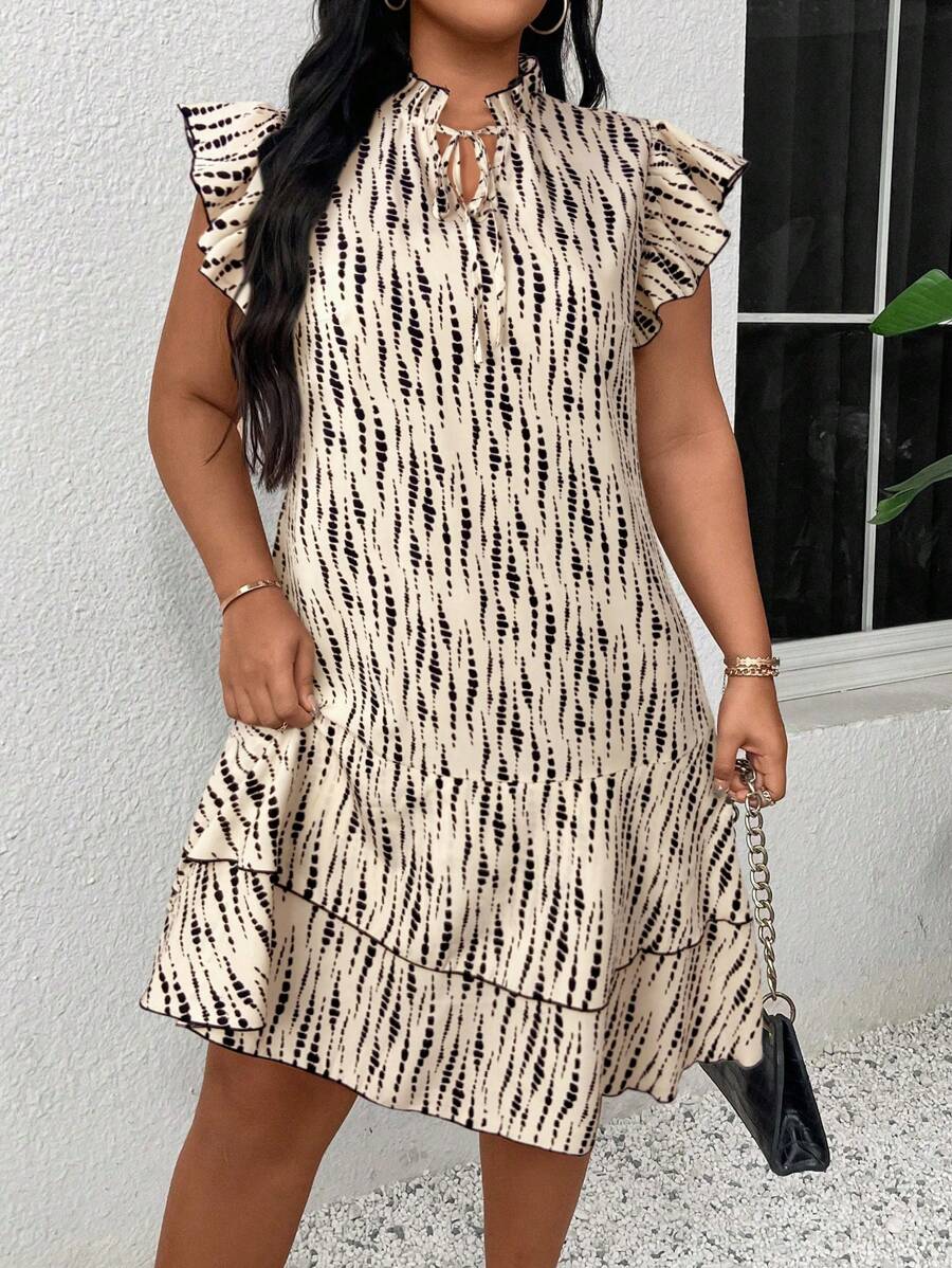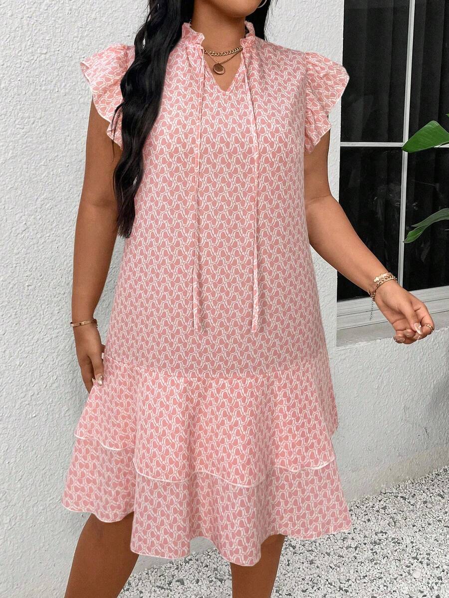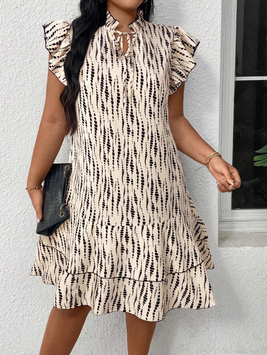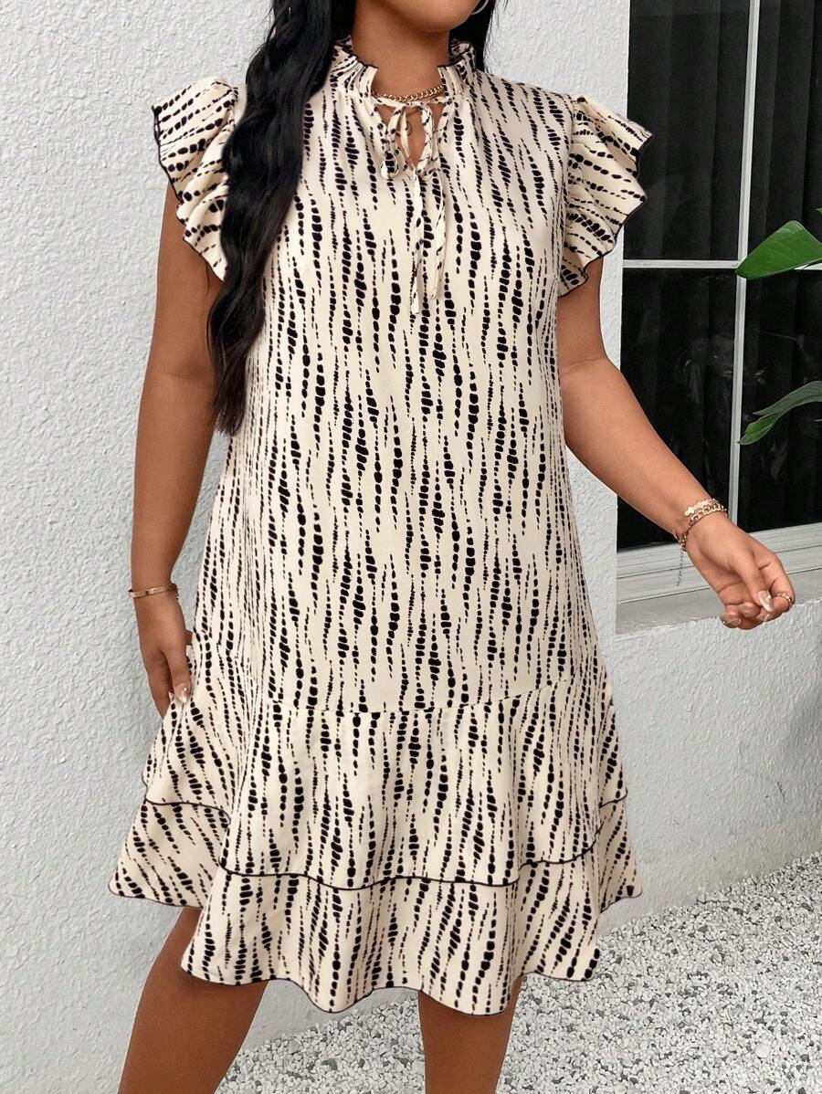Vestido casual con estampado, manga corta, cuello con lazo y volantes en el bajo para mujer talla grande