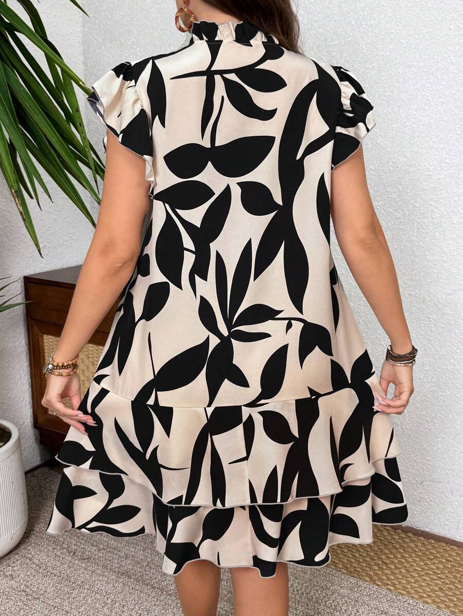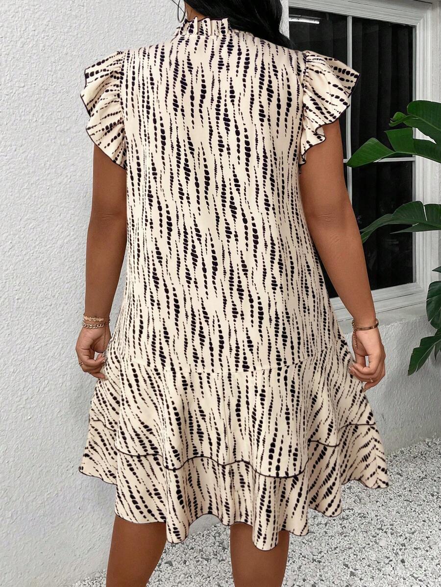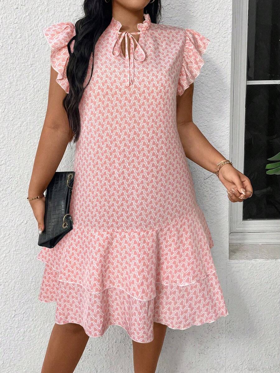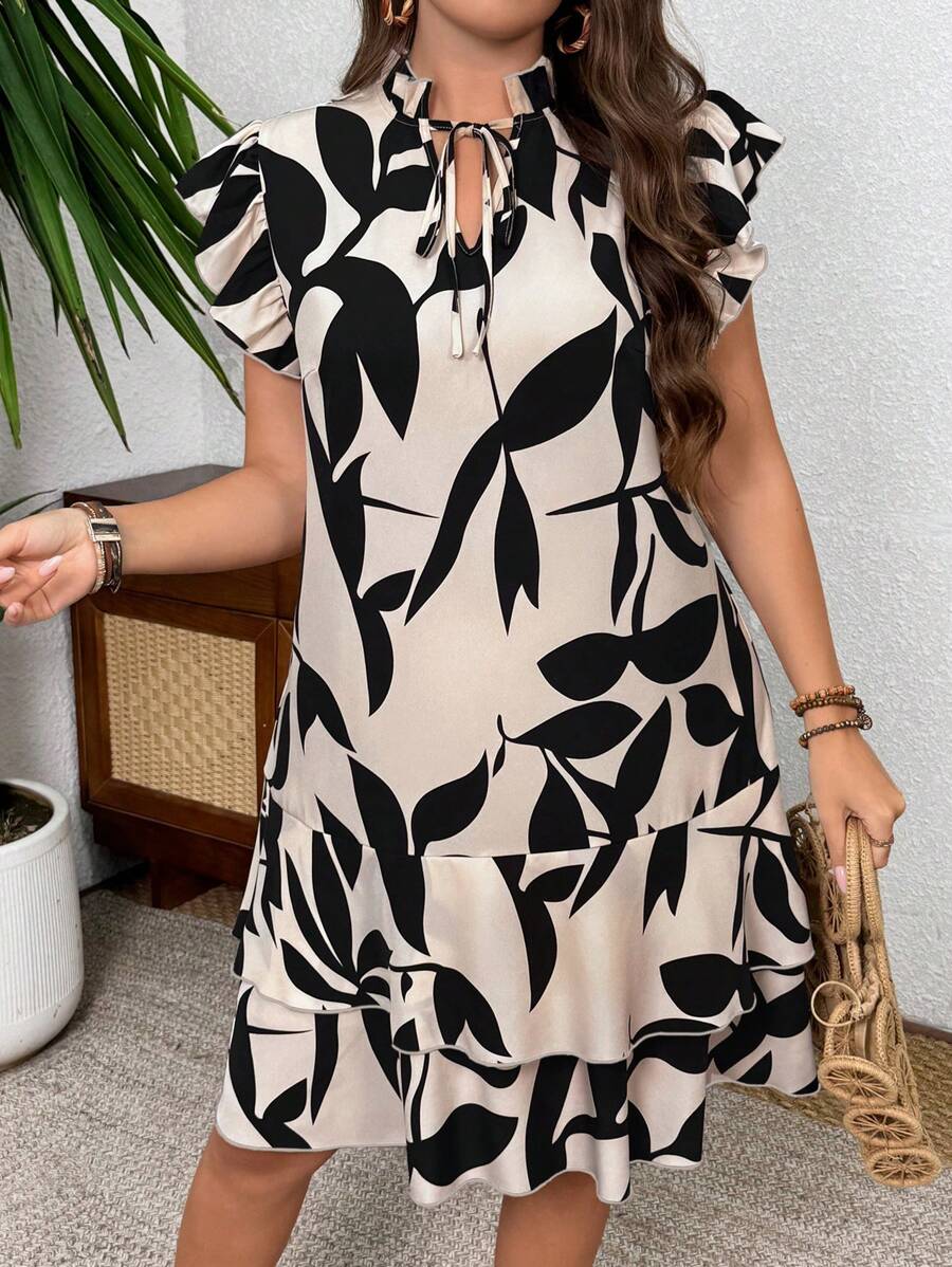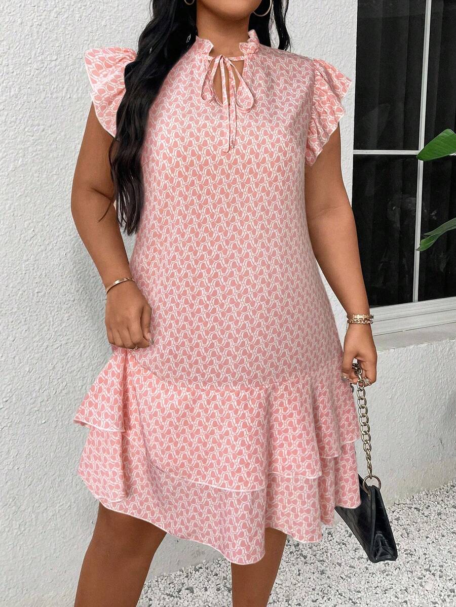 Vestido casual con estampado, manga corta, cuello con lazo y volantes en el bajo para mujer talla grande