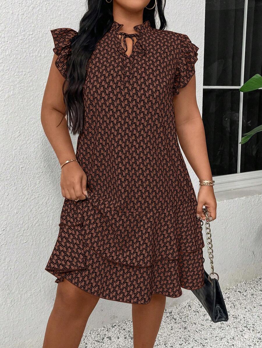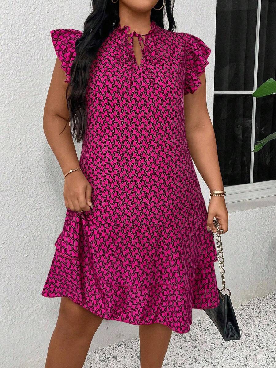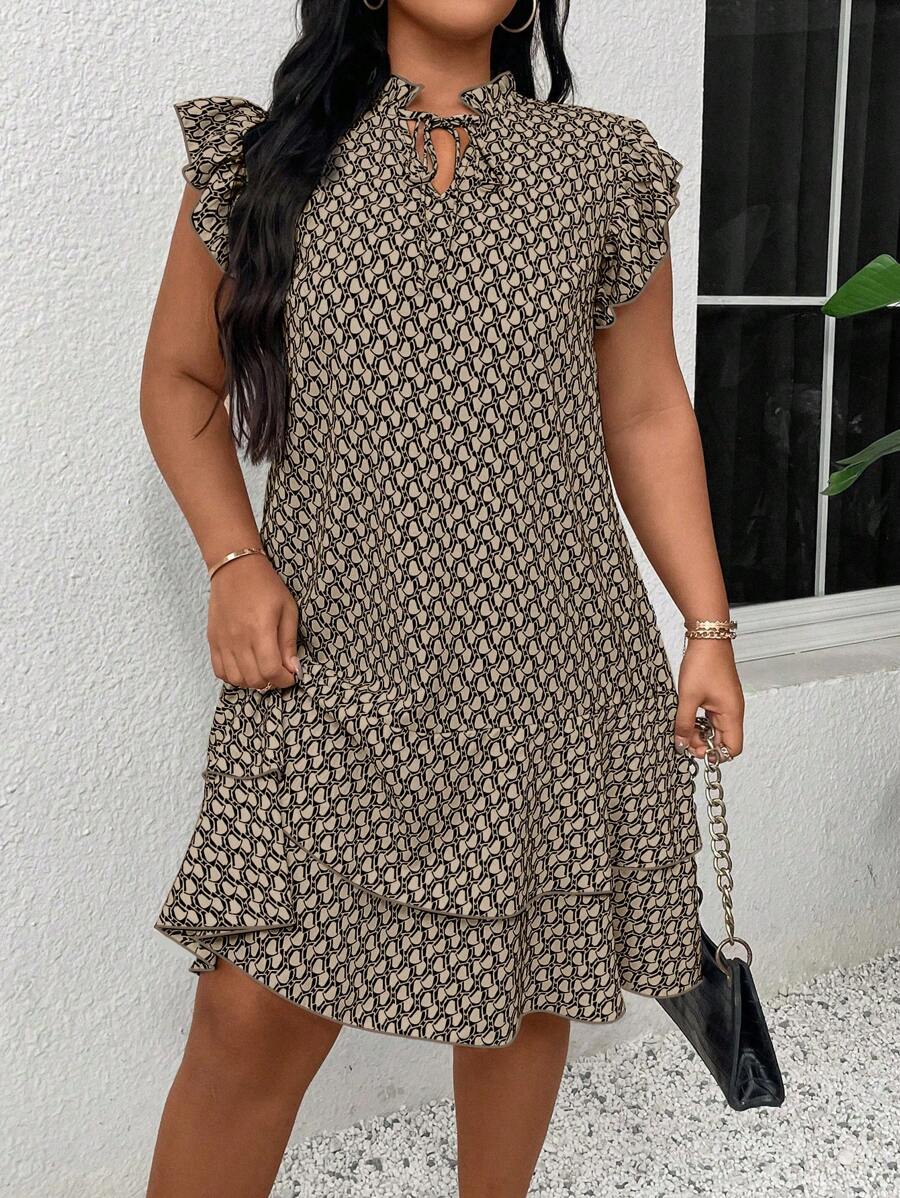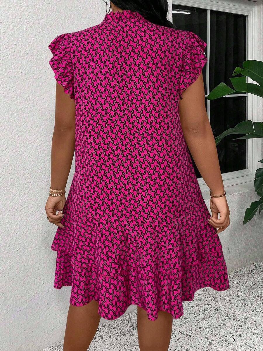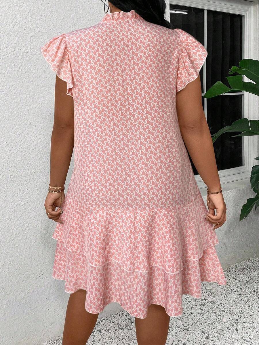 Vestido casual con estampado, manga corta, cuello con lazo y volantes en el bajo para mujer talla grande