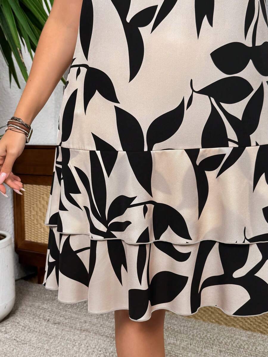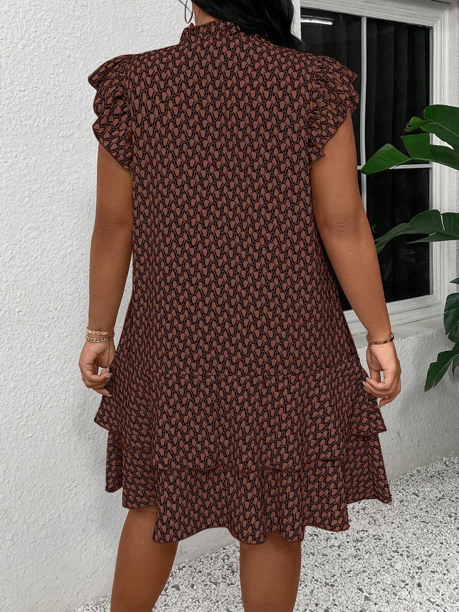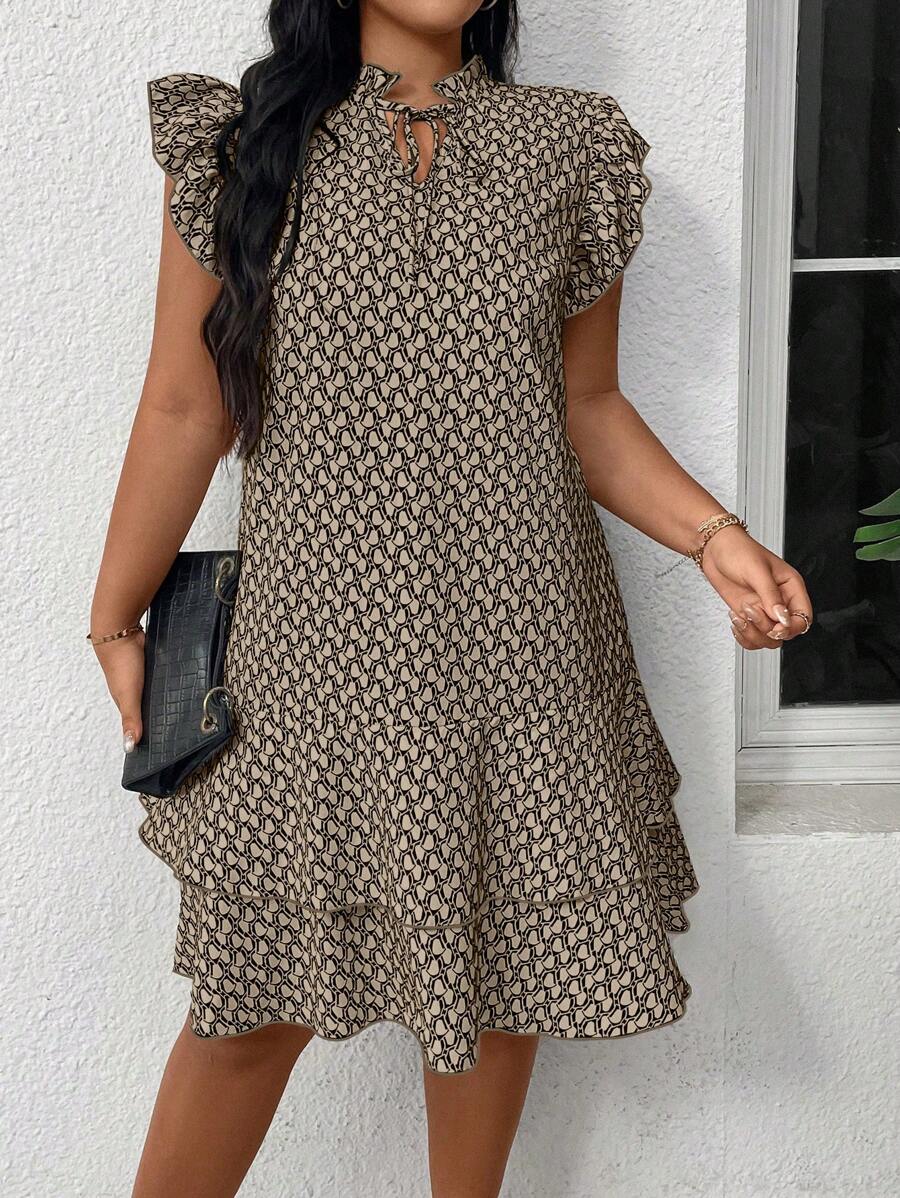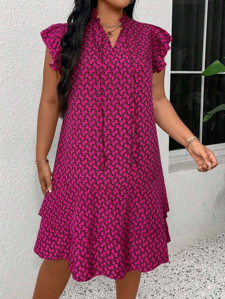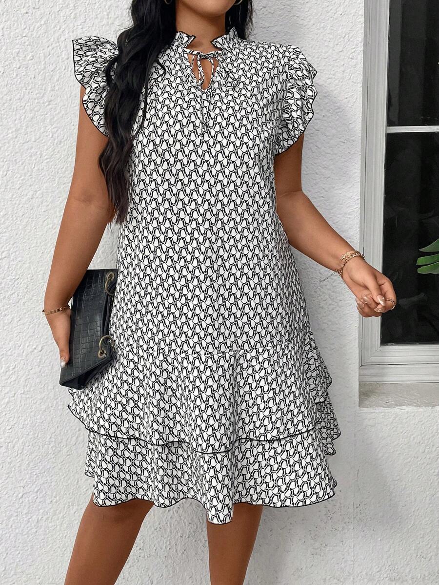 Vestido casual con estampado, manga corta, cuello con lazo y volantes en el bajo para mujer talla grande