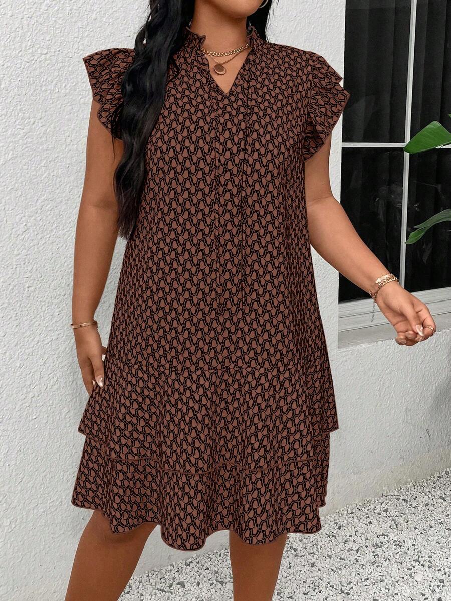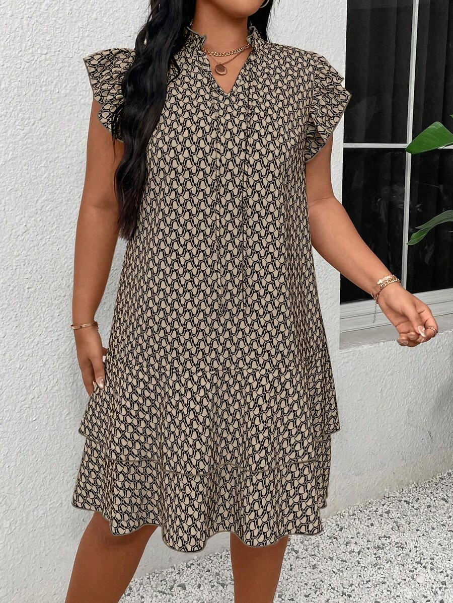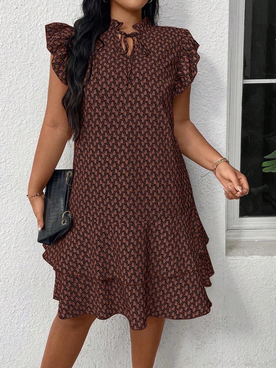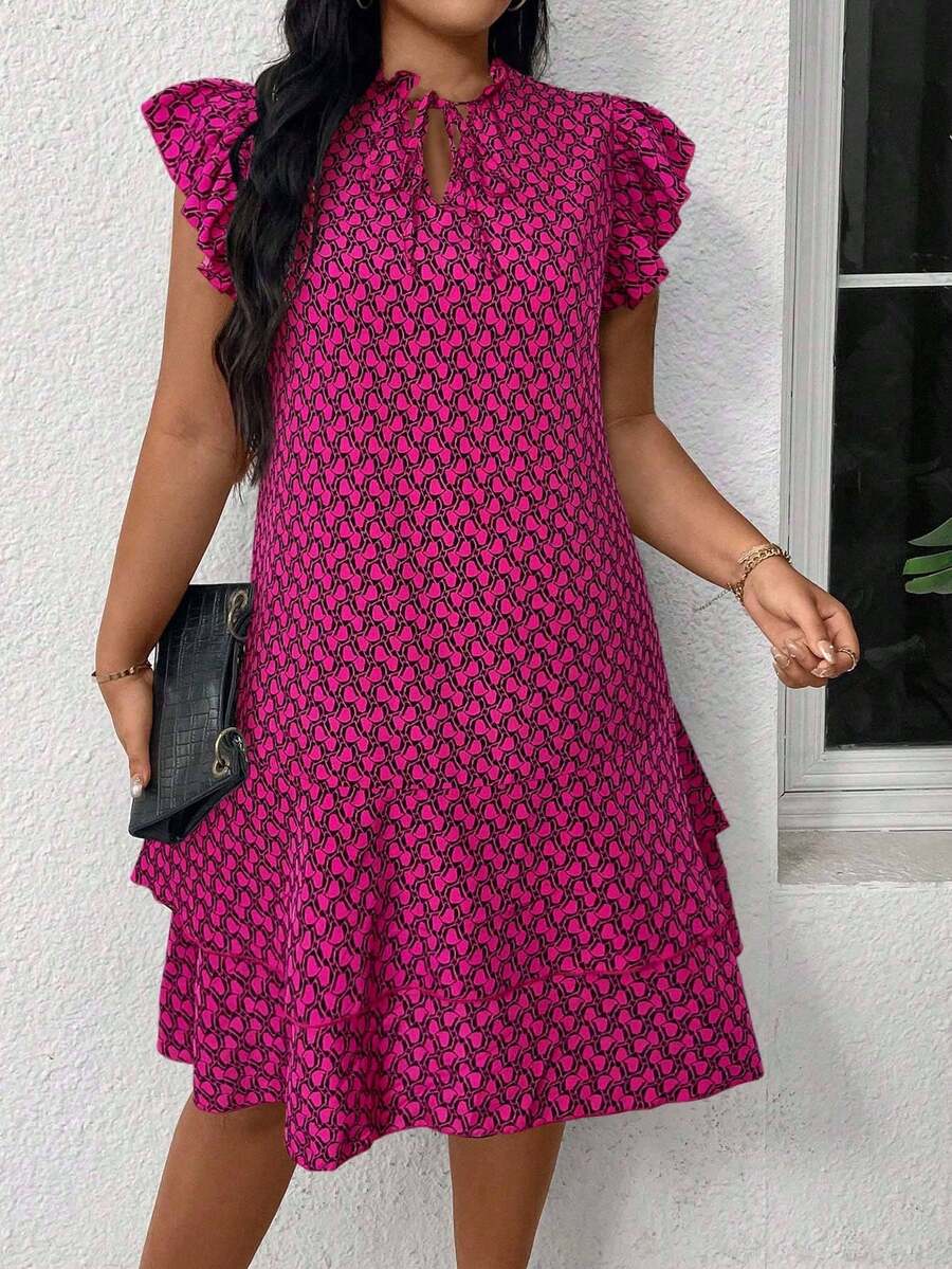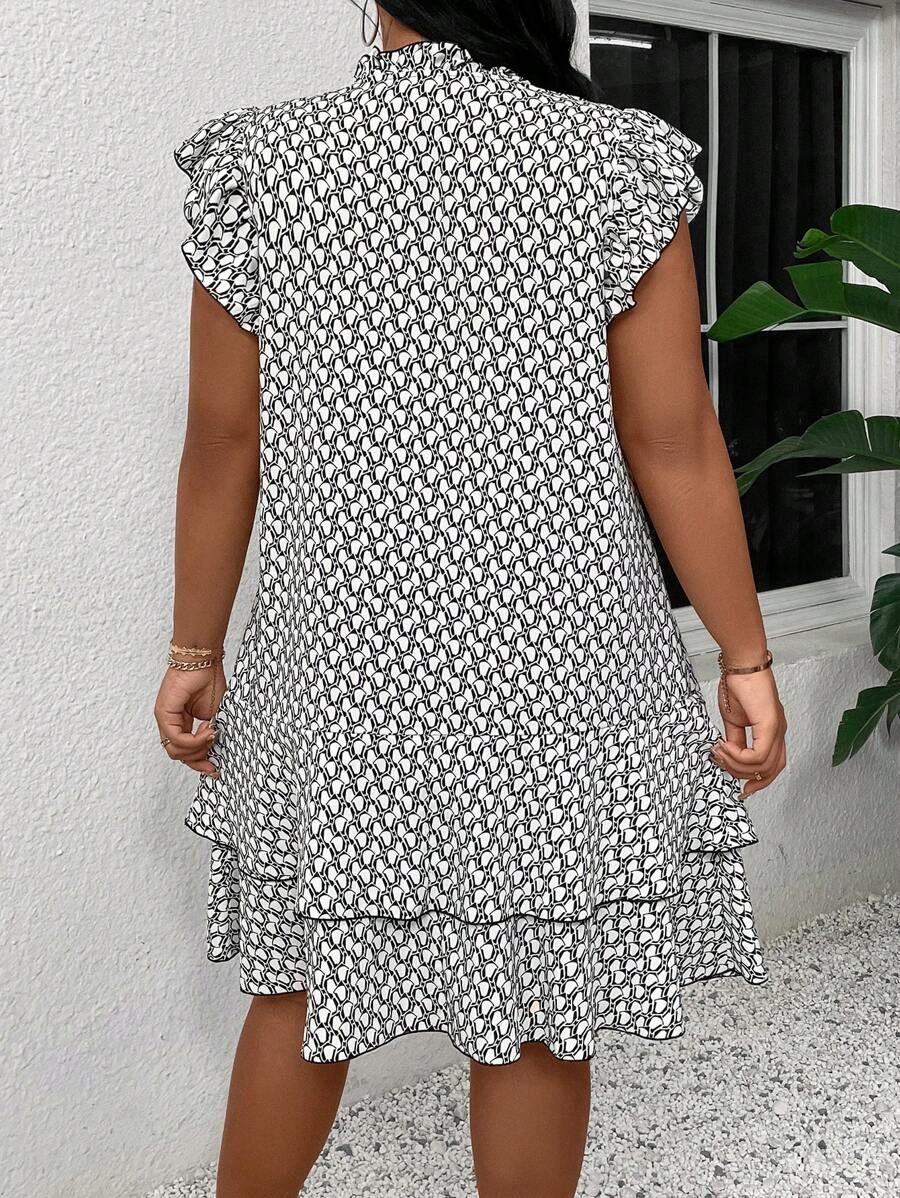 Vestido casual con estampado, manga corta, cuello con lazo y volantes en el bajo para mujer talla grande