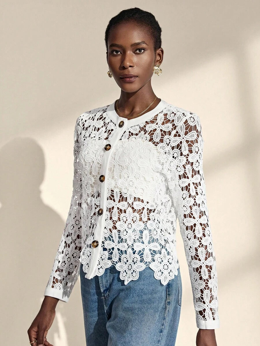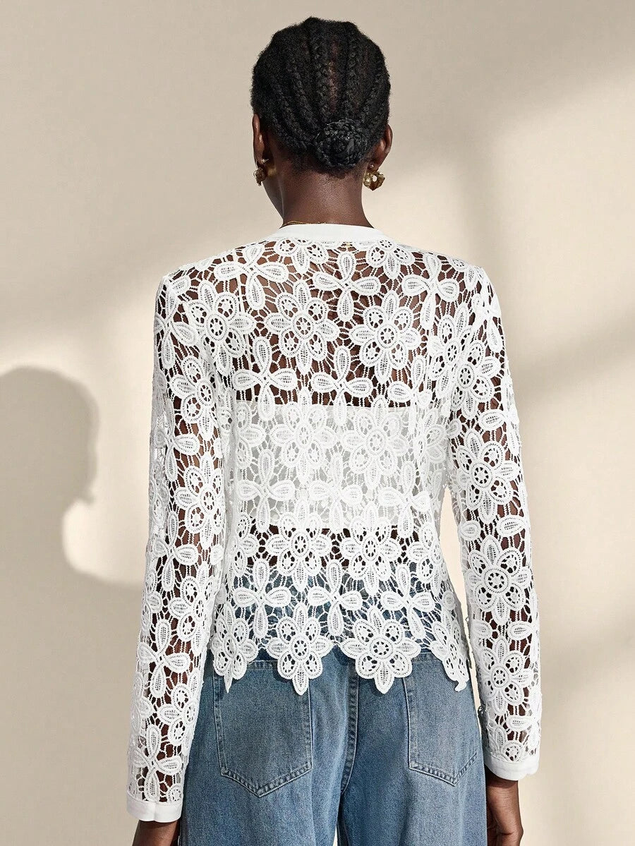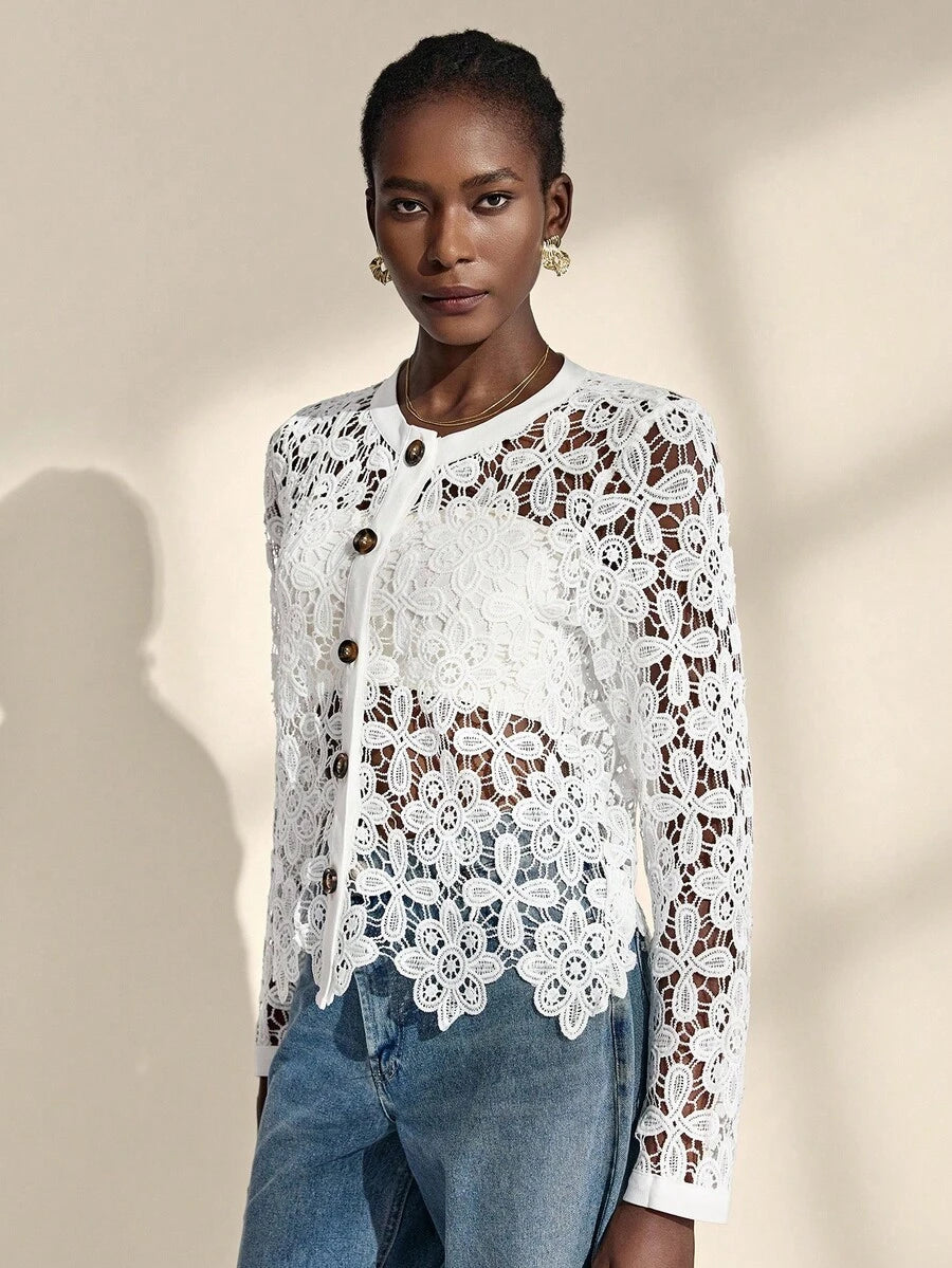 Almamuse chaqueta casual con cuello redondo, bordado blanco y calado para mujeres