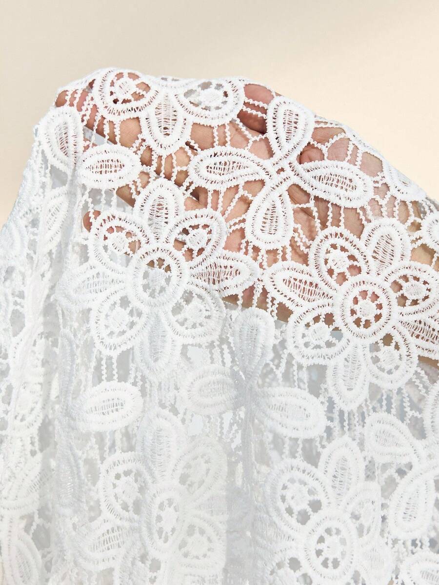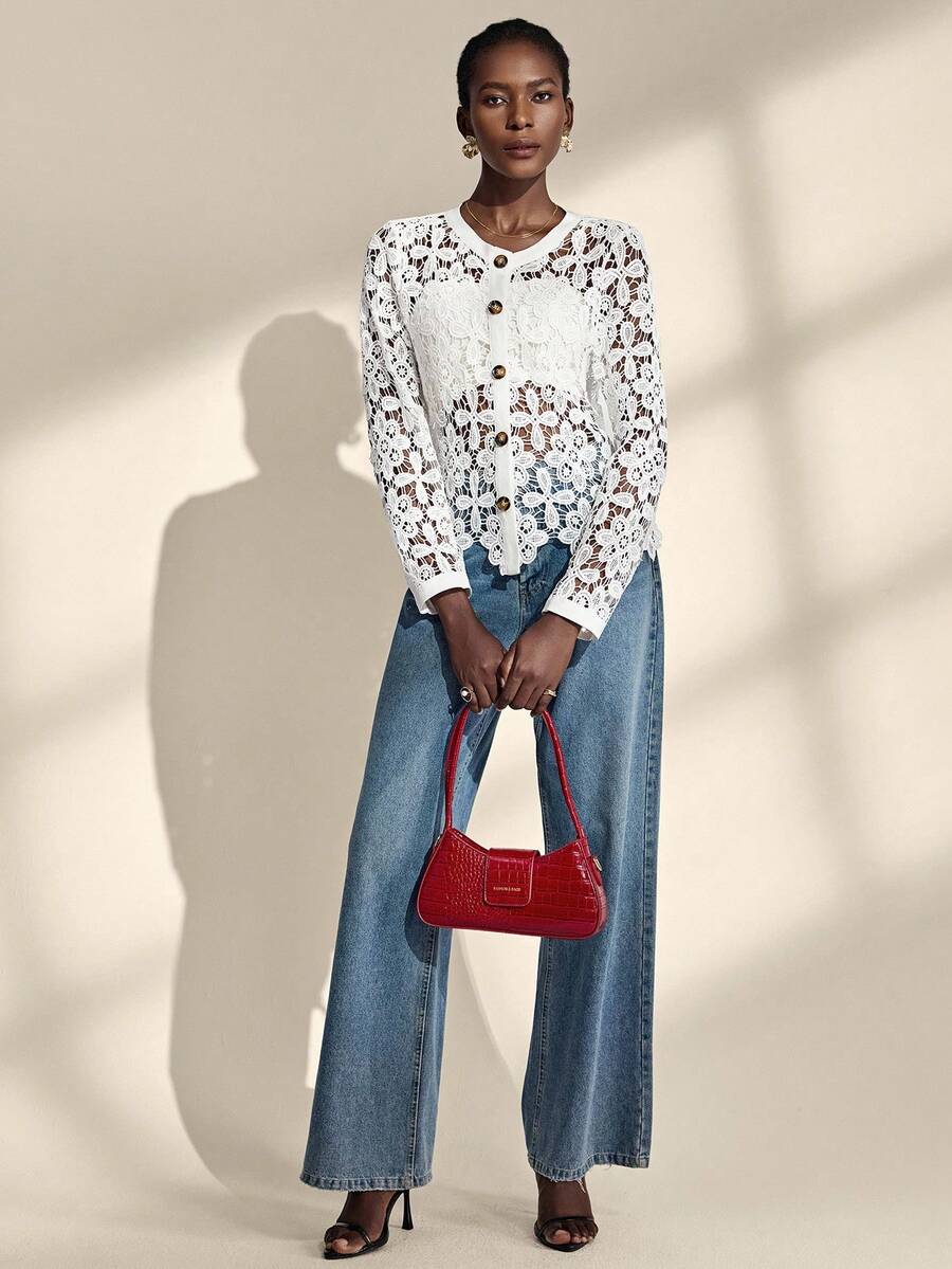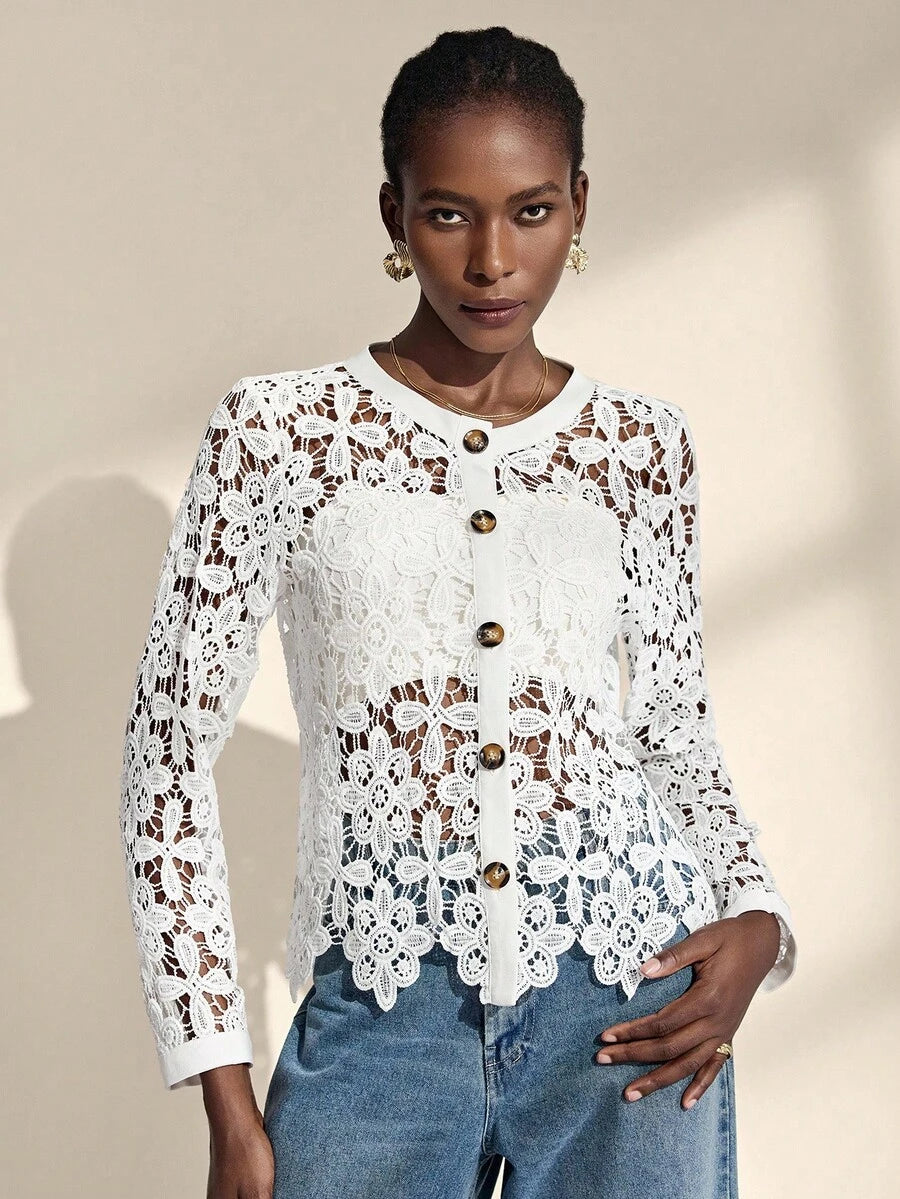 Almamuse chaqueta casual con cuello redondo, bordado blanco y calado para mujeres