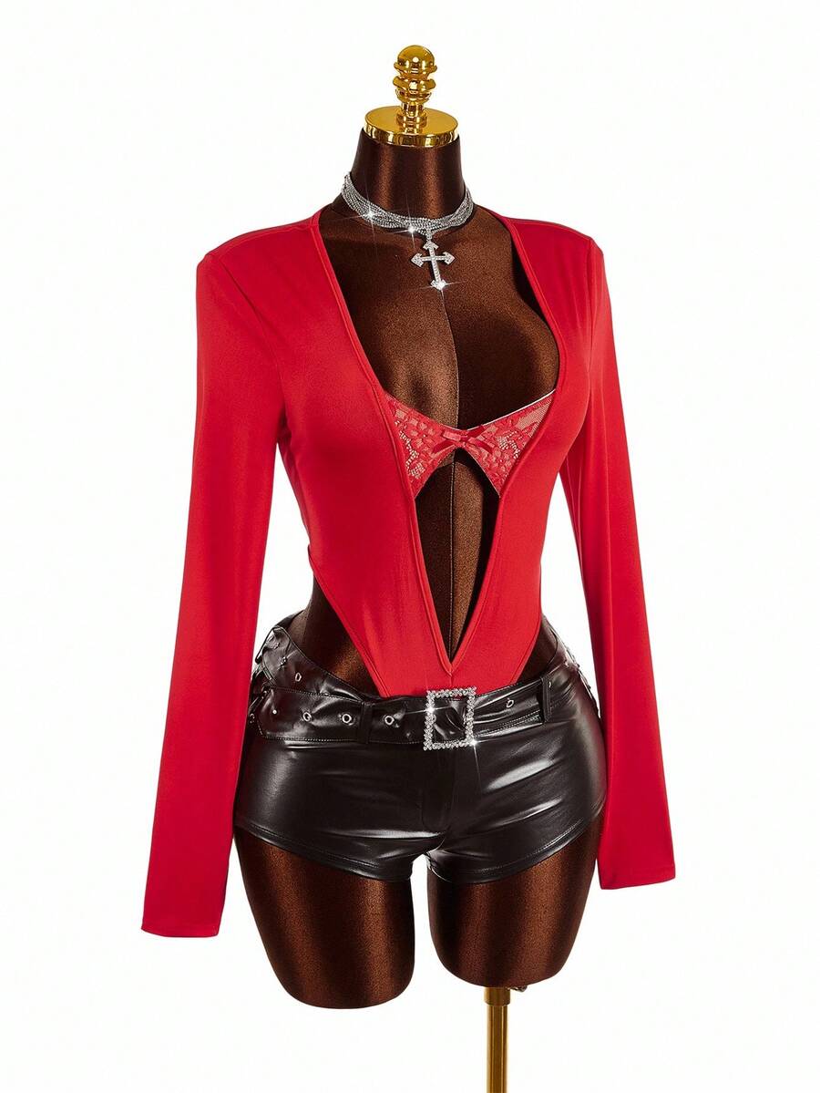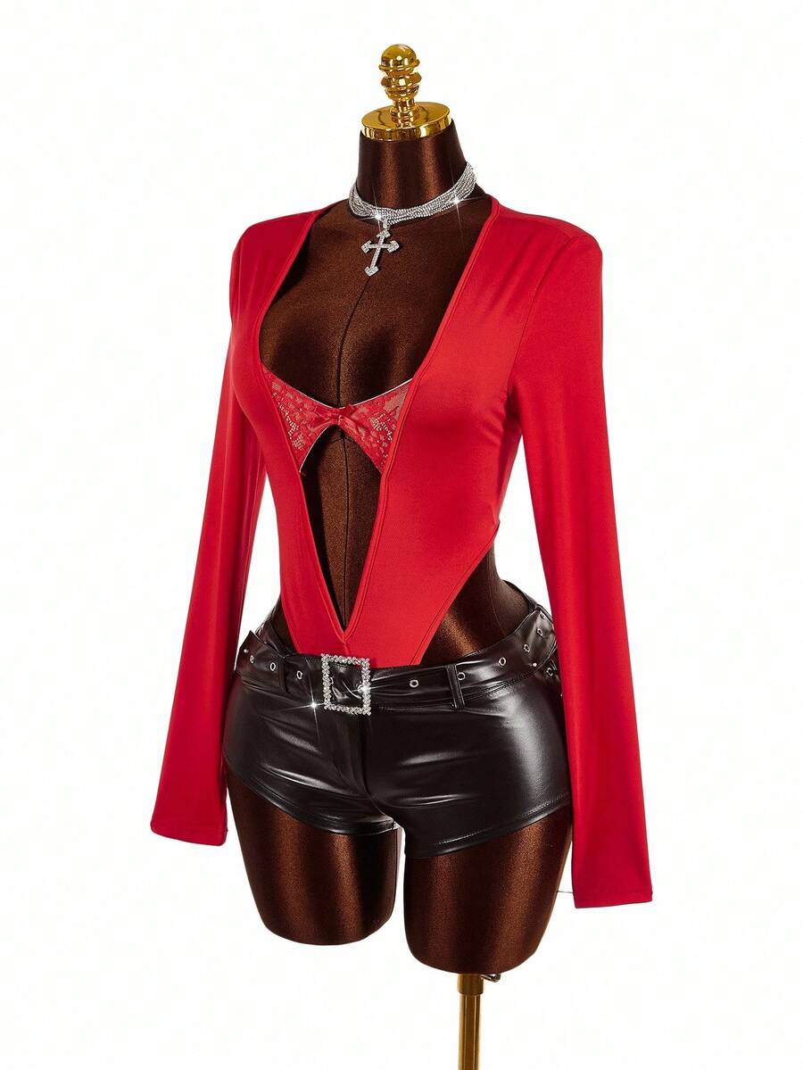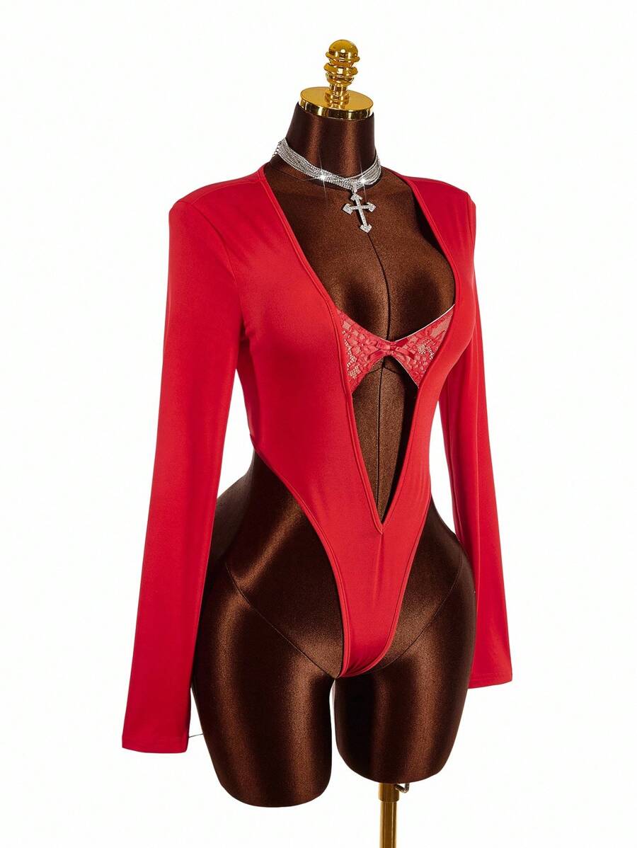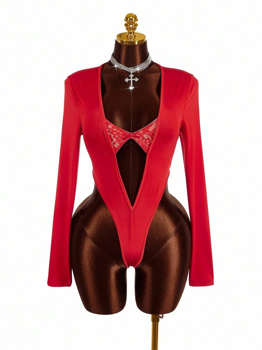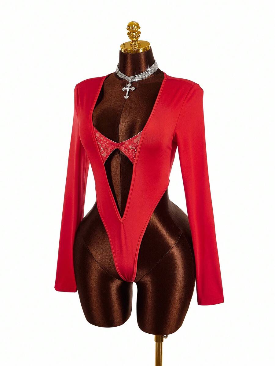 Amplova body de encaje con parches y escote profundo en v de moda para mujer de talla grande