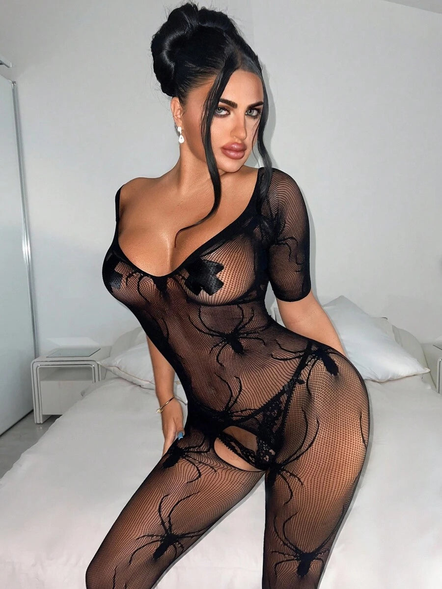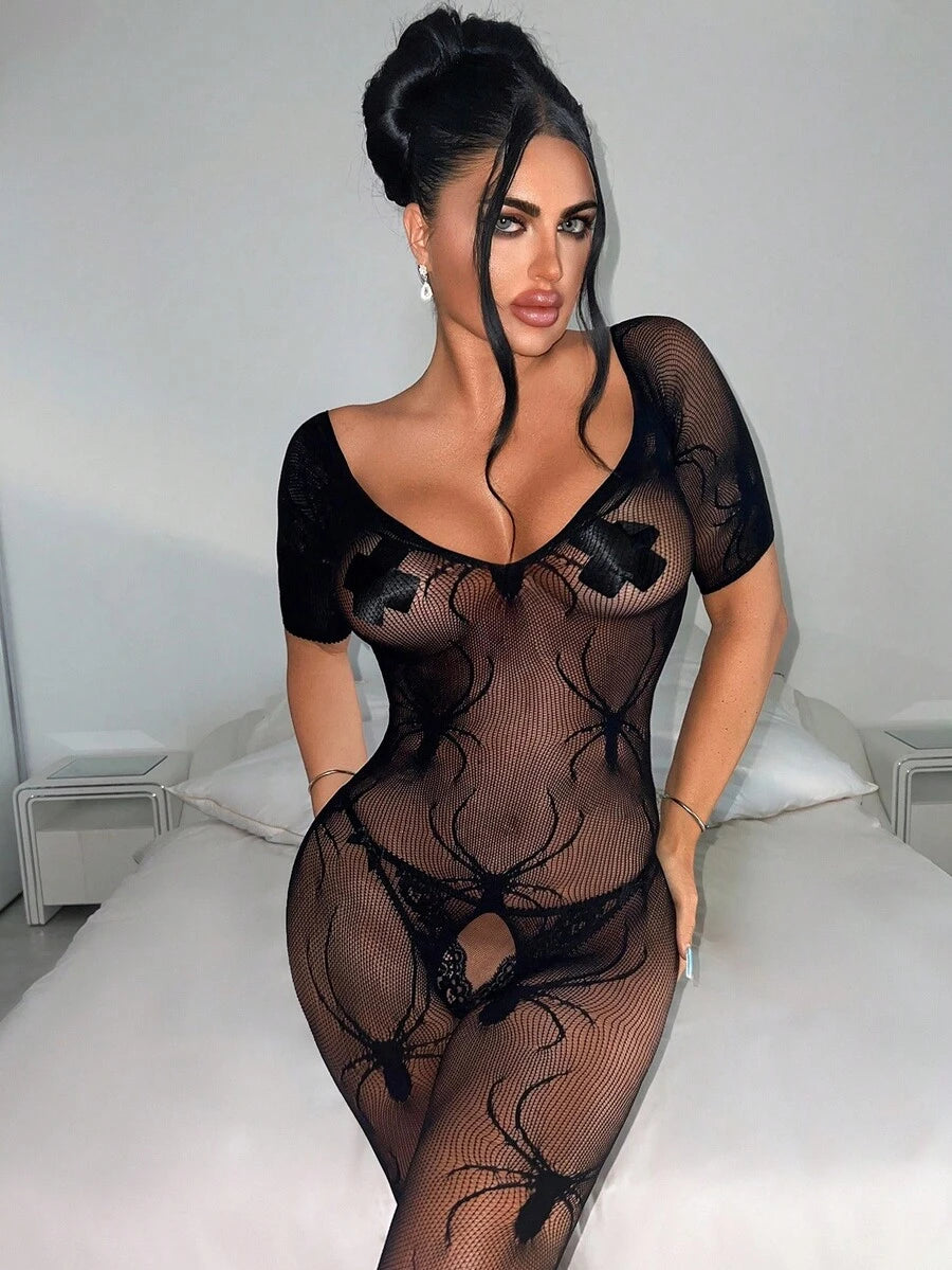 Classic sexy 1 pieza body de tela semitransparente y elastica, con diseno de telarana, talla grande, adecuado para fiestas, discotecas y festivales