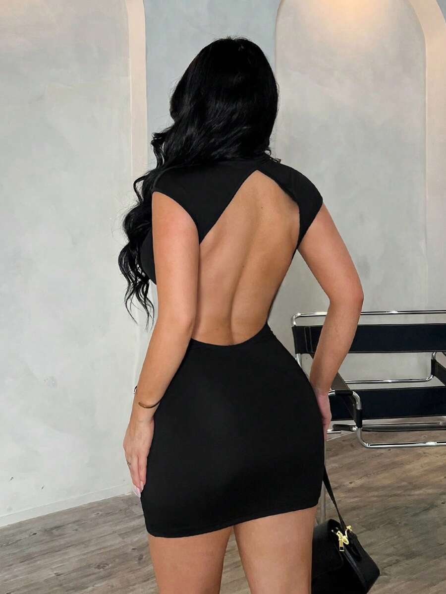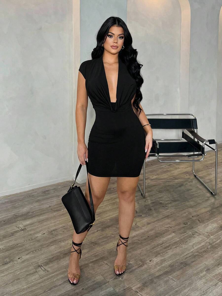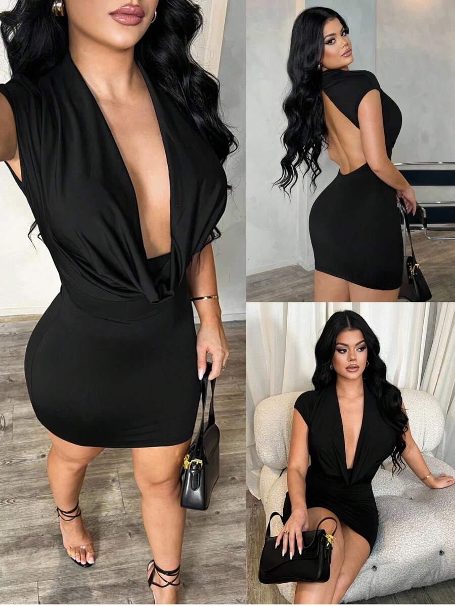 Vestido mini ajustado de mujer talla grande, elegante y sexy para uso diario, con escote pronunciado y espalda descubierta, en color negro. vestido de verano de mujer con cuello en v profundo y corte bajo.