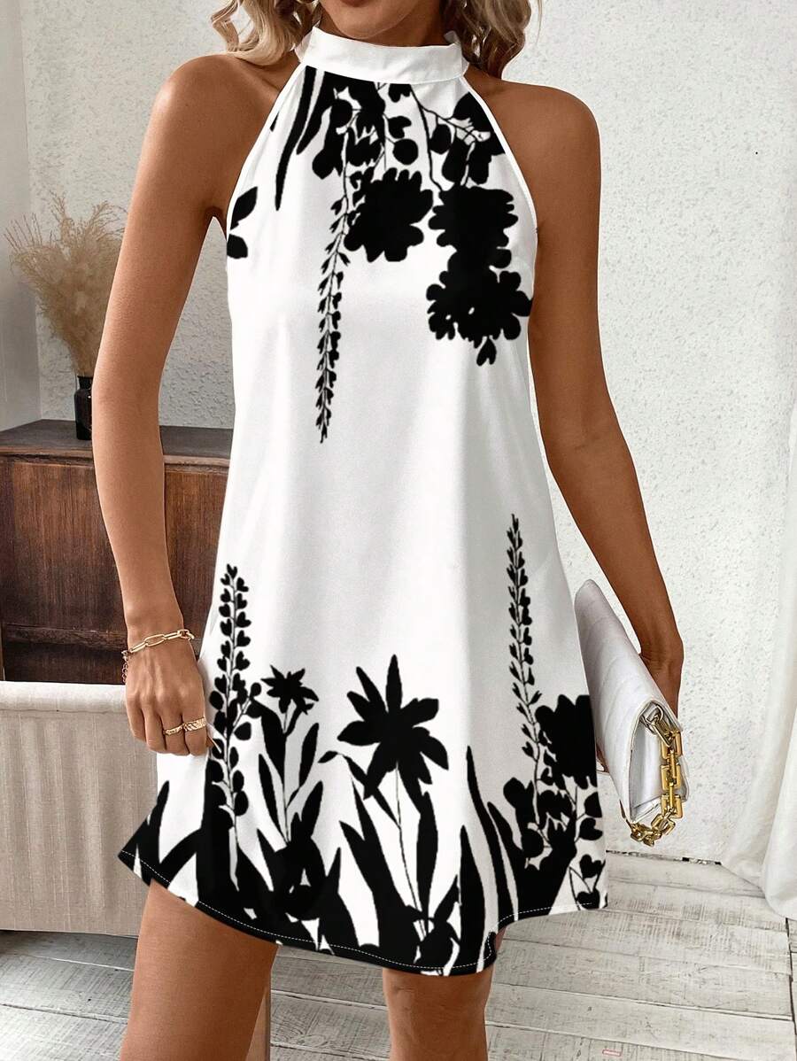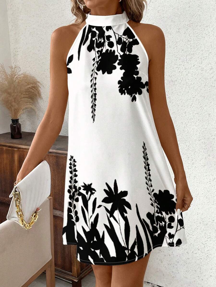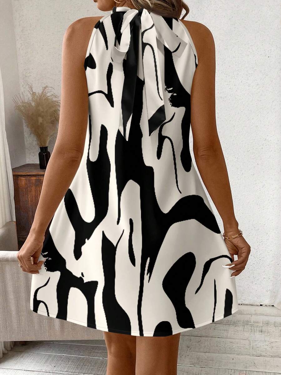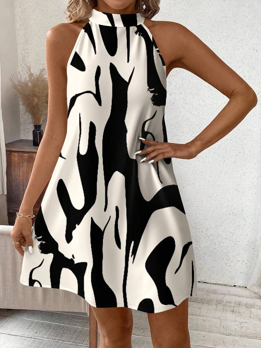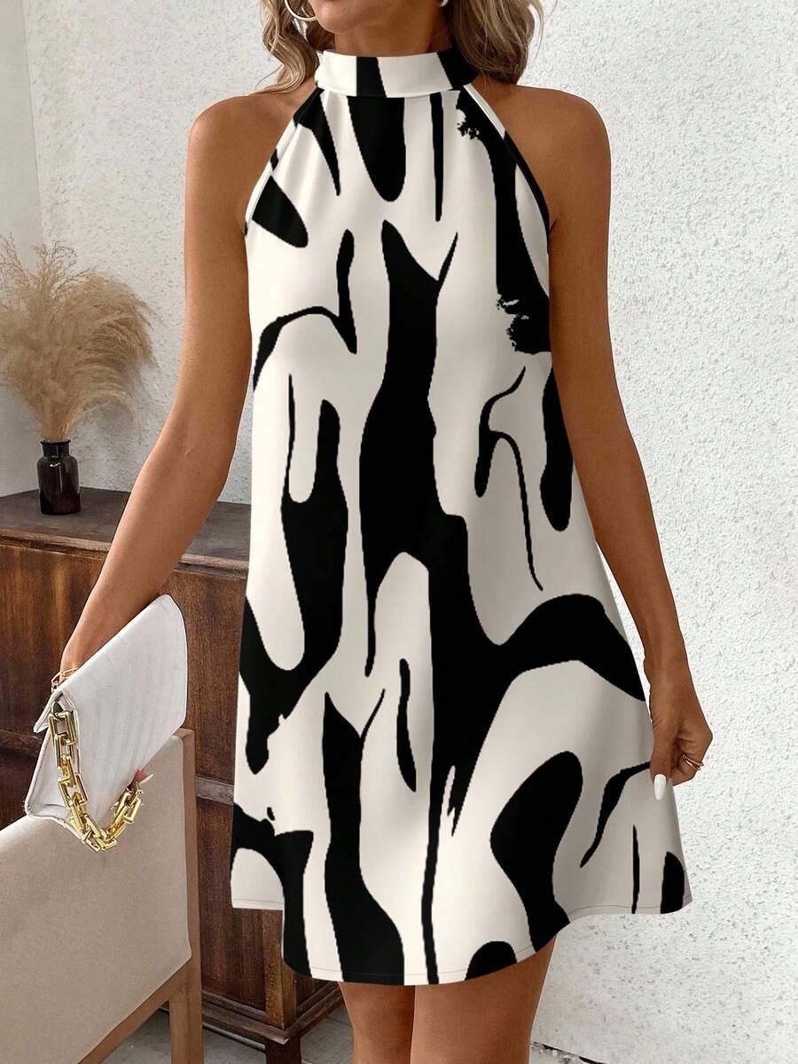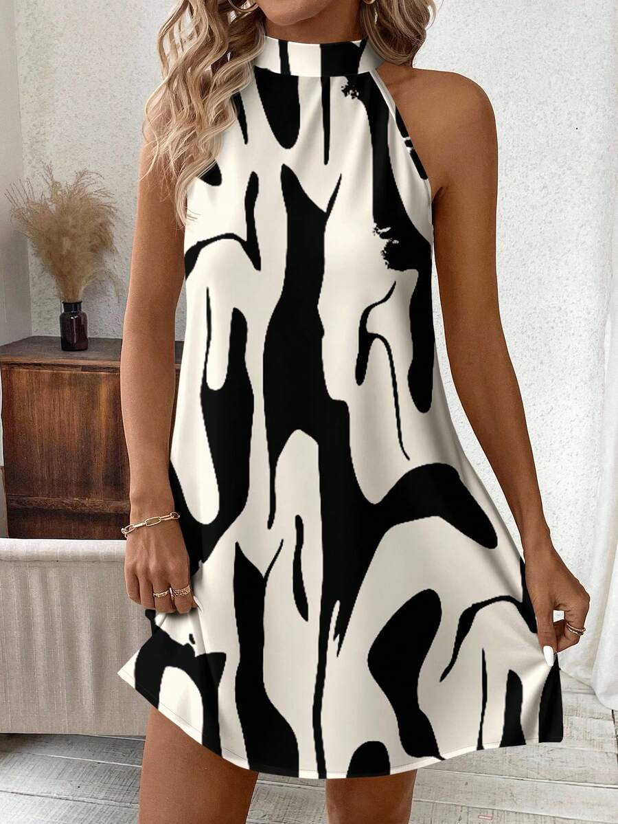 Vestido mini ajustado sin mangas con estampado geometrico en blanco y negro, elegante. adecuado para uso diario, atuendos de verano, vestidos casuales, vacaciones, estilo bohemio, salir, maestro, etc.