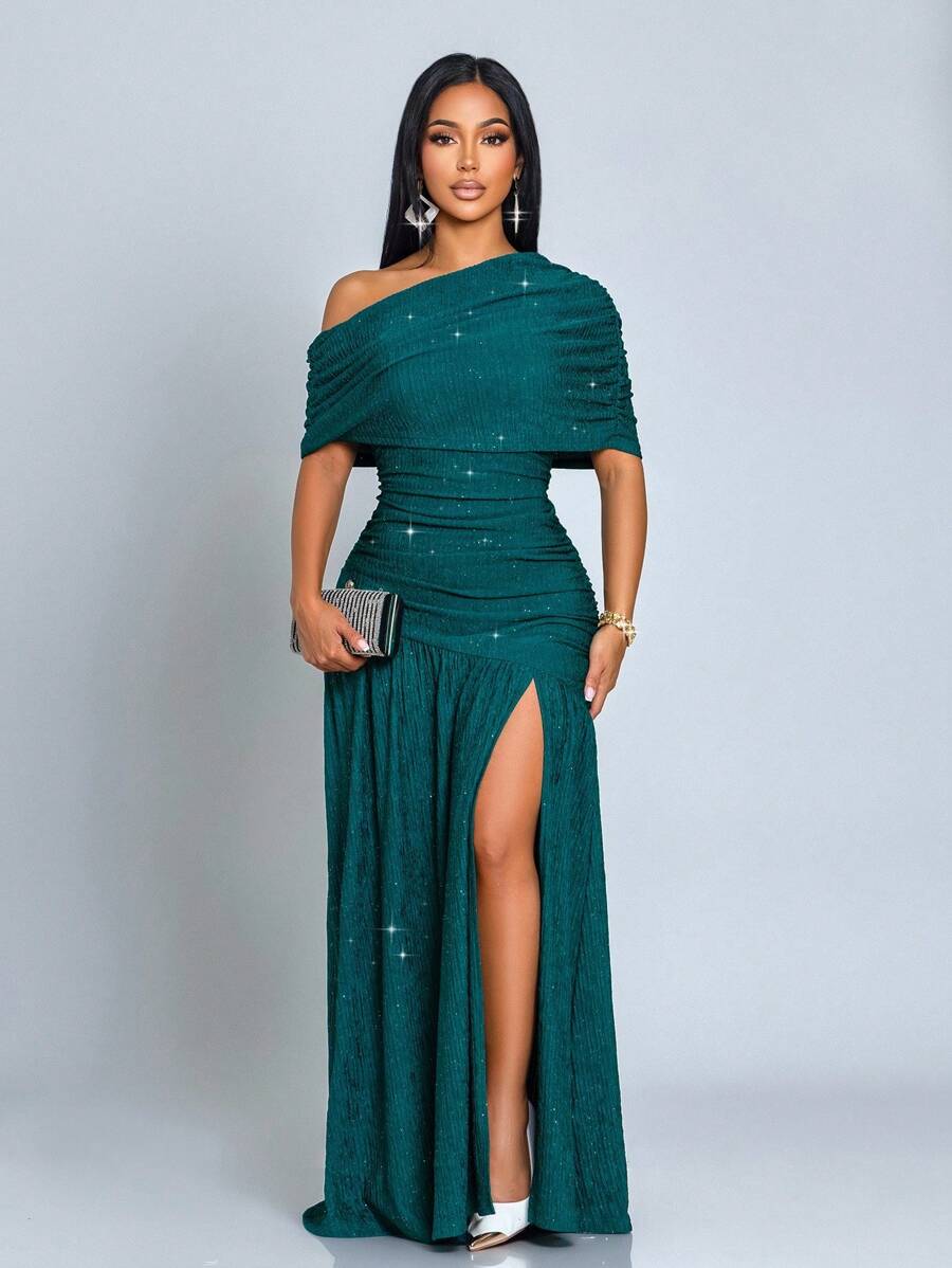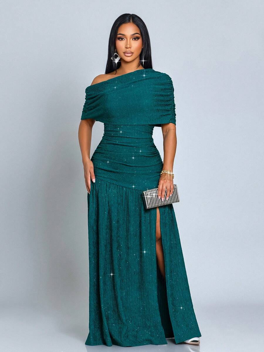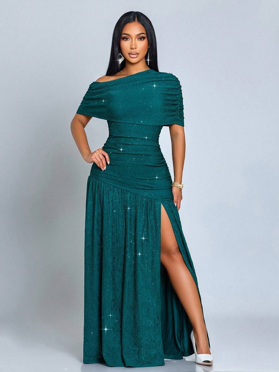 Vestido de punto largo con abertura frontal, cuello de un hombro recogido, tela brillante para uso casual, fiesta o vacaciones
