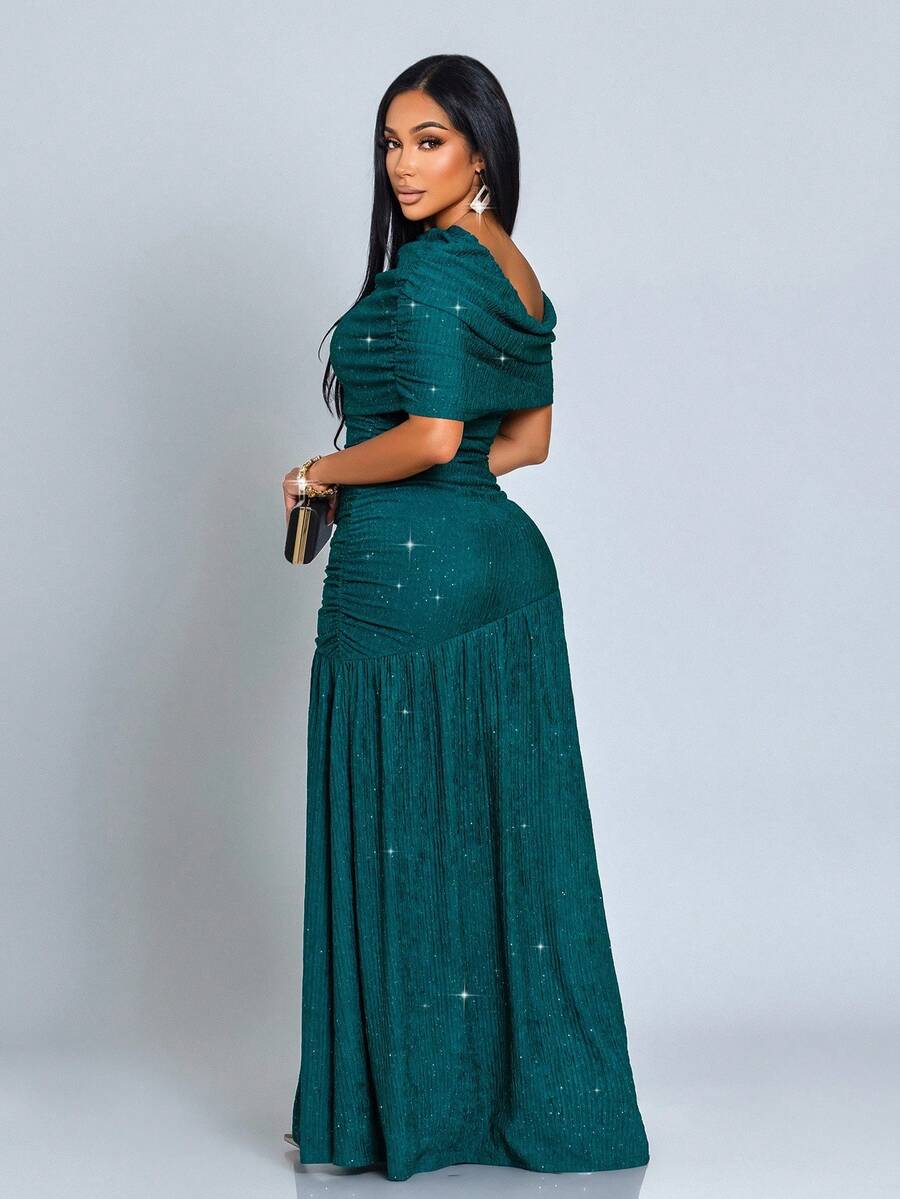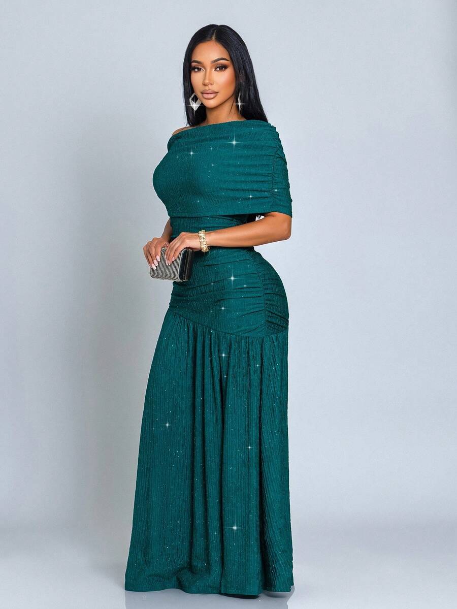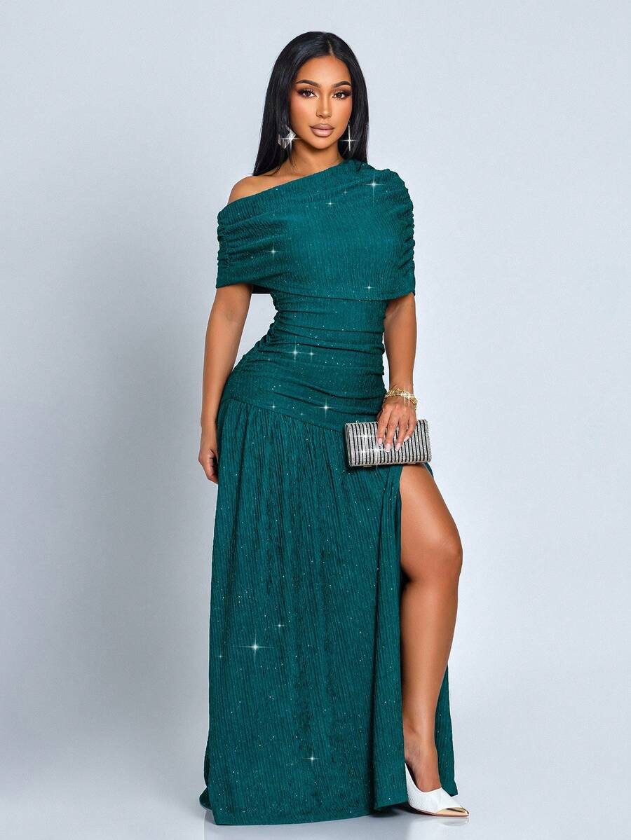 Vestido de punto largo con abertura frontal, cuello de un hombro recogido, tela brillante para uso casual, fiesta o vacaciones