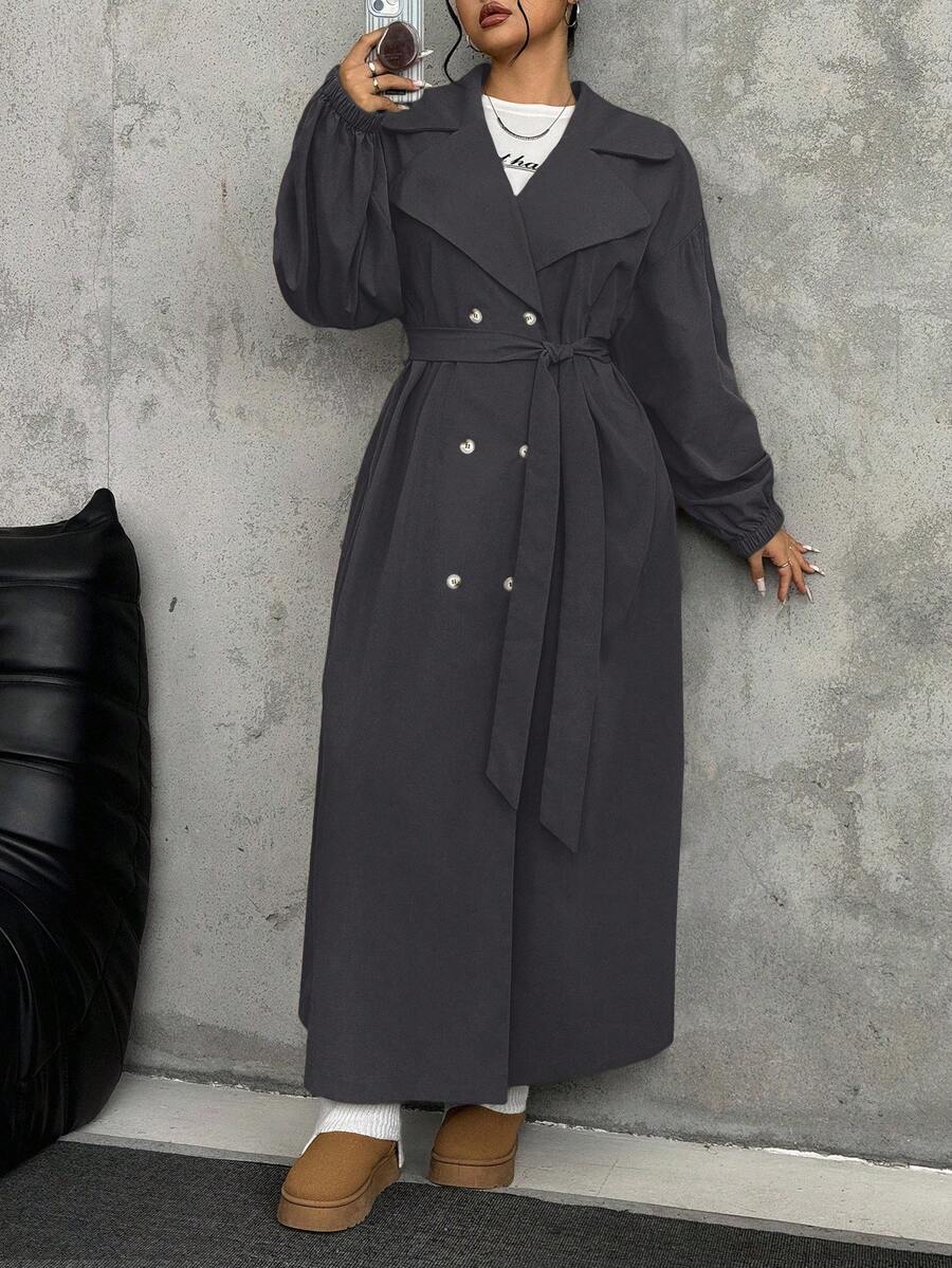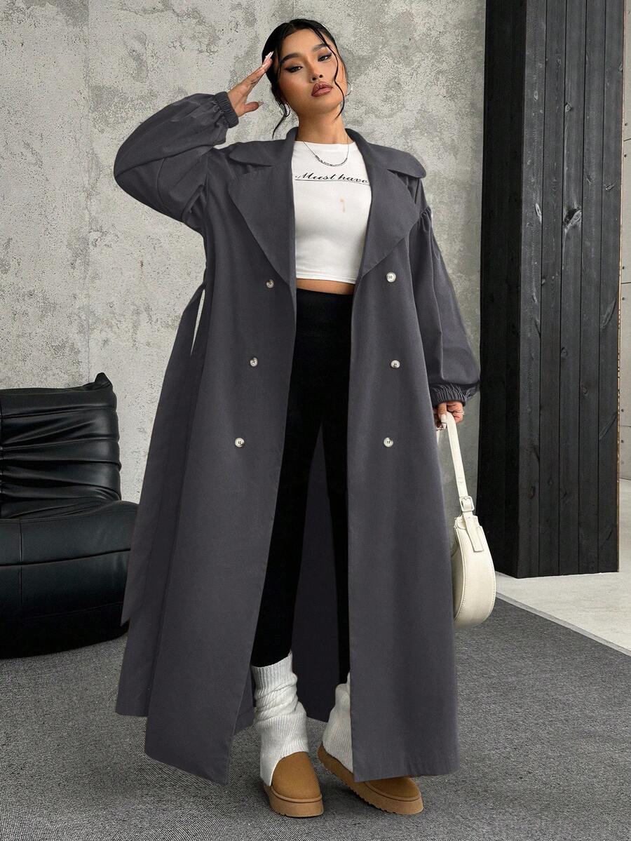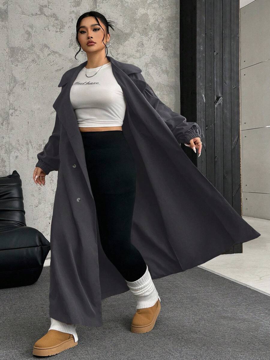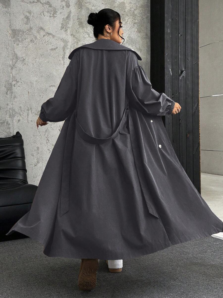 Abrigo largo de trinchera gris casual de manga larga con cuello de solapa para mujer de talla grande, otono