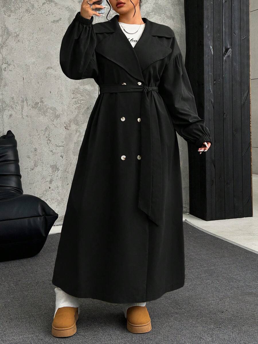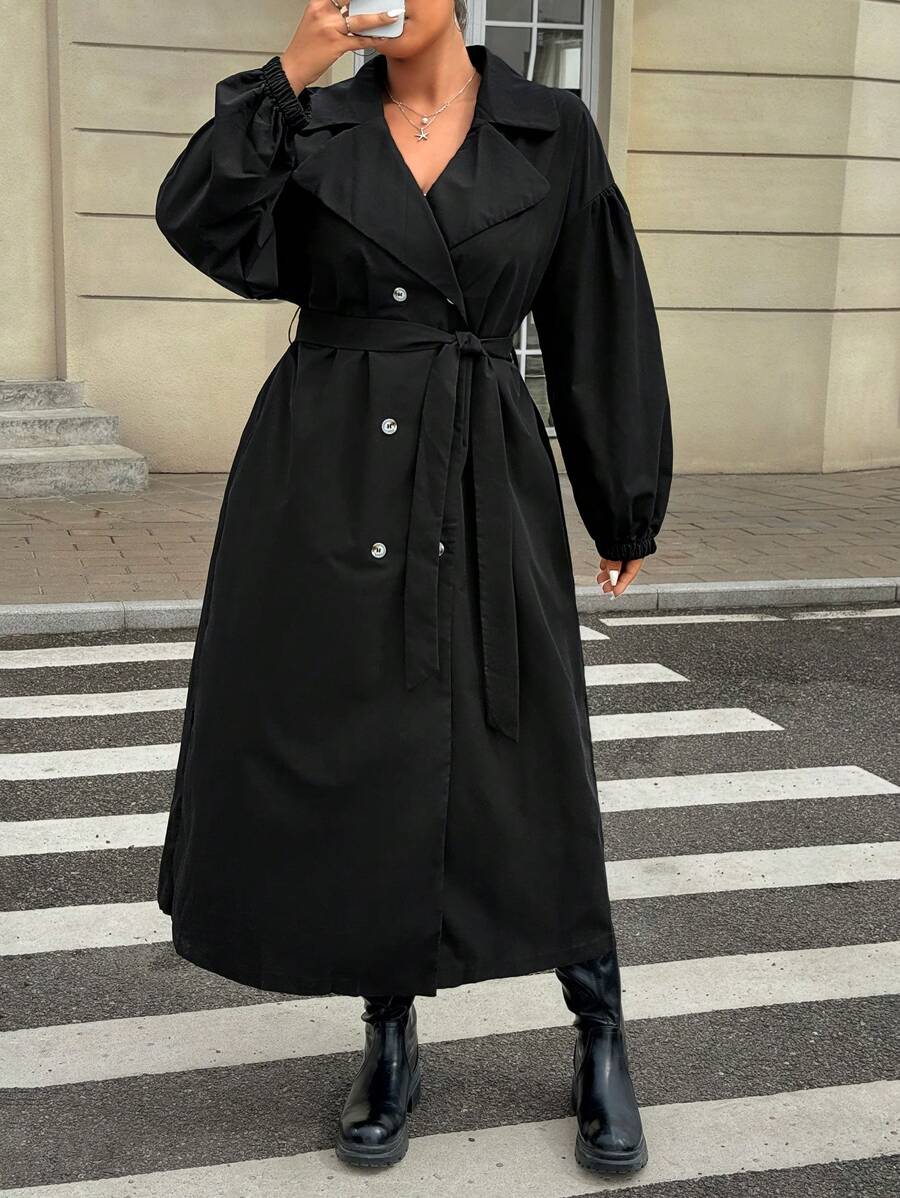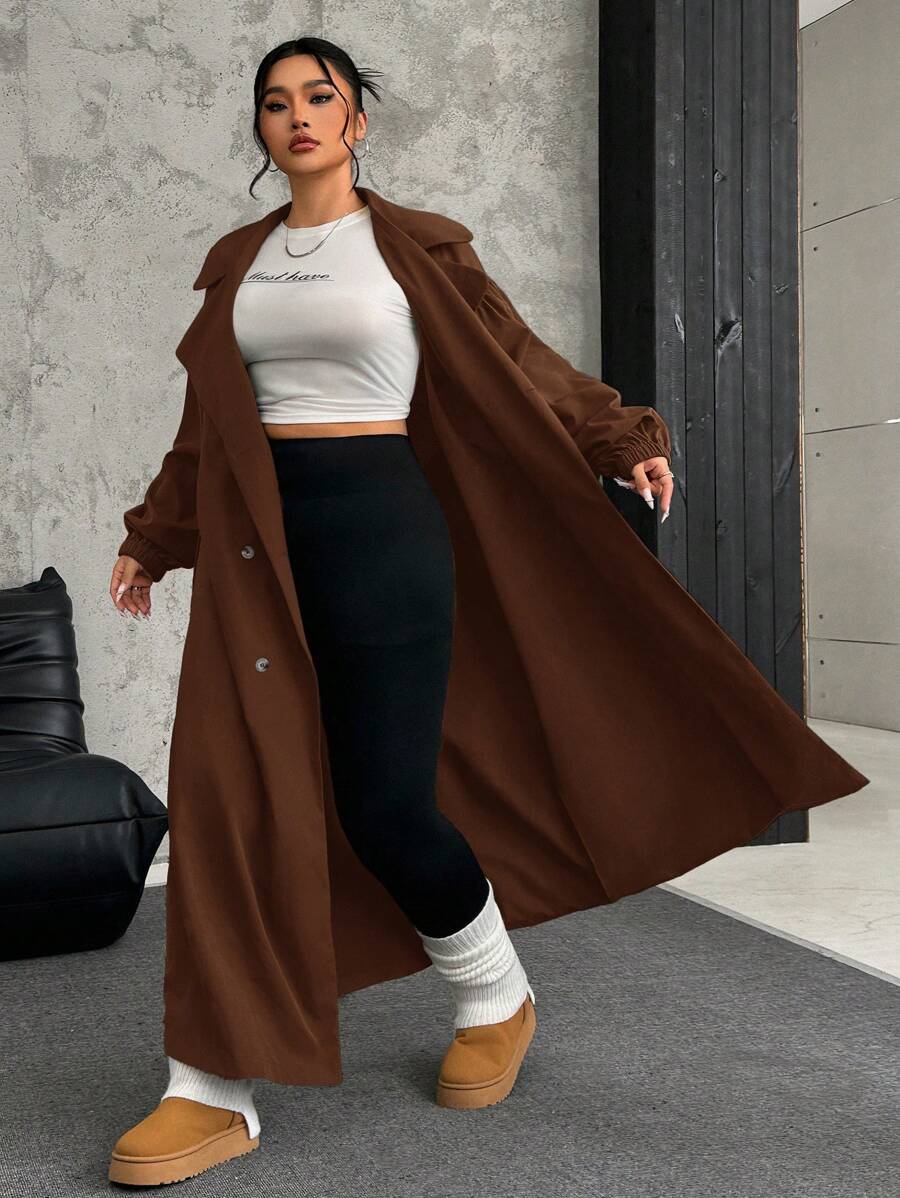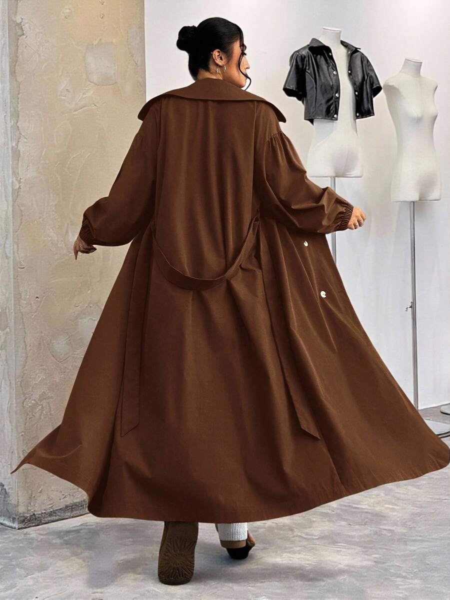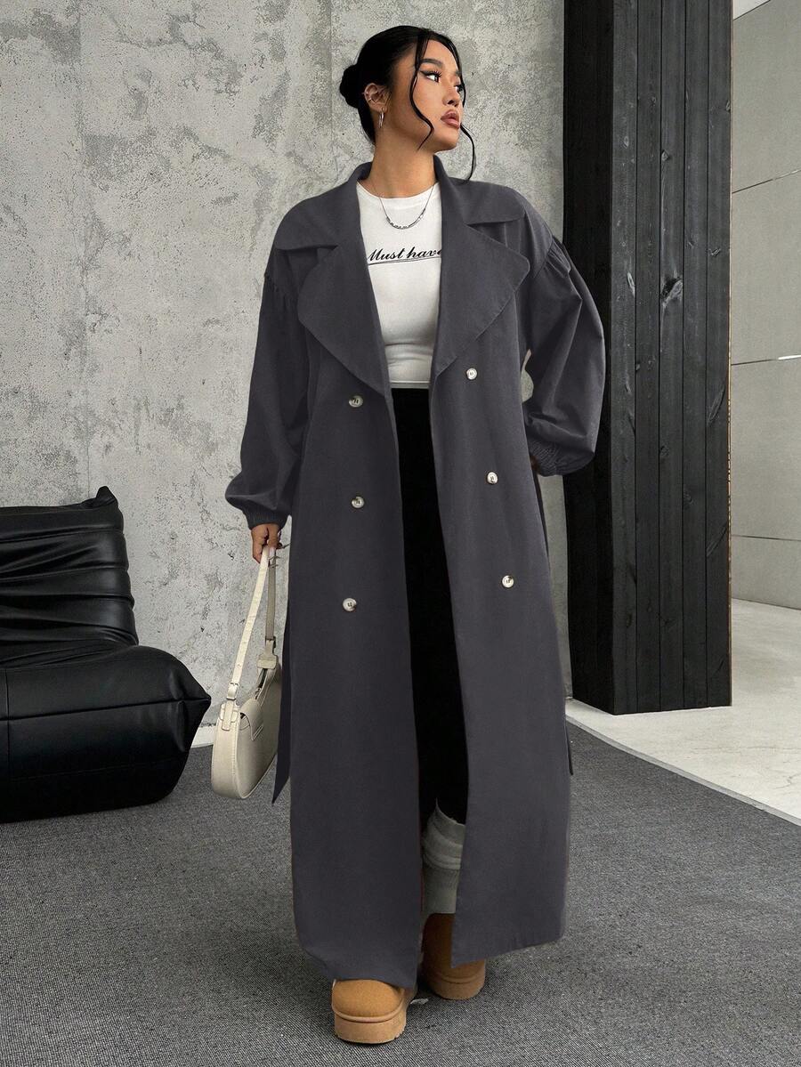 Abrigo largo de trinchera gris casual de manga larga con cuello de solapa para mujer de talla grande, otono
