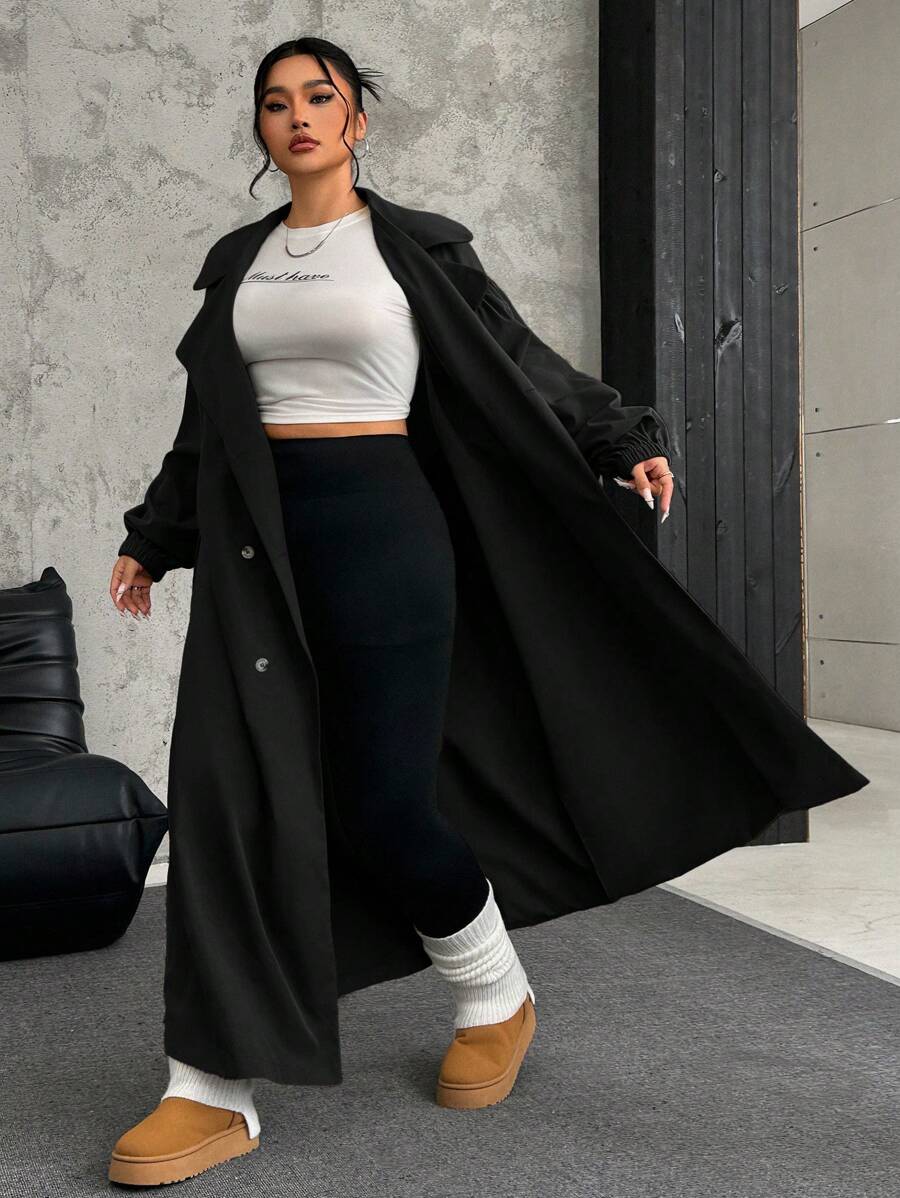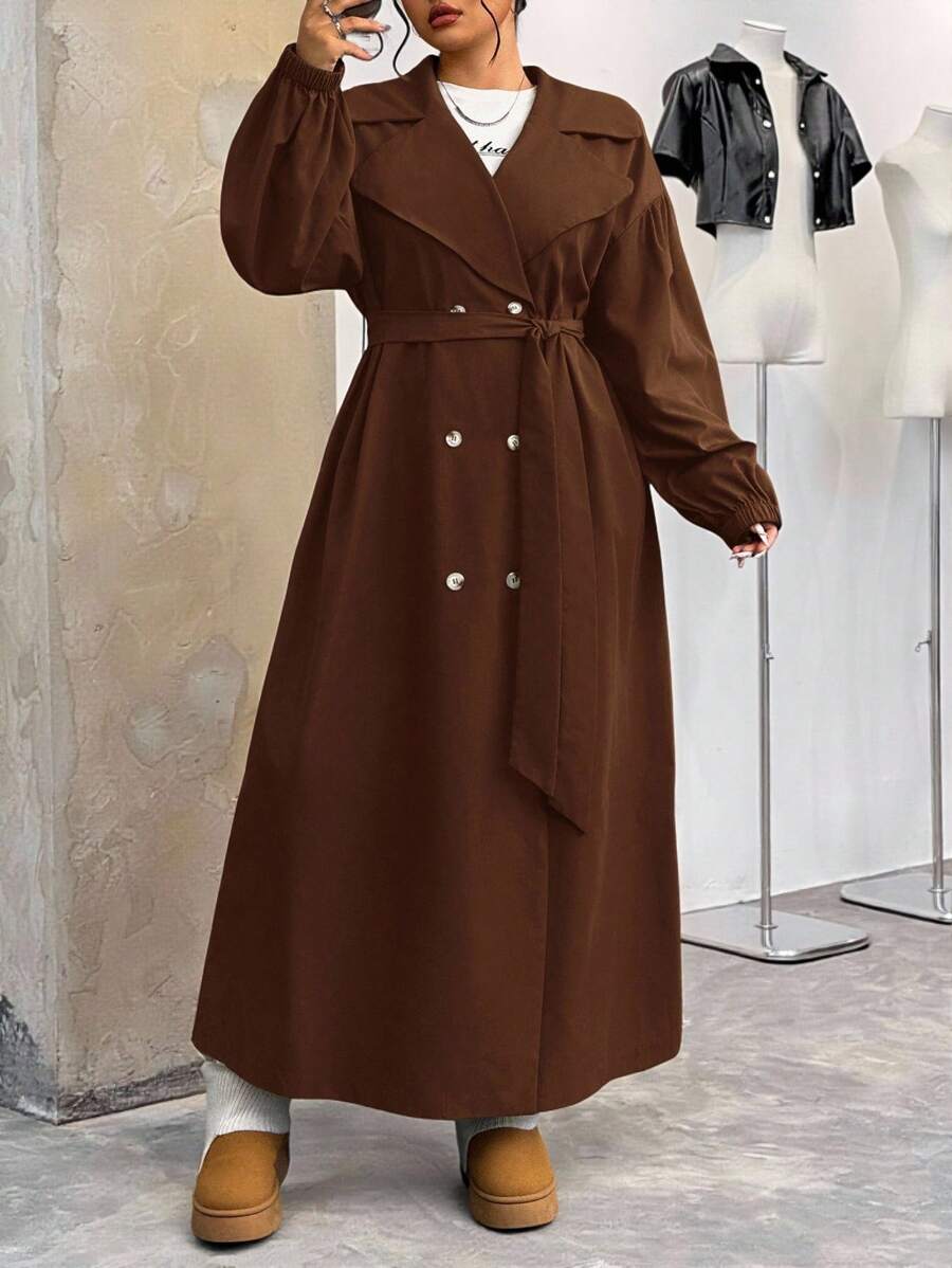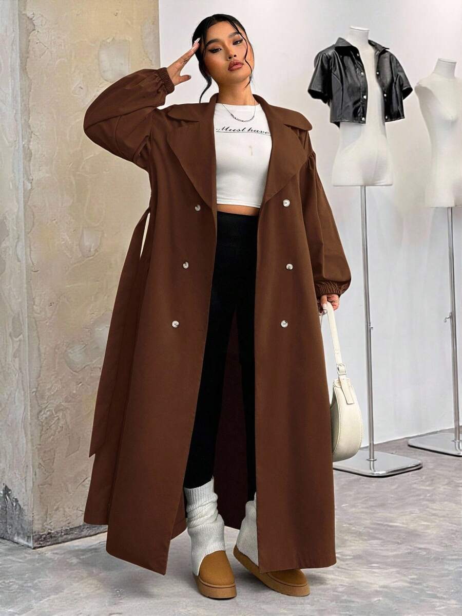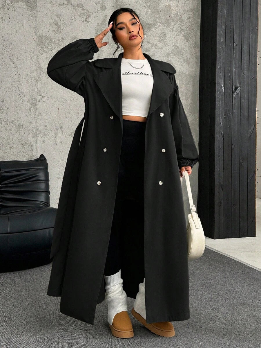 Abrigo largo de trinchera gris casual de manga larga con cuello de solapa para mujer de talla grande, otono