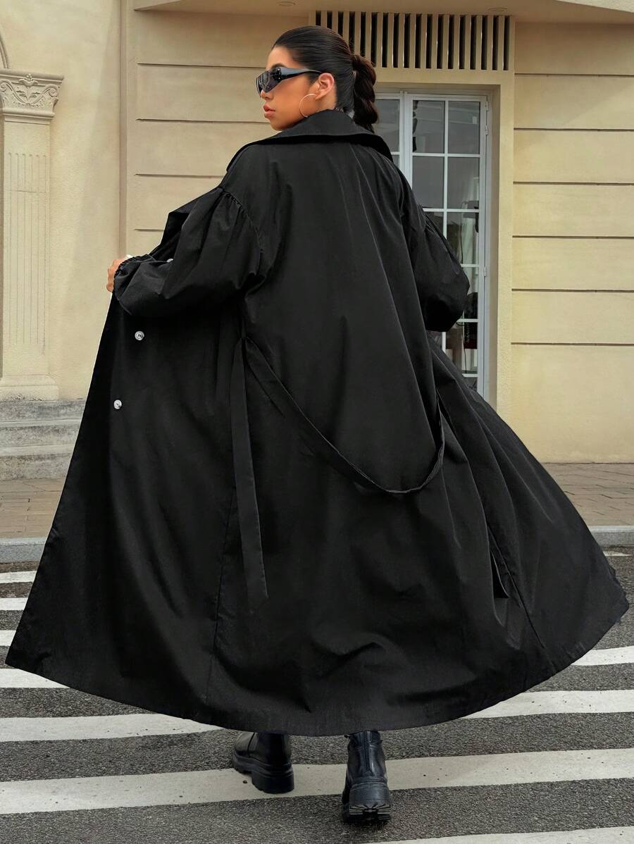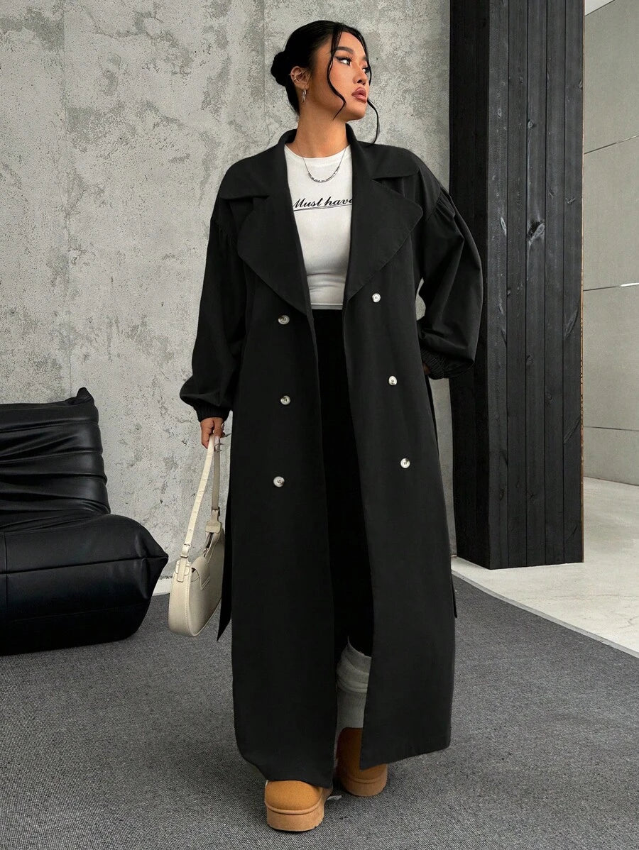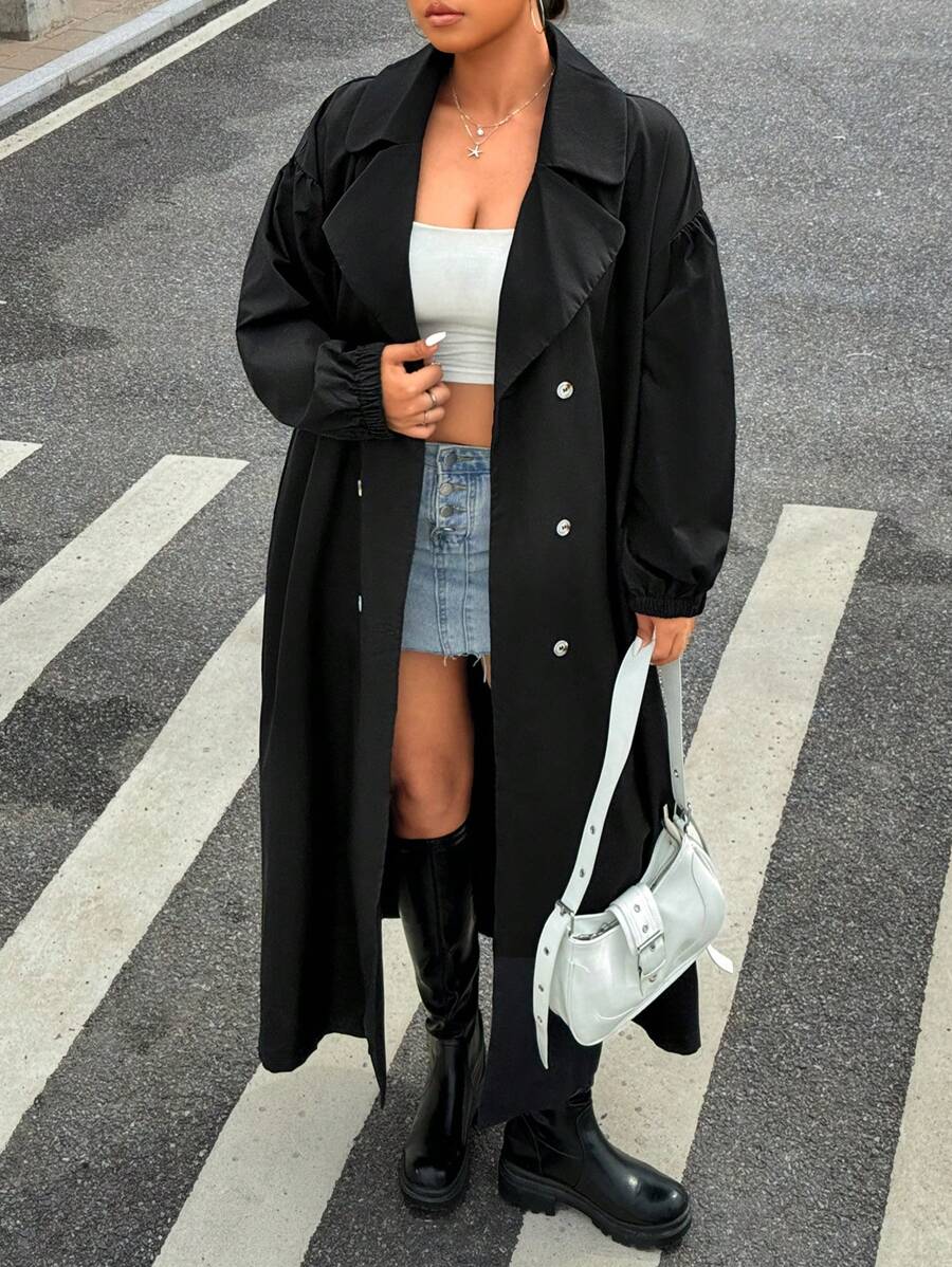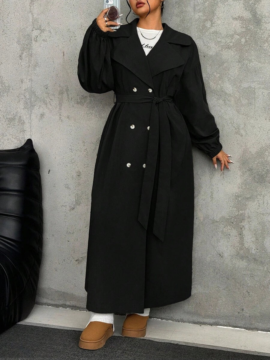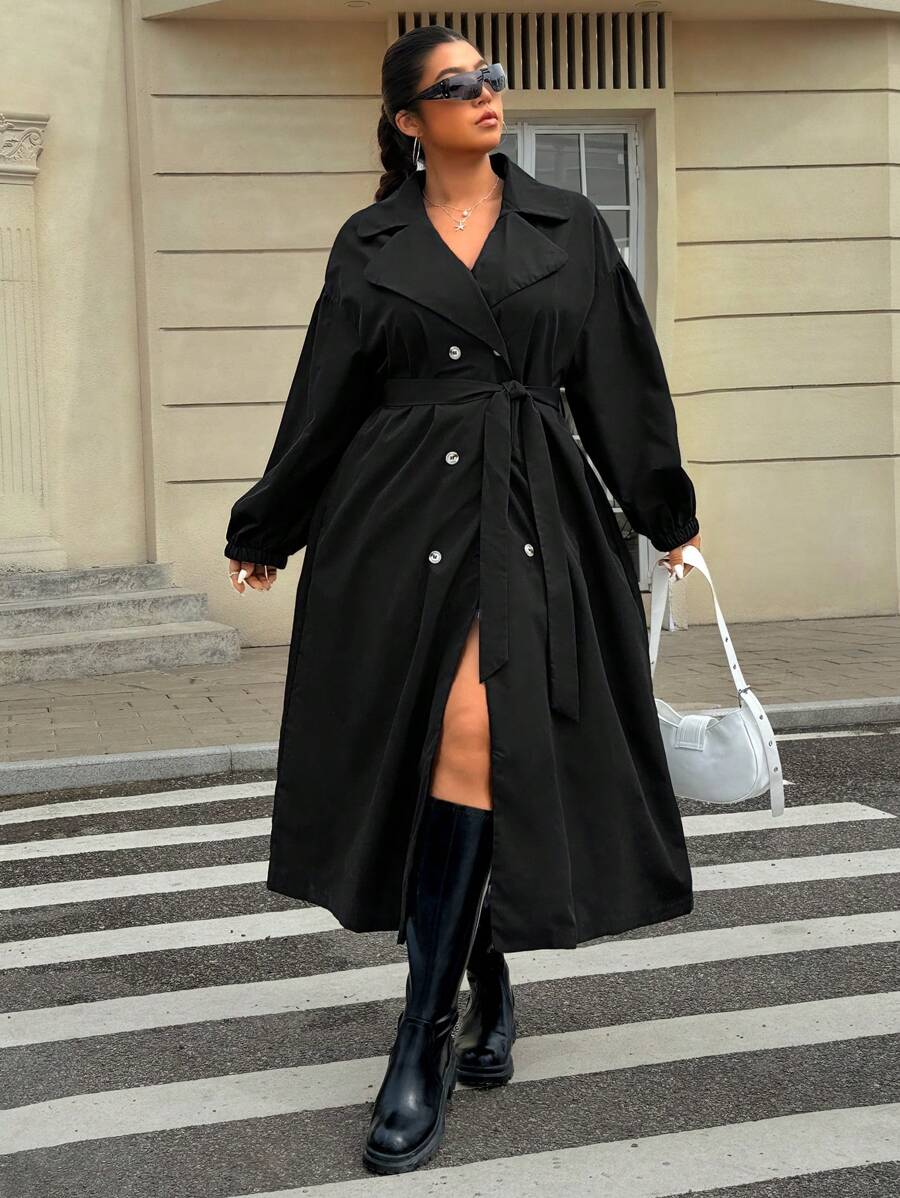 Abrigo largo de trinchera gris casual de manga larga con cuello de solapa para mujer de talla grande, otono