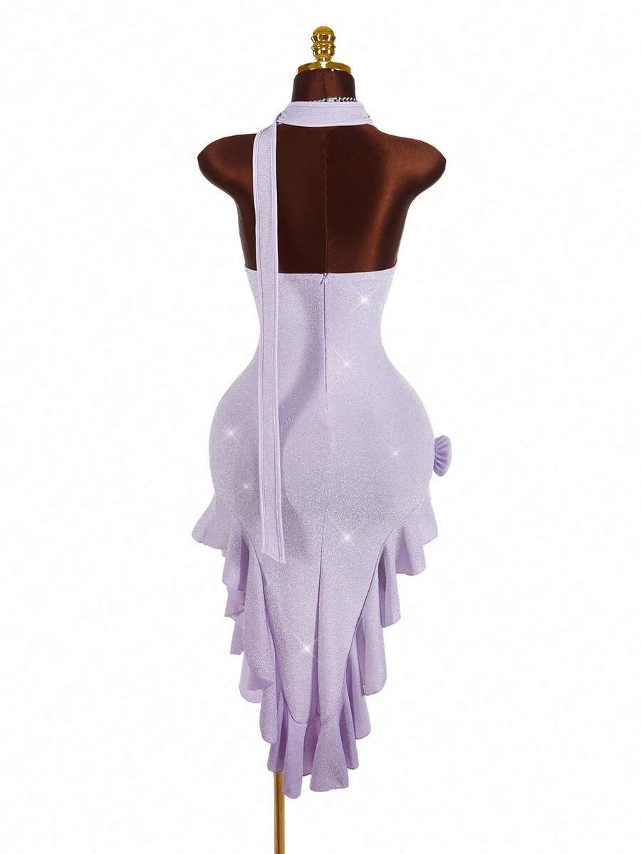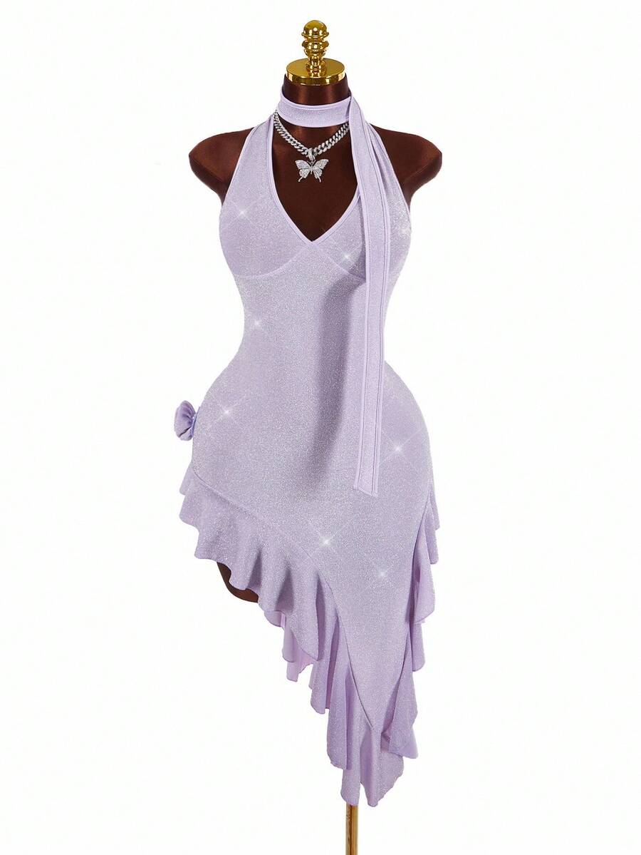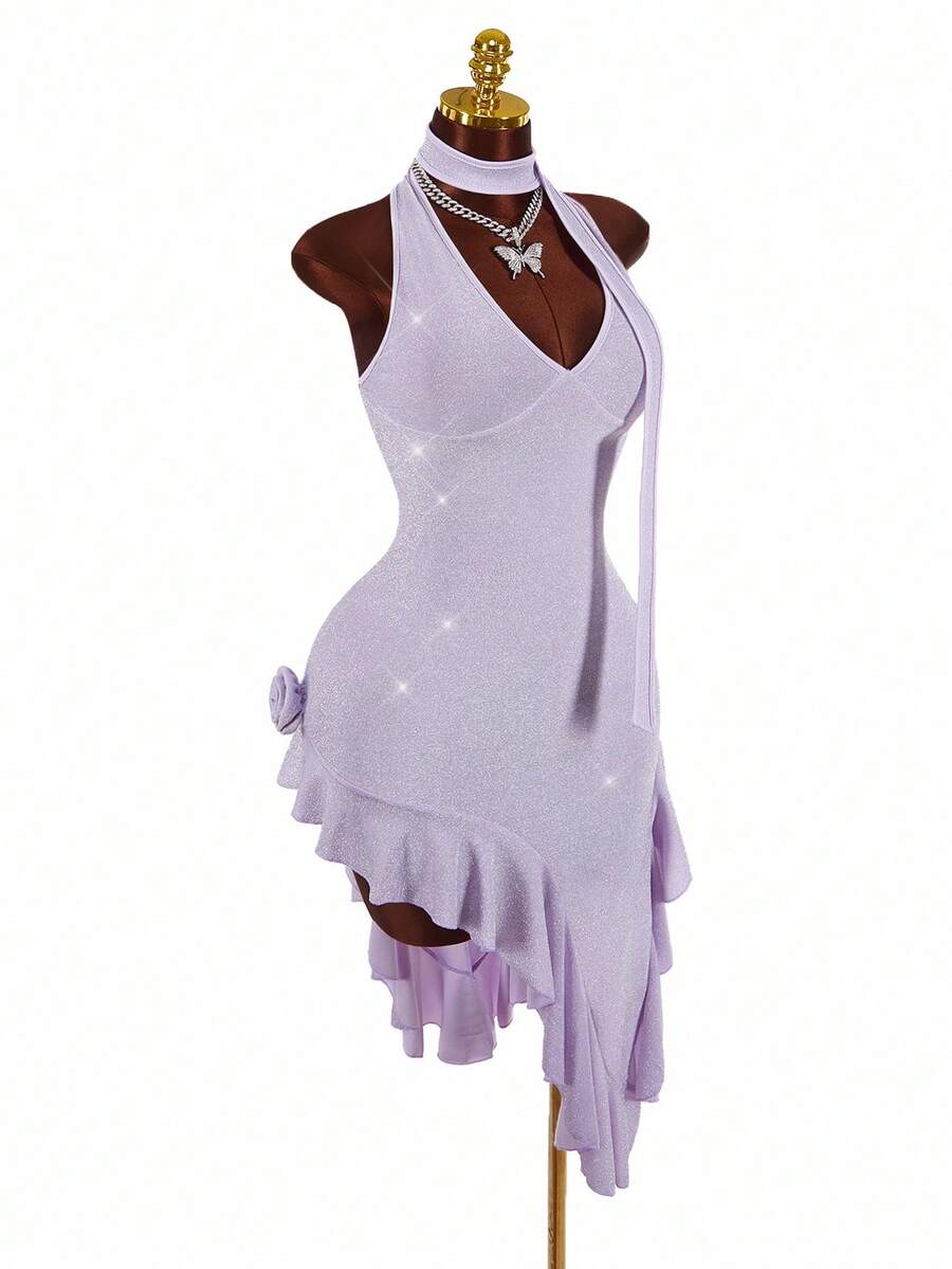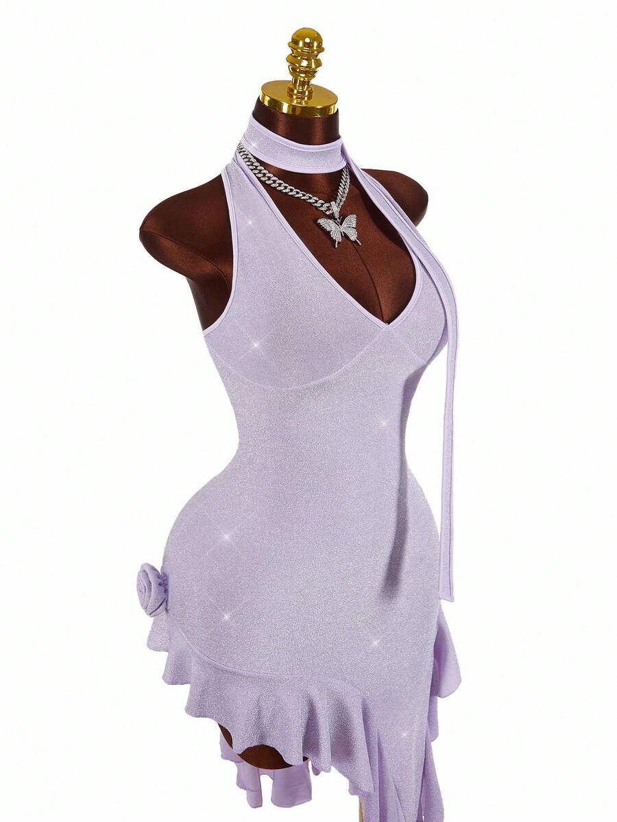 Amplova vestido elegante de mujer talla grande con cuello halter, decoracion de flores 3d con lentejuelas y bajo asimetrico de unicolor