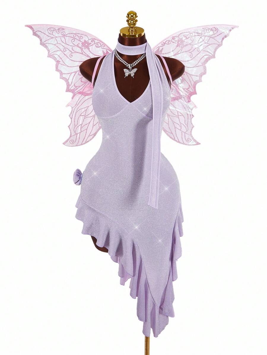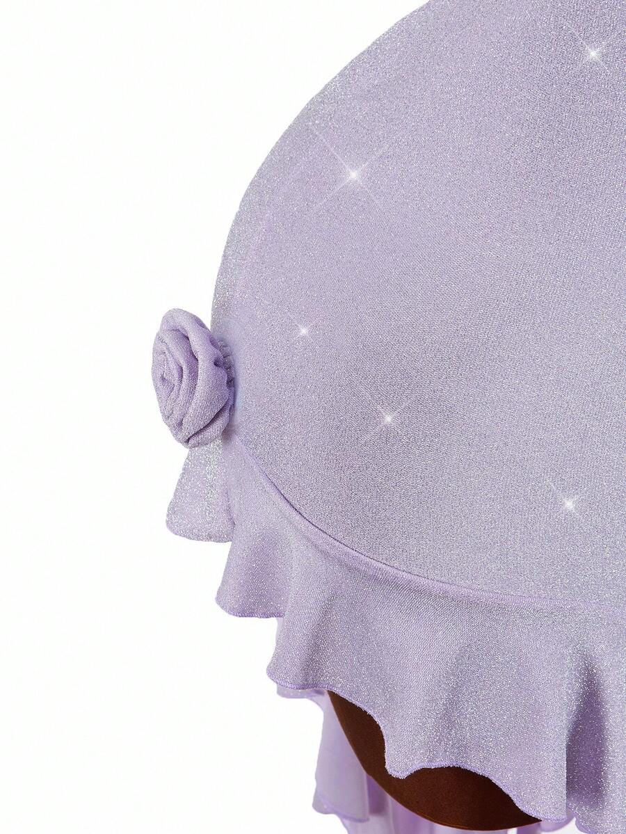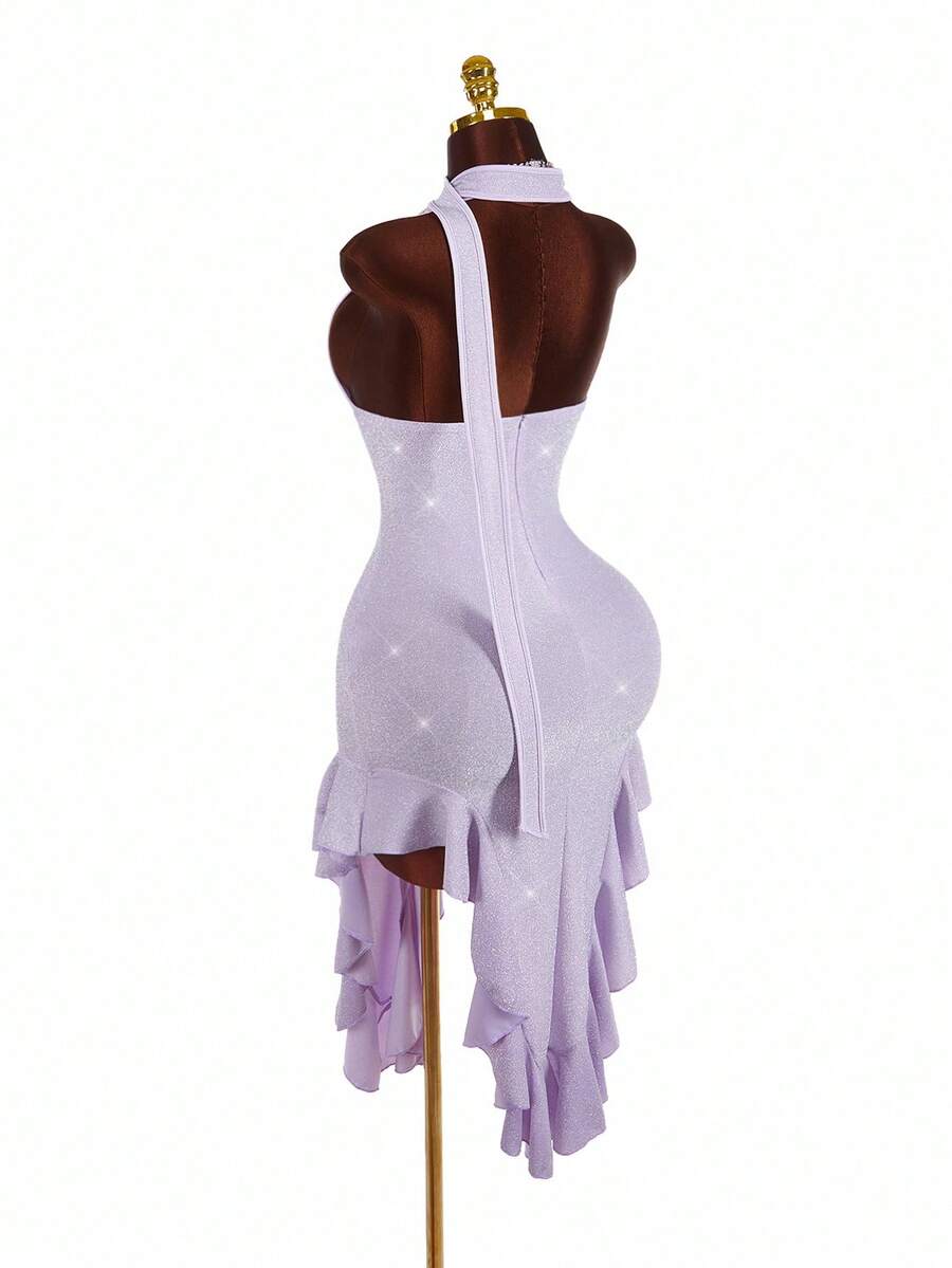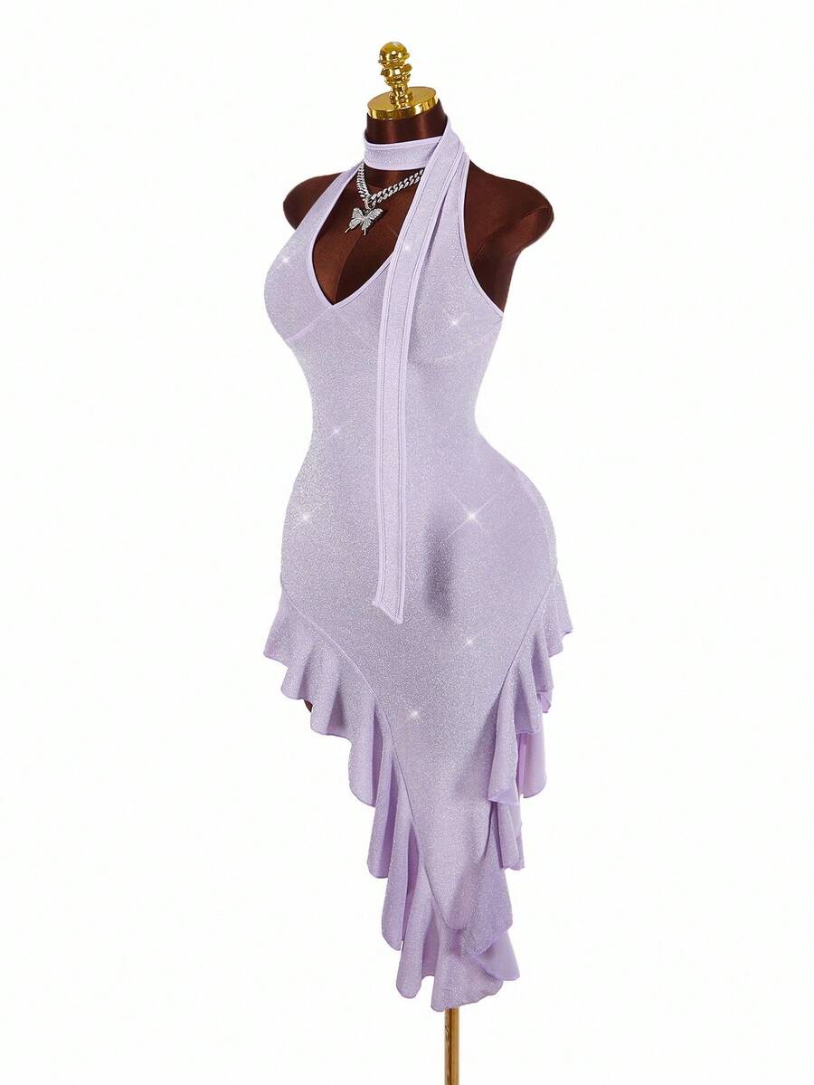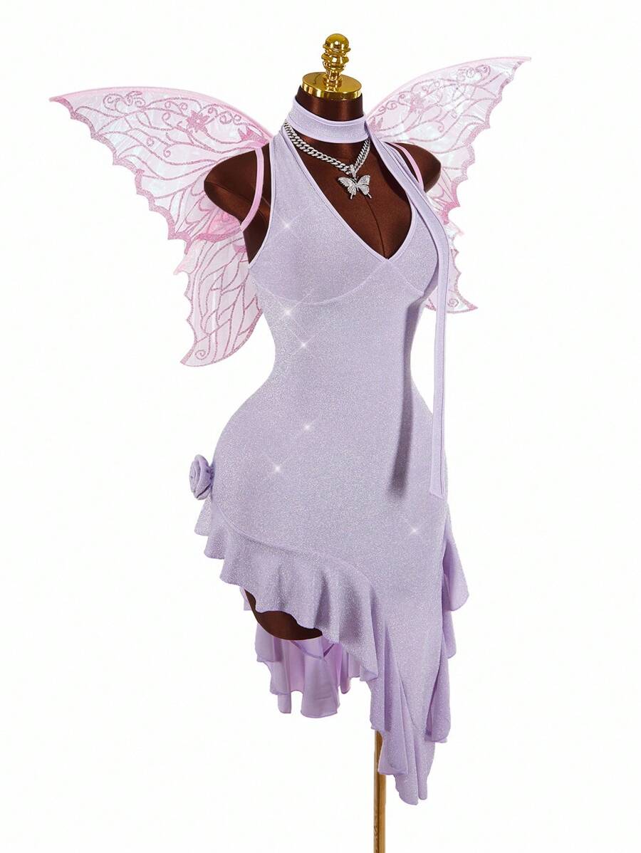 Amplova vestido elegante de mujer talla grande con cuello halter, decoracion de flores 3d con lentejuelas y bajo asimetrico de unicolor
