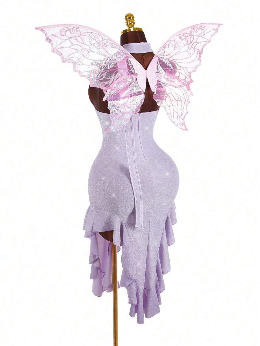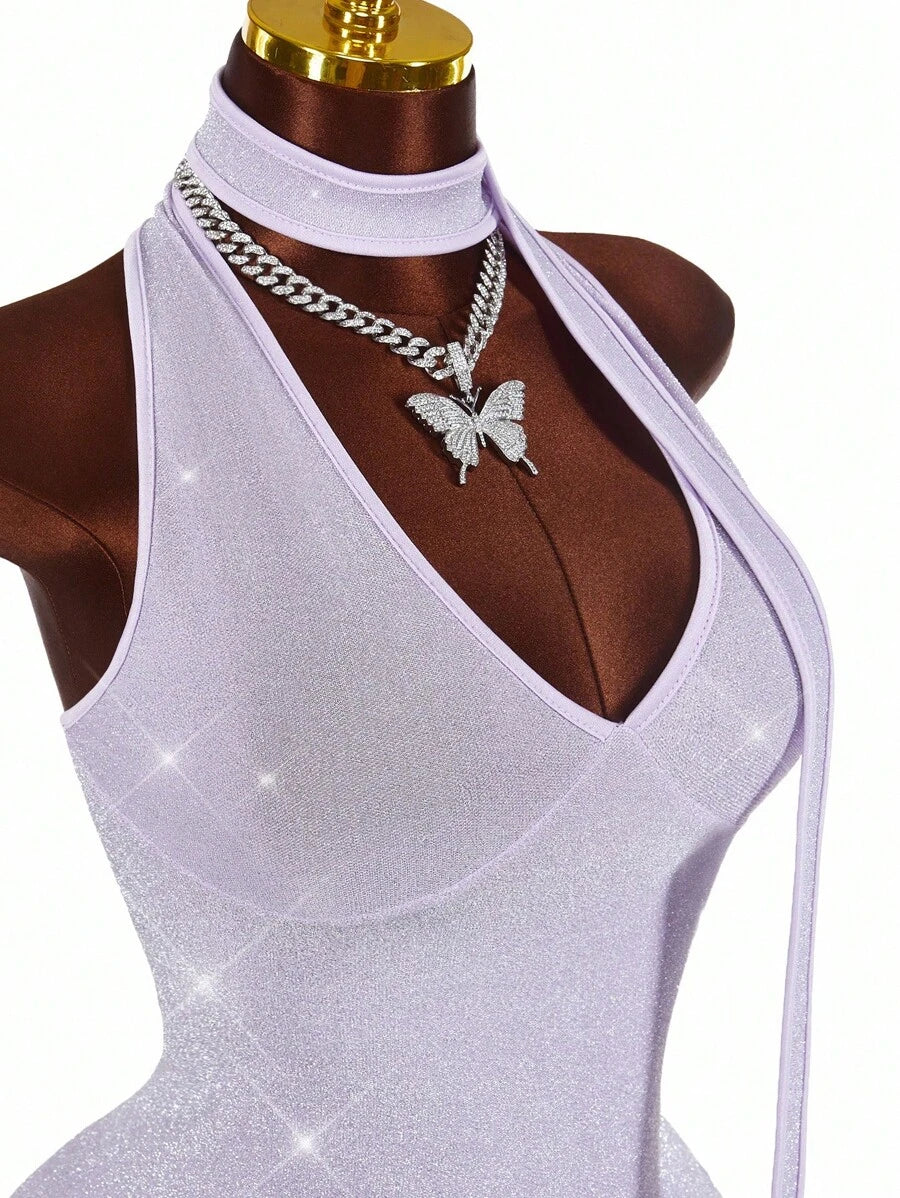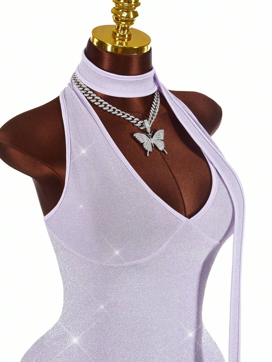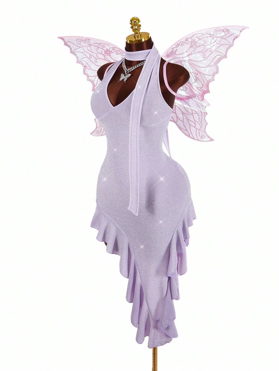 Amplova vestido elegante de mujer talla grande con cuello halter, decoracion de flores 3d con lentejuelas y bajo asimetrico de unicolor