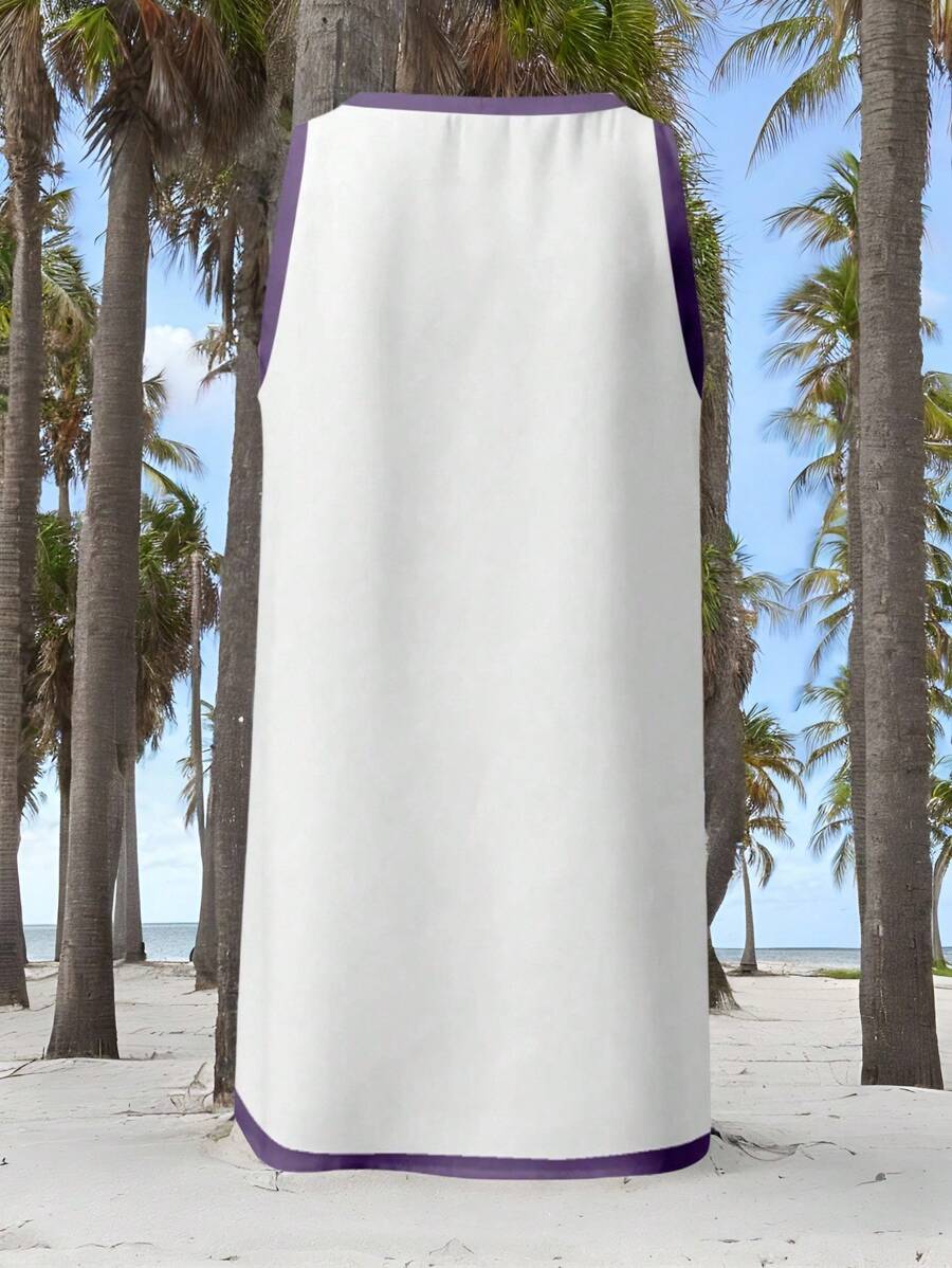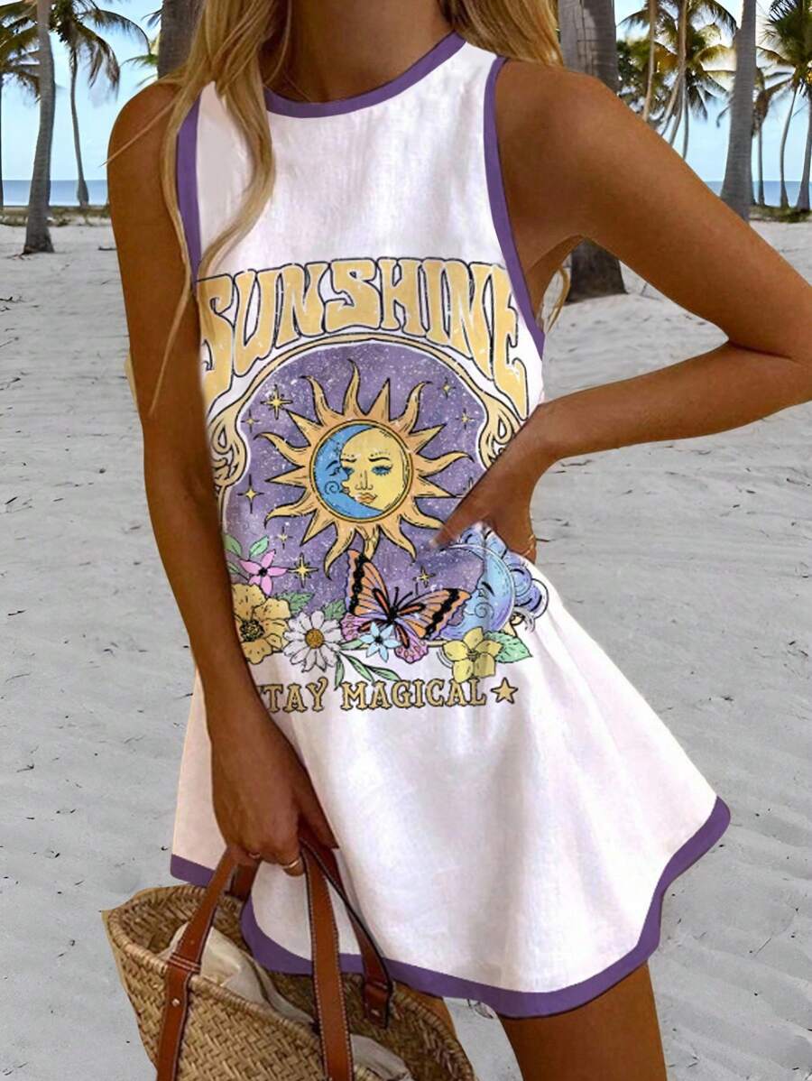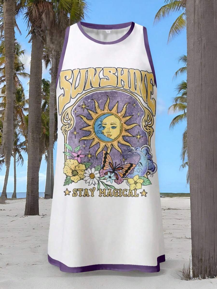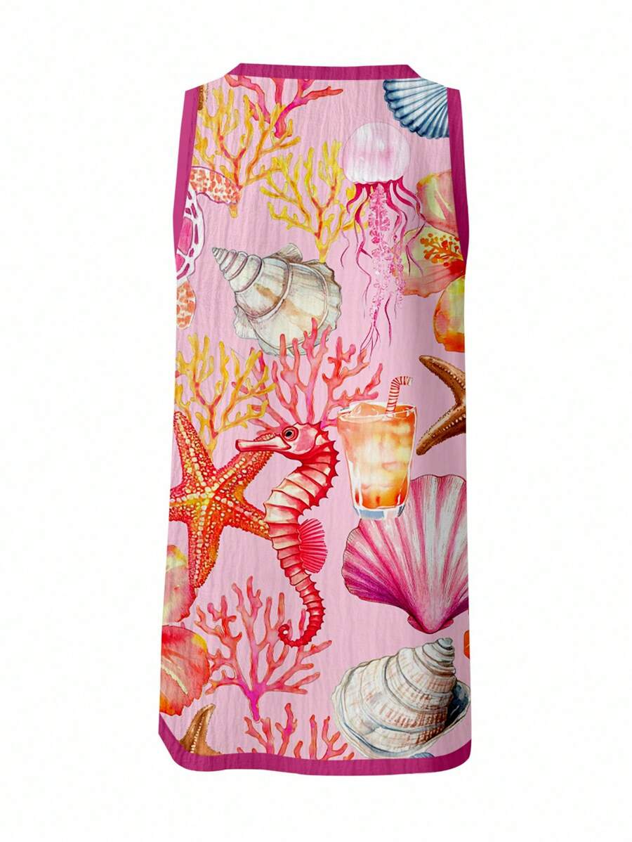 Veykashi vestido mini casual de verano sin mangas para mujer de talla grande, con ribete de contraste, estampado de estrella de mar, estampado de tortuga, estampado de hibisco, estampado floral, estampado de coral, estampado de estrella de mar,