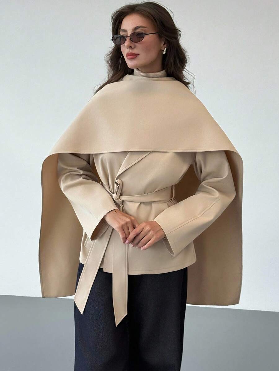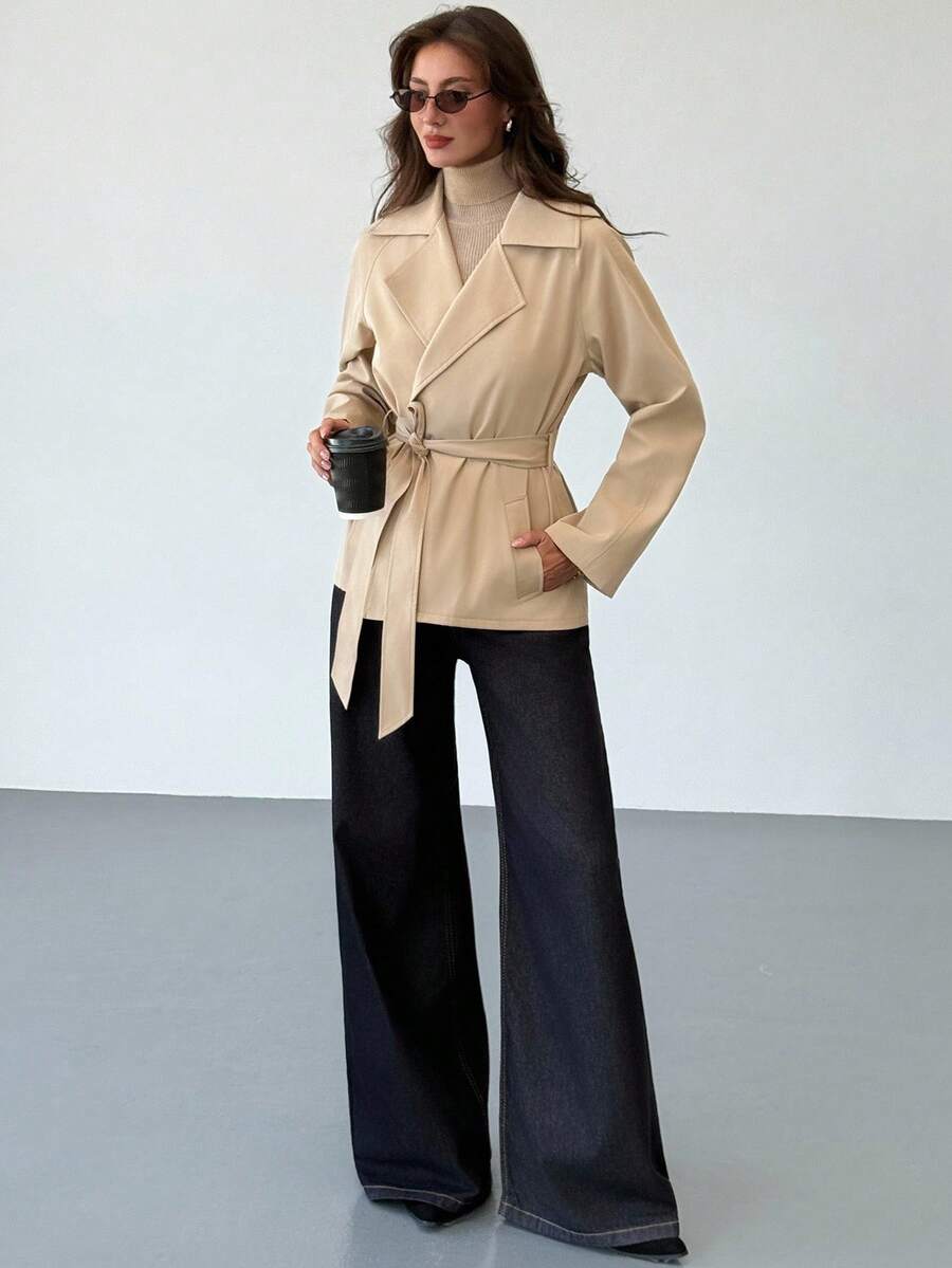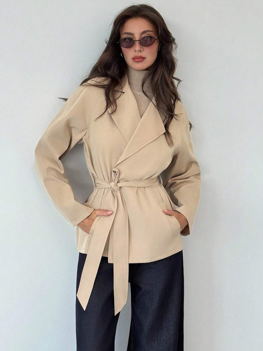 Abrigo trench de mujer de longitud media con cuello de chal, cintura cenida y bolsillos en la cintura, color camello, para otono/invierno
