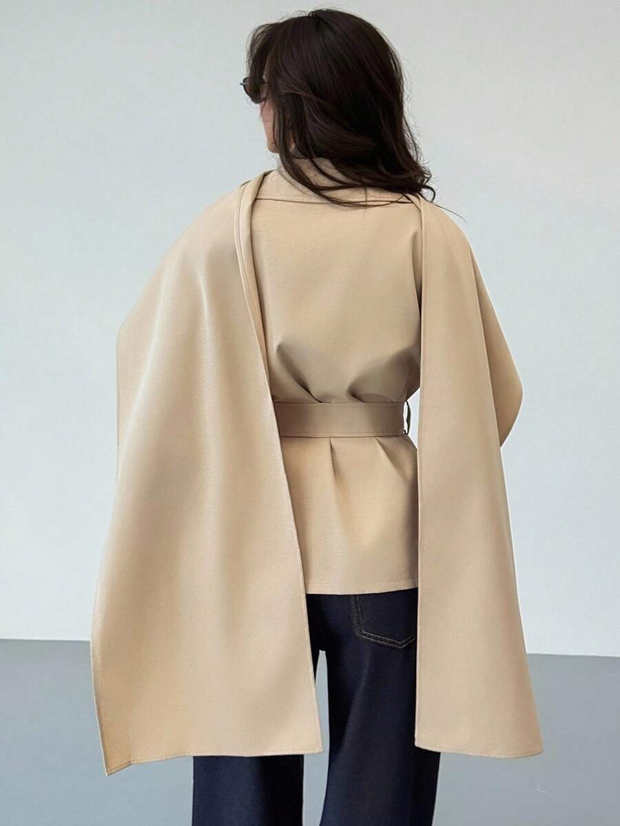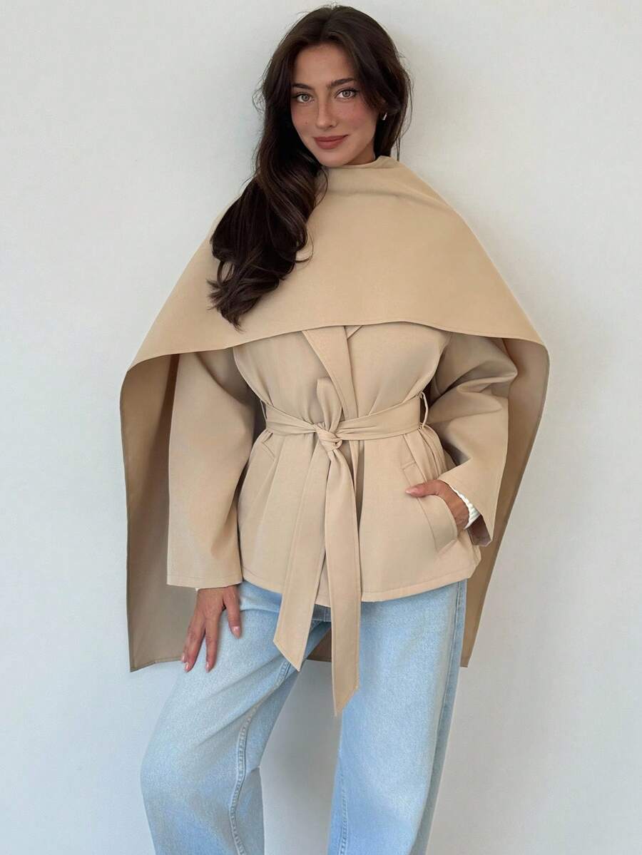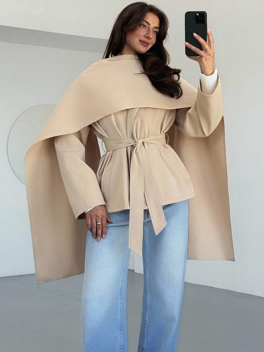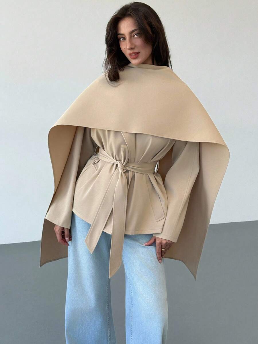Abrigo trench de mujer de longitud media con cuello de chal, cintura cenida y bolsillos en la cintura, color camello, para otono/invierno