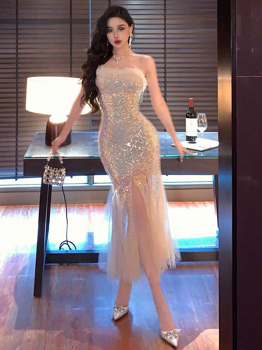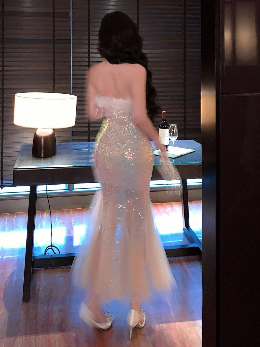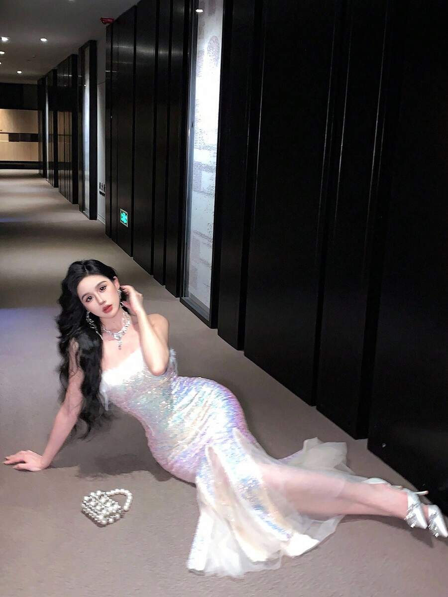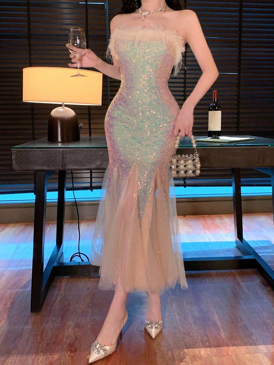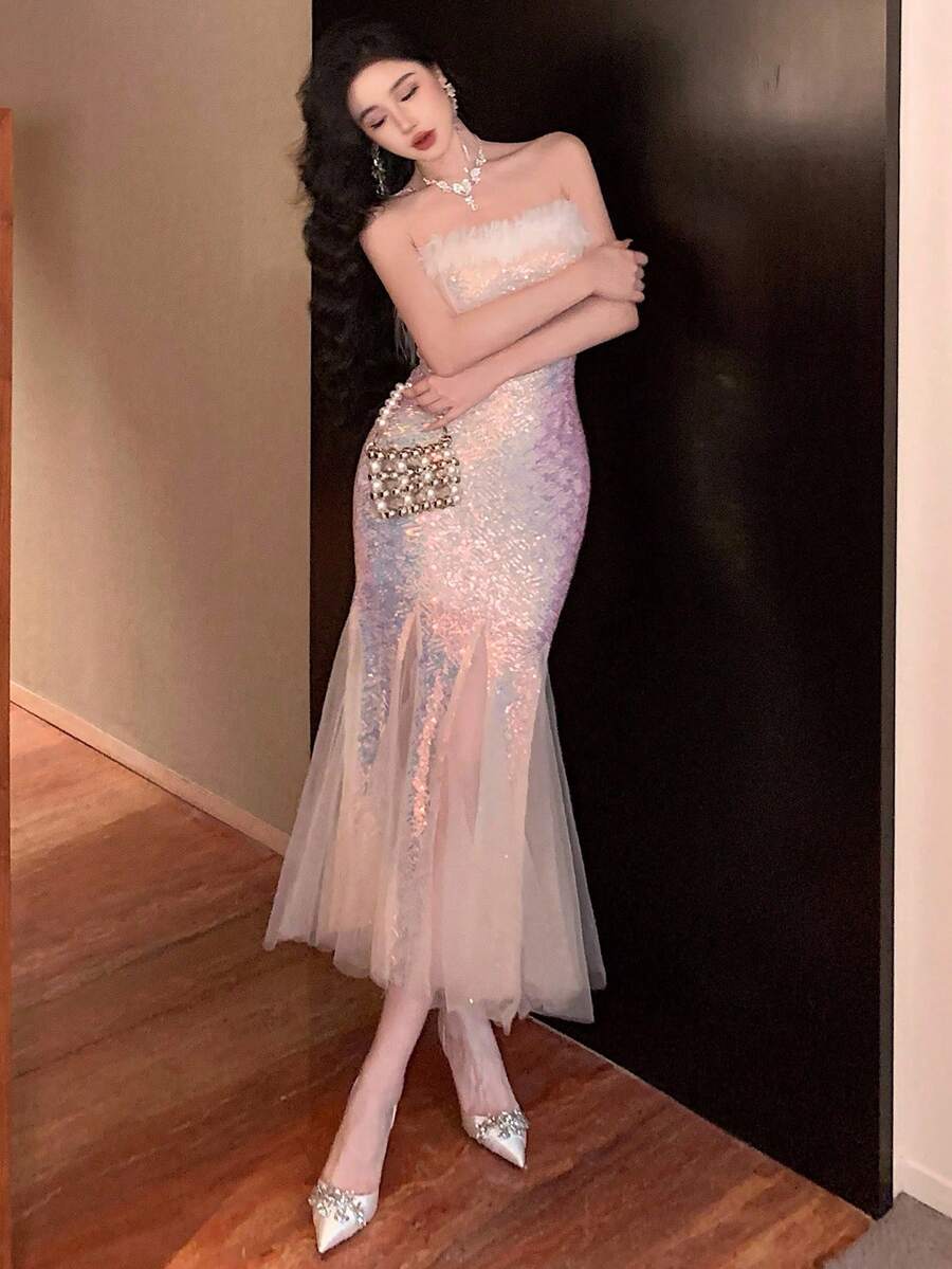 Vestido midi elegante para fiesta con dobladillo de cola de pez, malla esponjosa y parches de lentejuelas degradadas para mujer