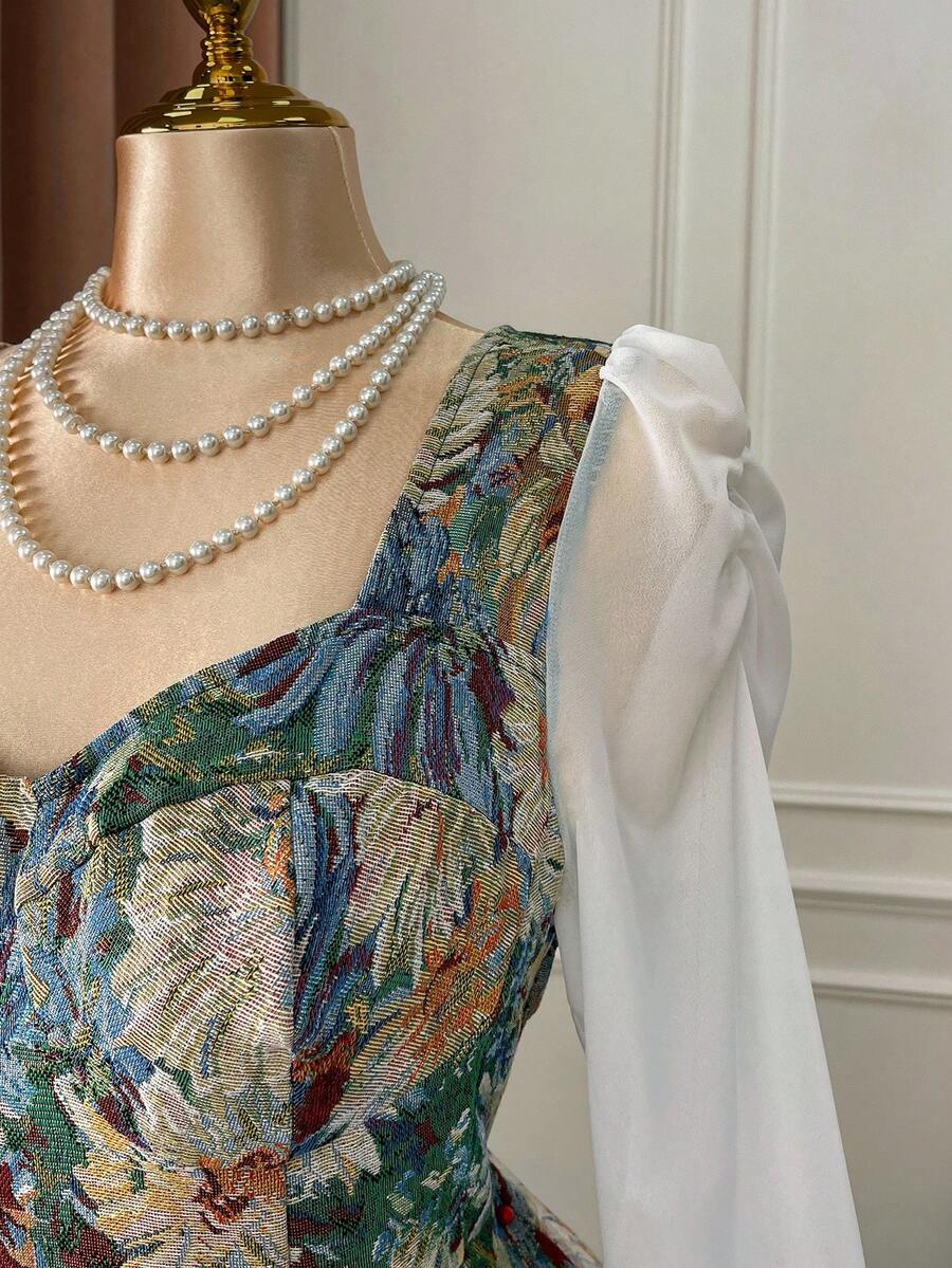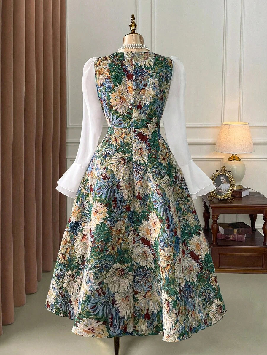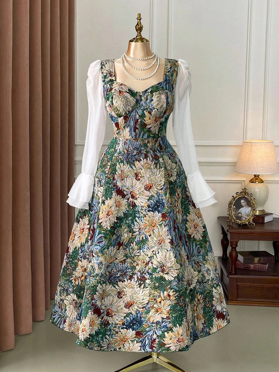 Vestido elegante de manga larga, cintura ajustada y vuelo, de gasa con estampado floral vintage tipo oleo para mujer de talla grande