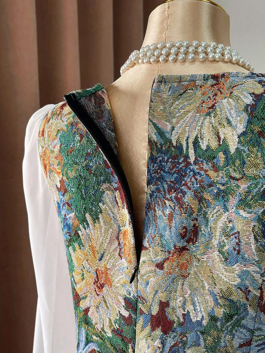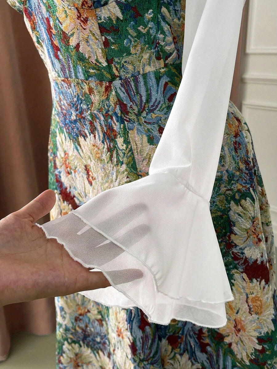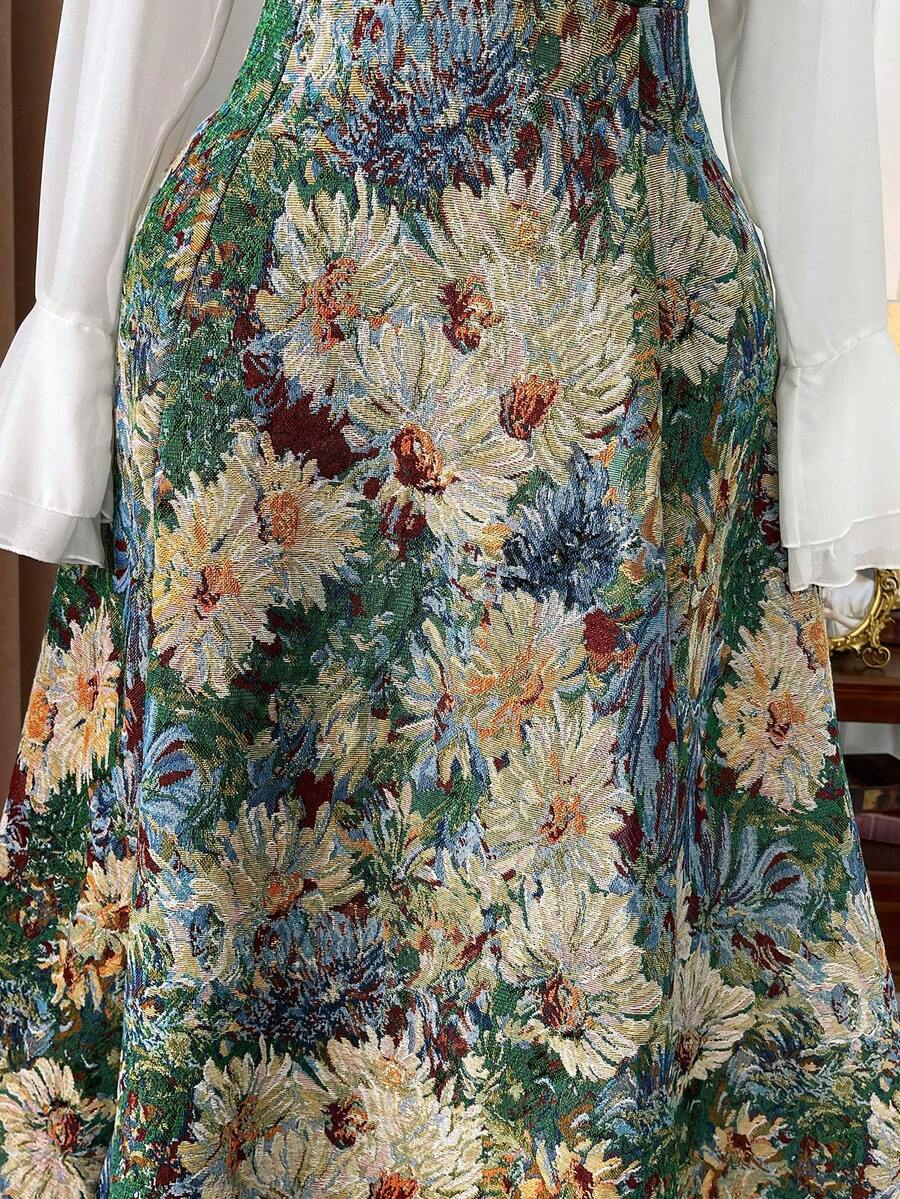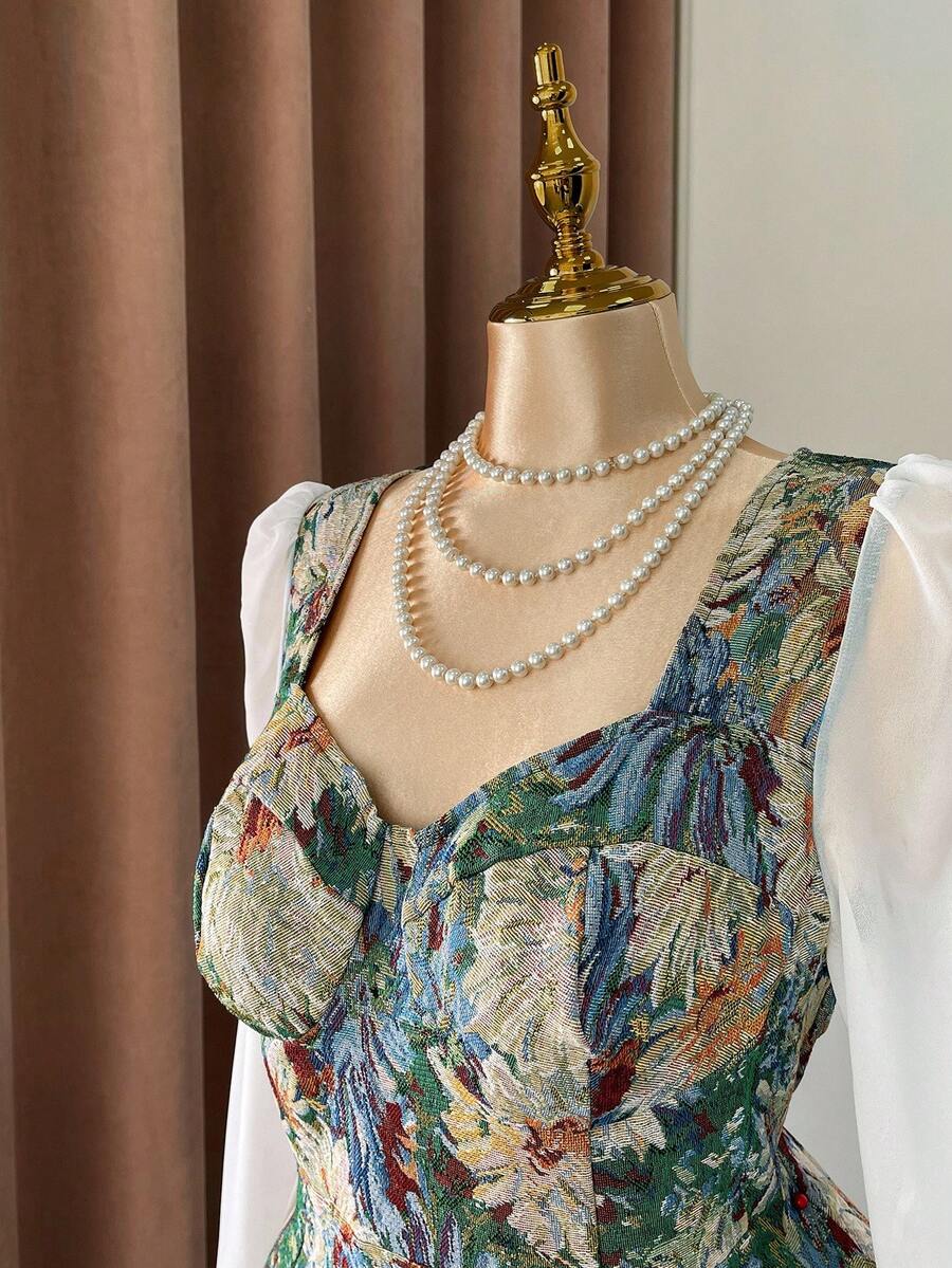 Vestido elegante de manga larga, cintura ajustada y vuelo, de gasa con estampado floral vintage tipo oleo para mujer de talla grande