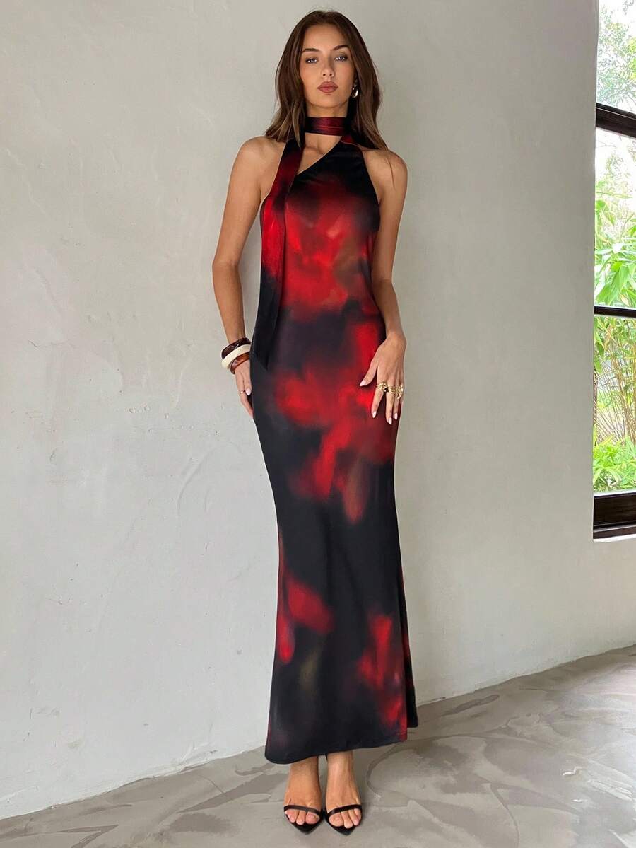 Vestido de mujer nuevo para otono/invierno, vestido de fiesta romantico, vintage y elegante con cuello halter, hombros asimetricos, espalda descubierta, estampado floral y fluido, ideal para tomar el te por la tarde