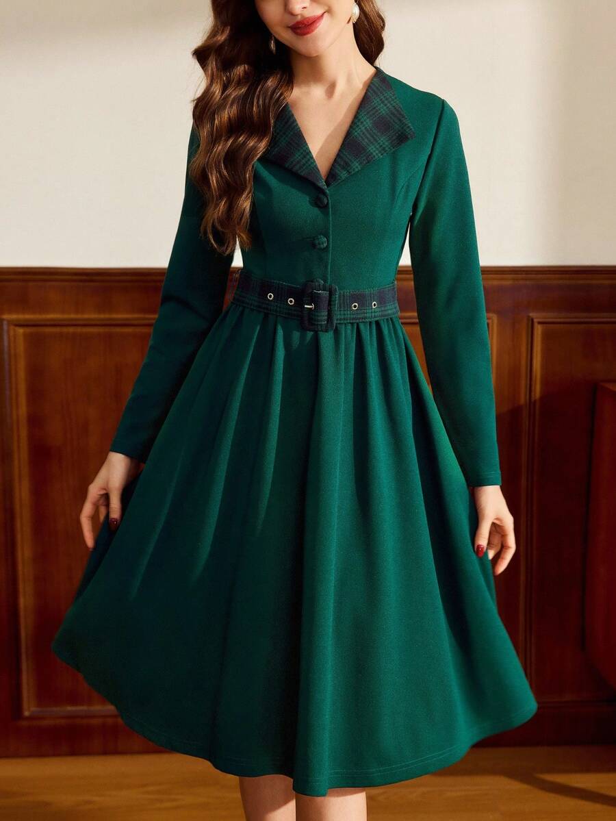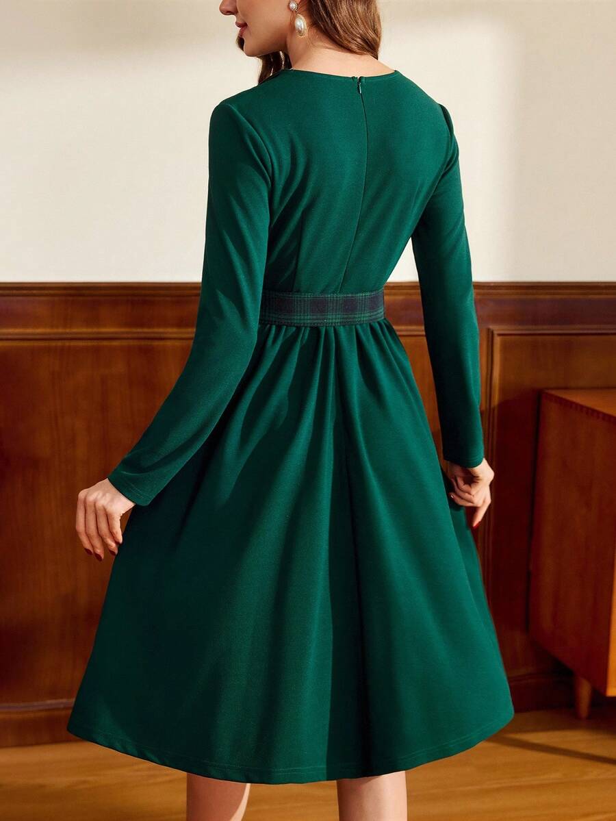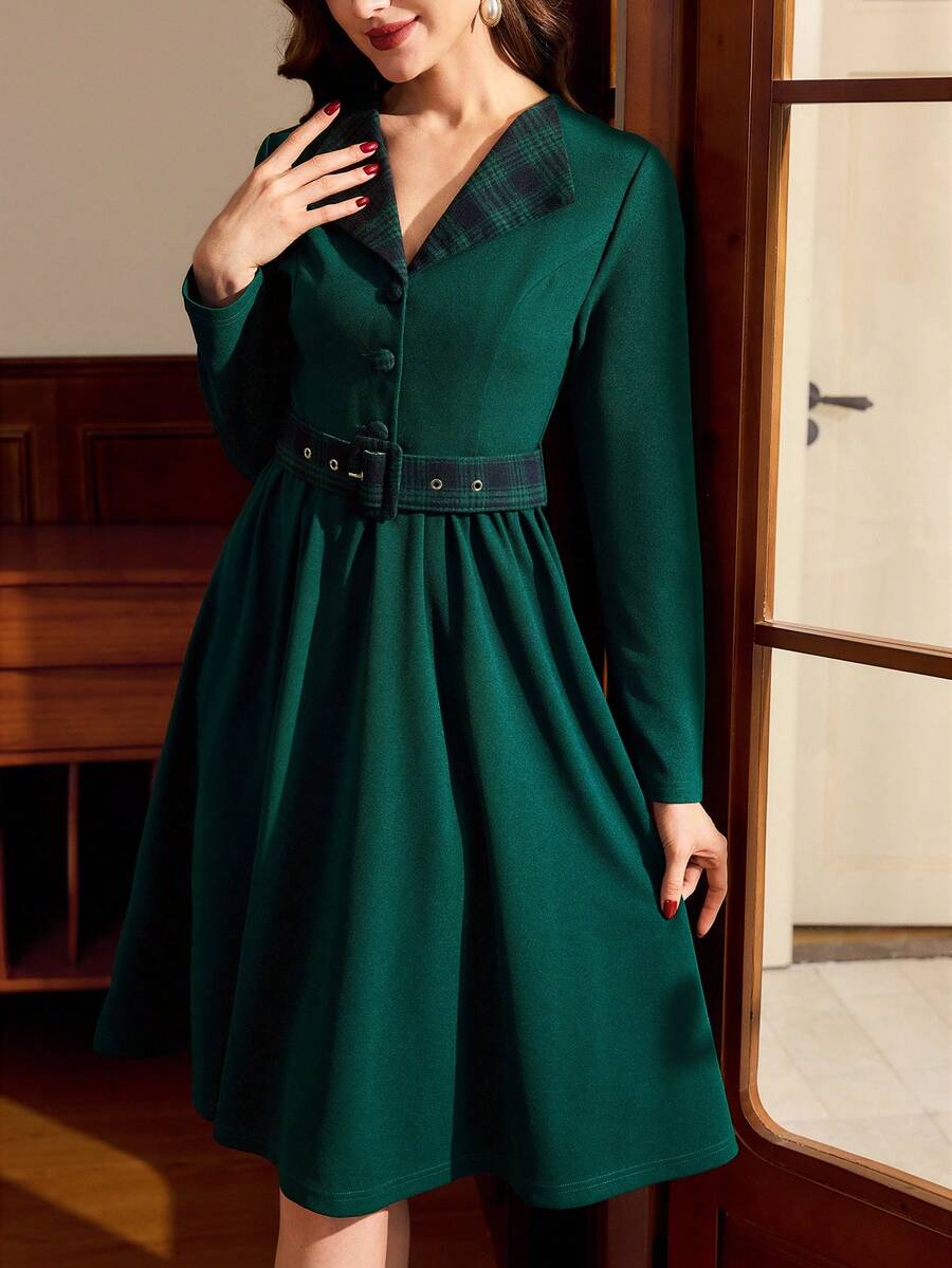 Vintamour vestido de mujer estilo universitario vintage, vestido ajustado de parches de cuadros con cuello y dobladillo acampanado, vestido de manga larga azul marino, otono/invierno