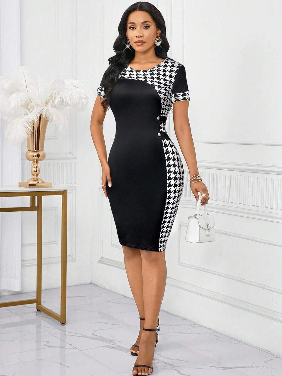 Vestido midi elegante para mujer con cuello redondo, mangas cortas y cintura cenida