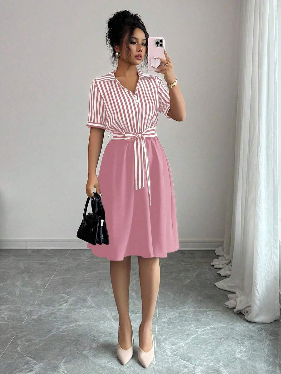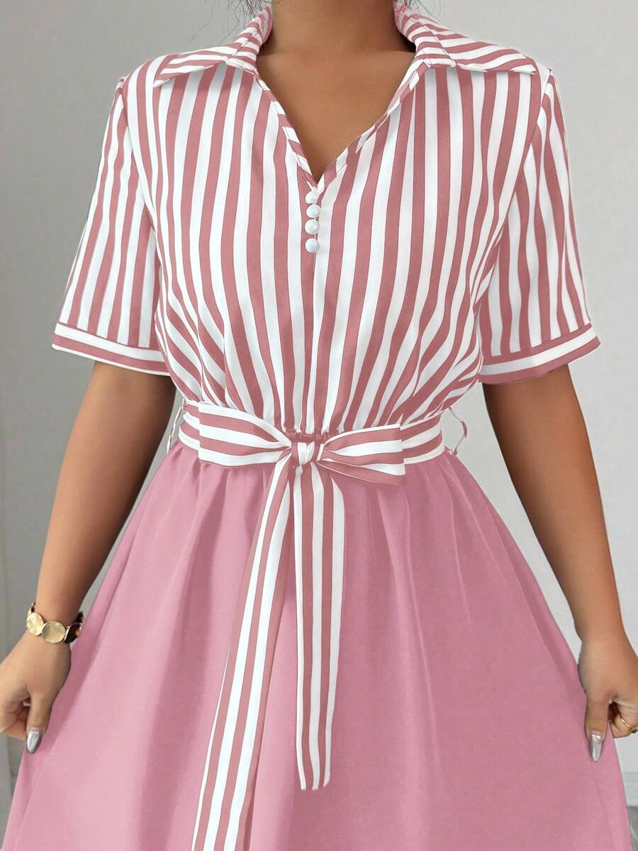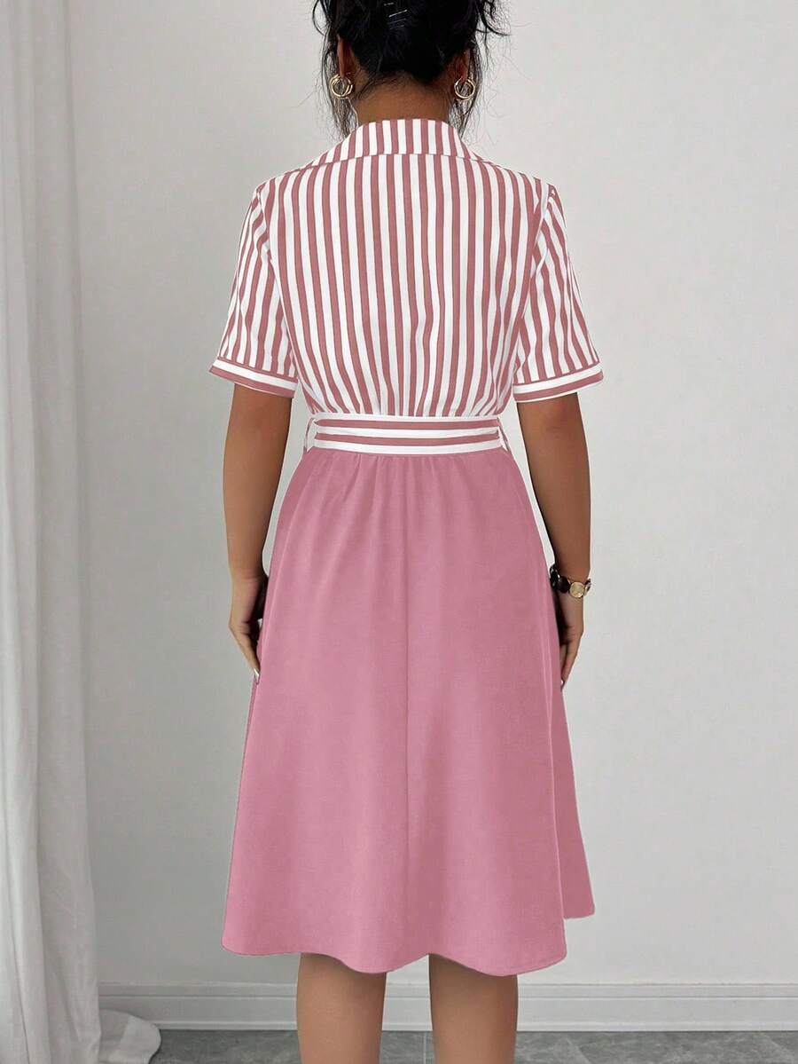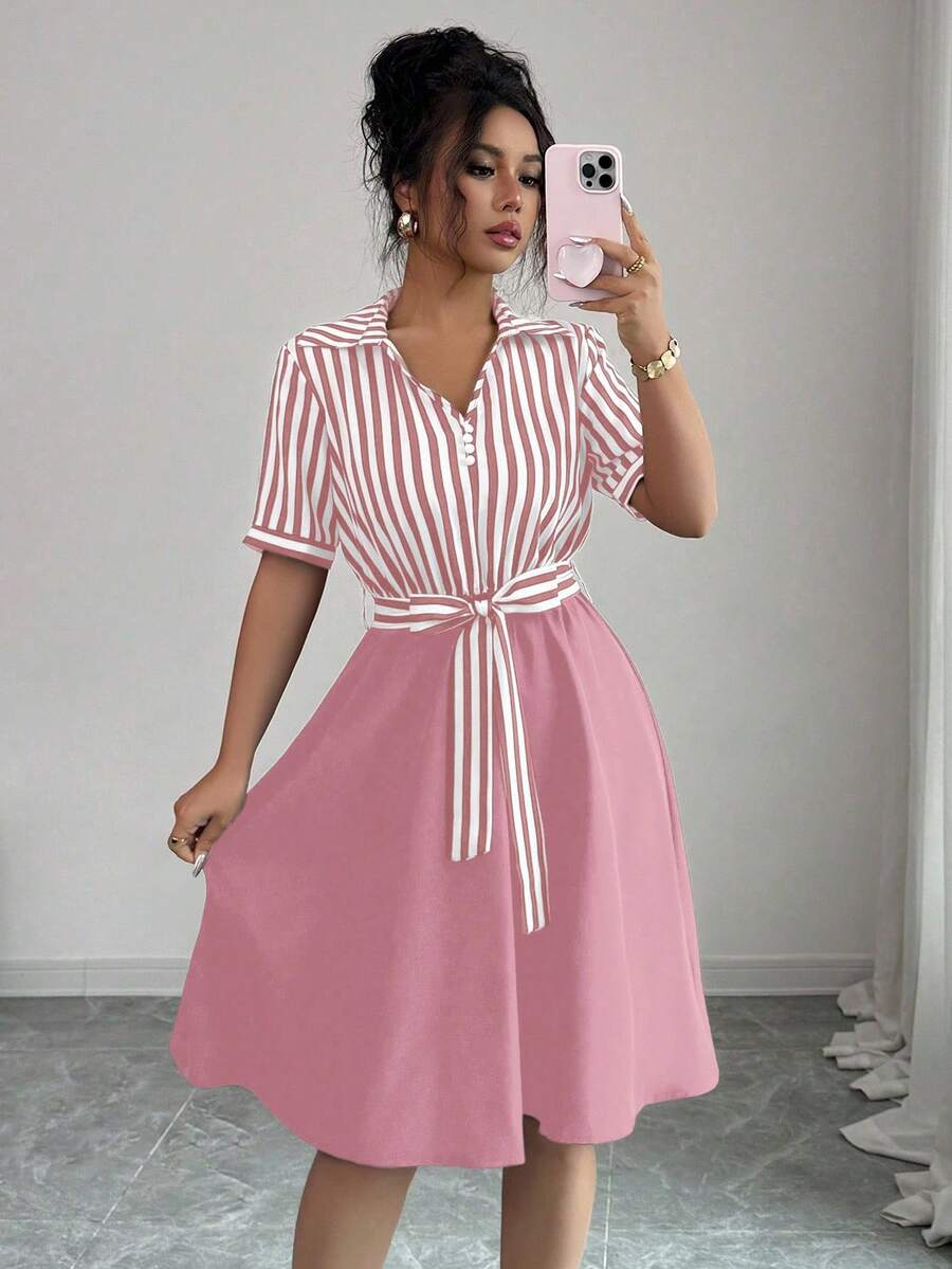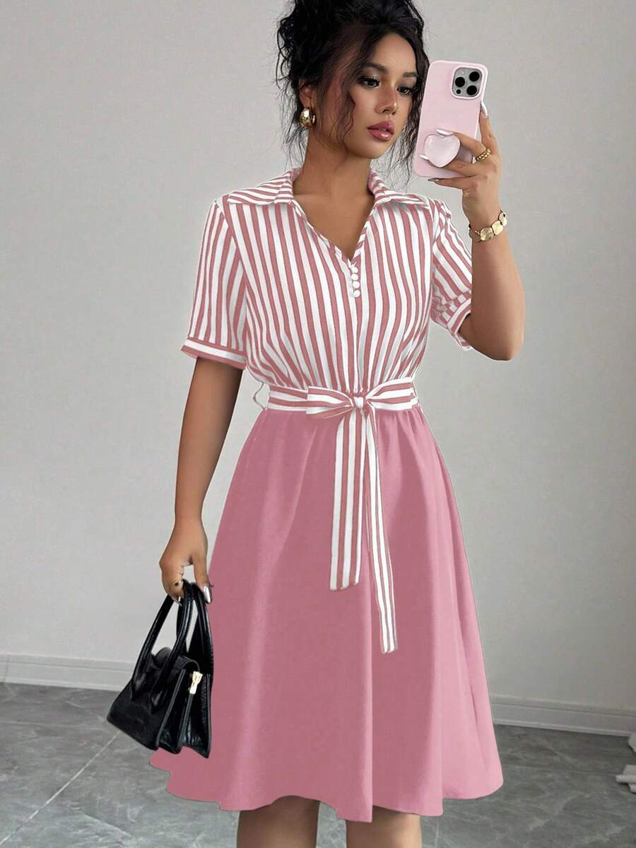 Vestido de manga corta a media pierna con rayas y cinturon para mujer