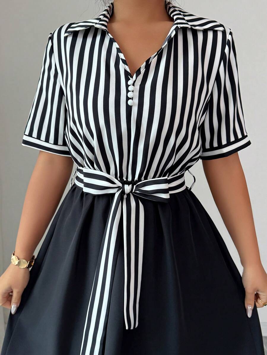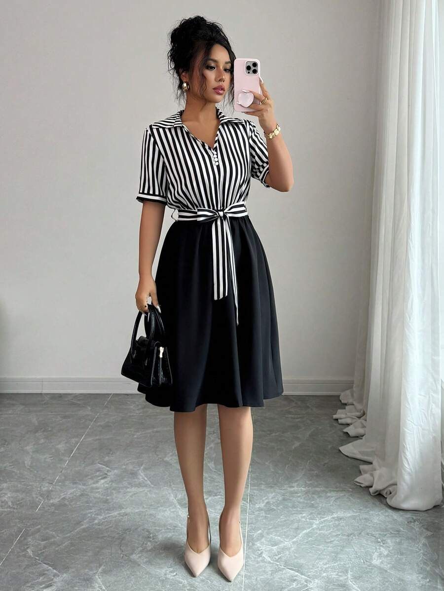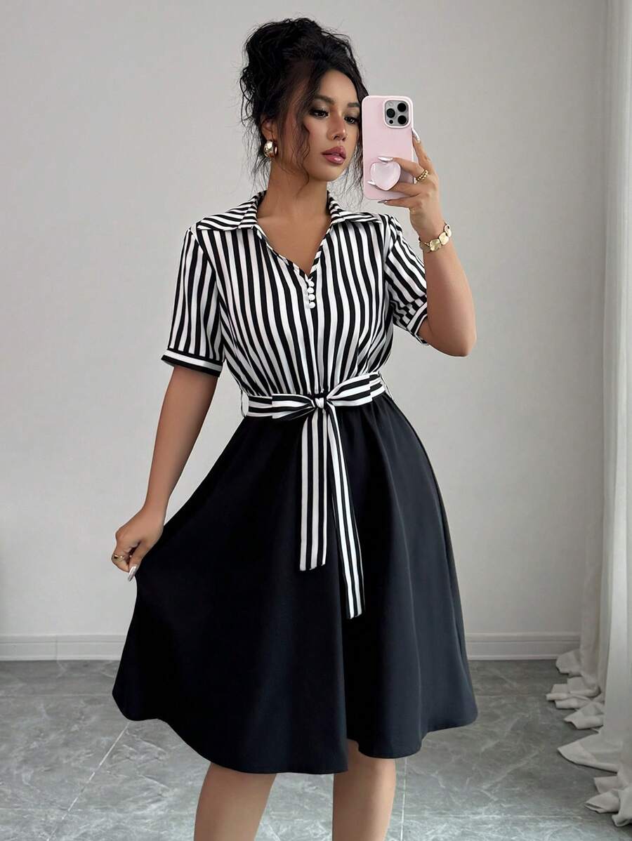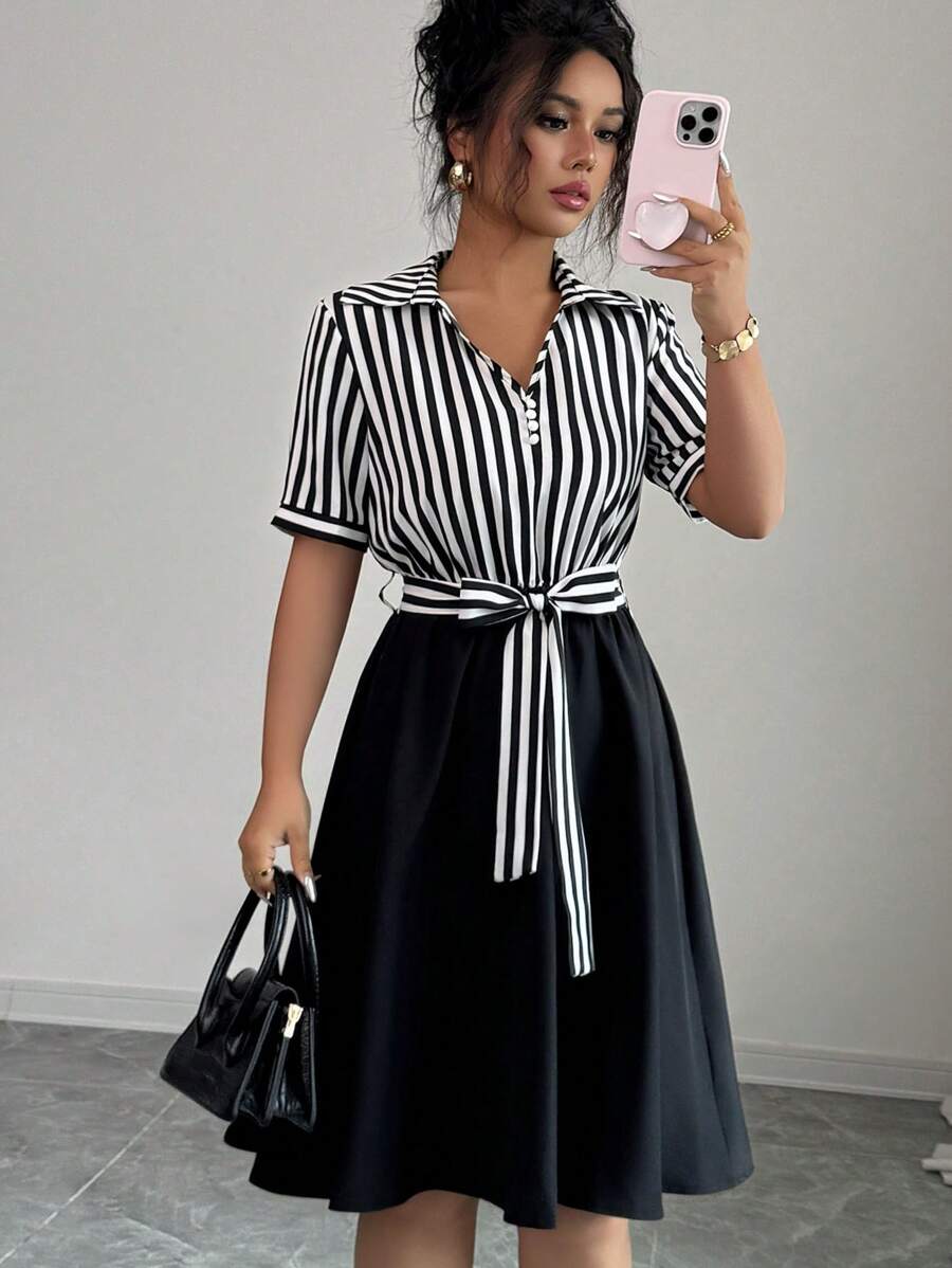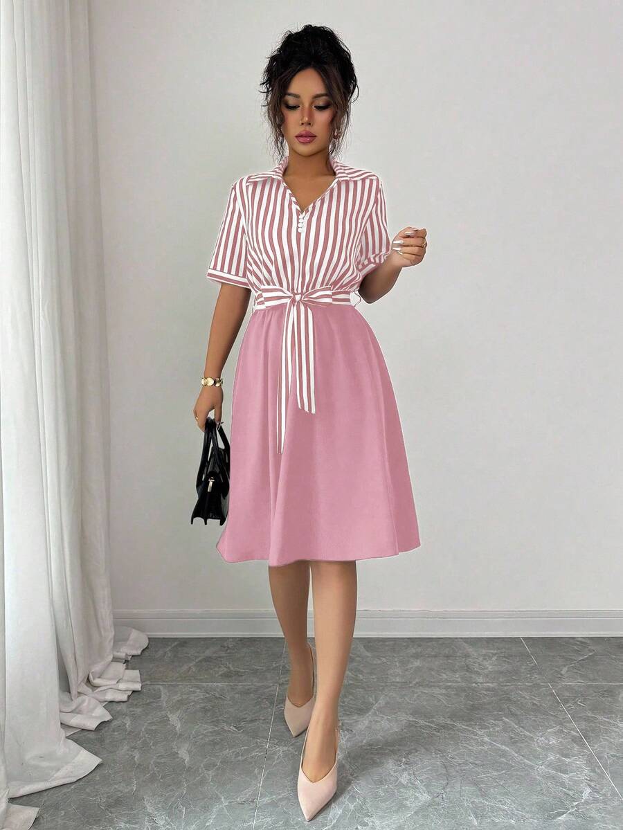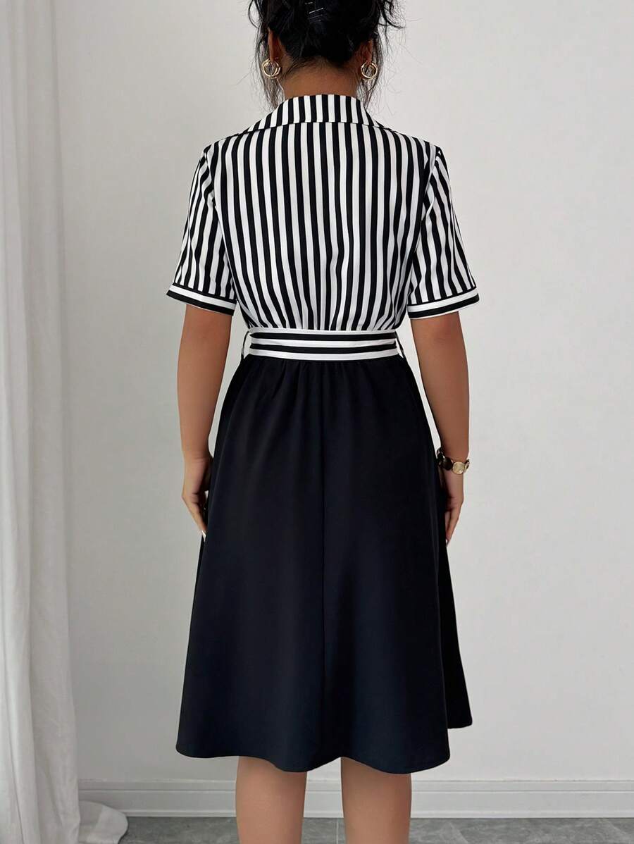 Vestido de manga corta a media pierna con rayas y cinturon para mujer