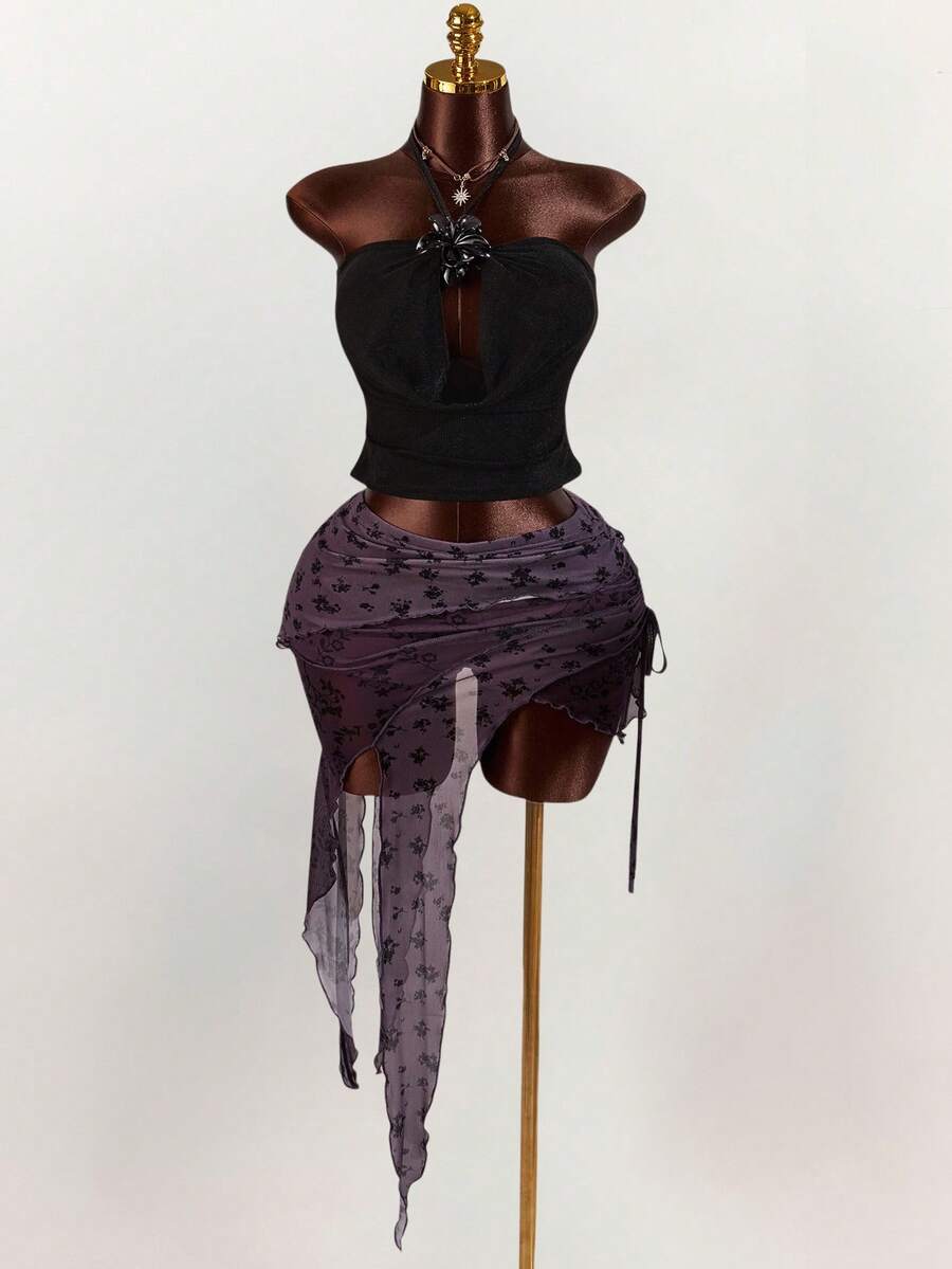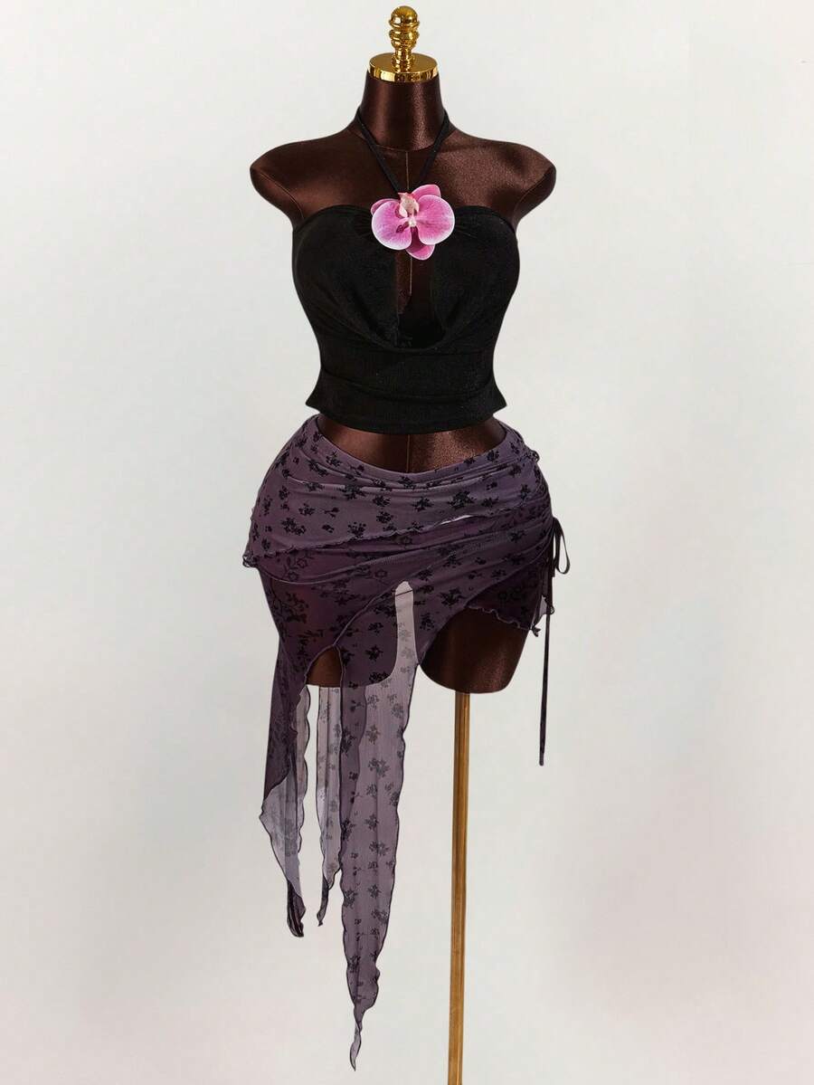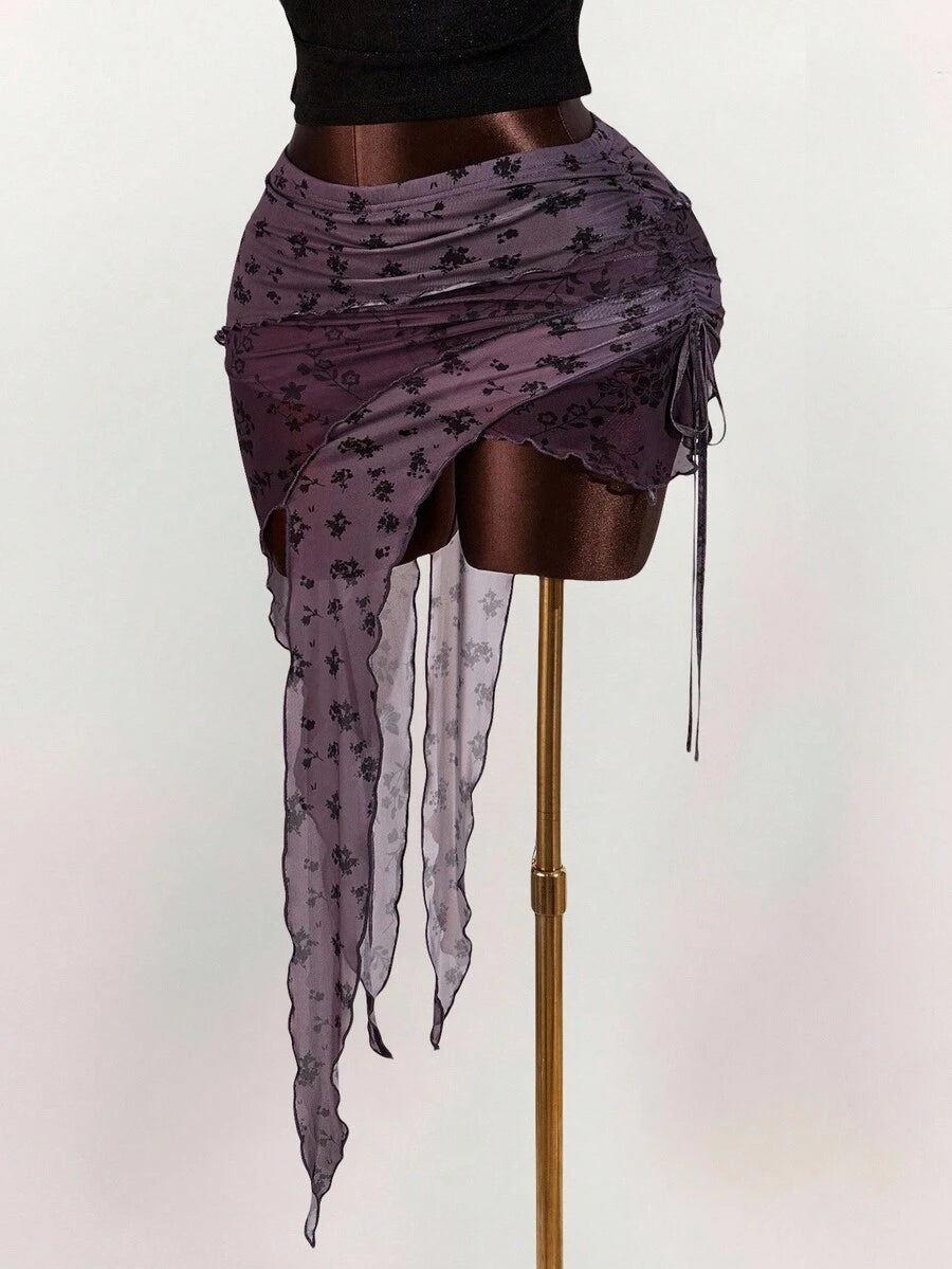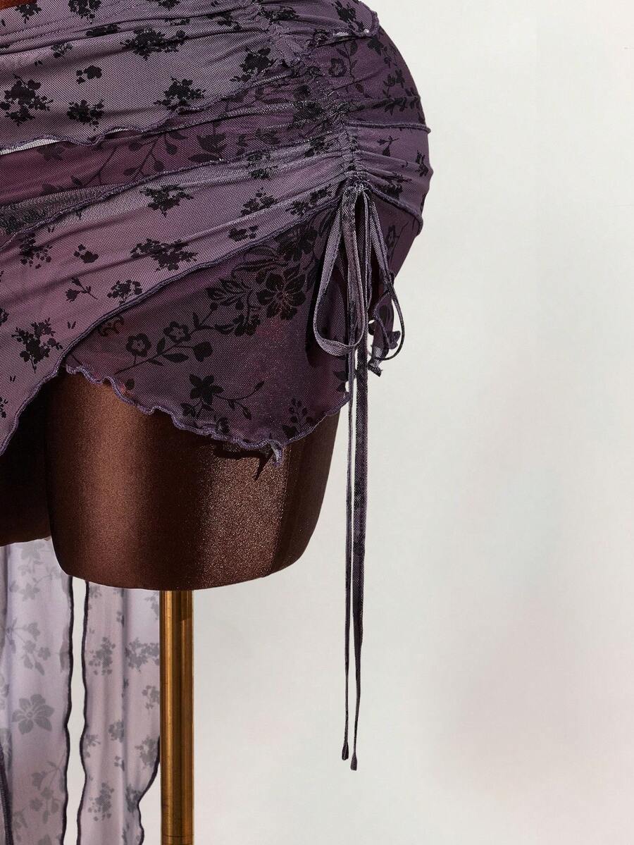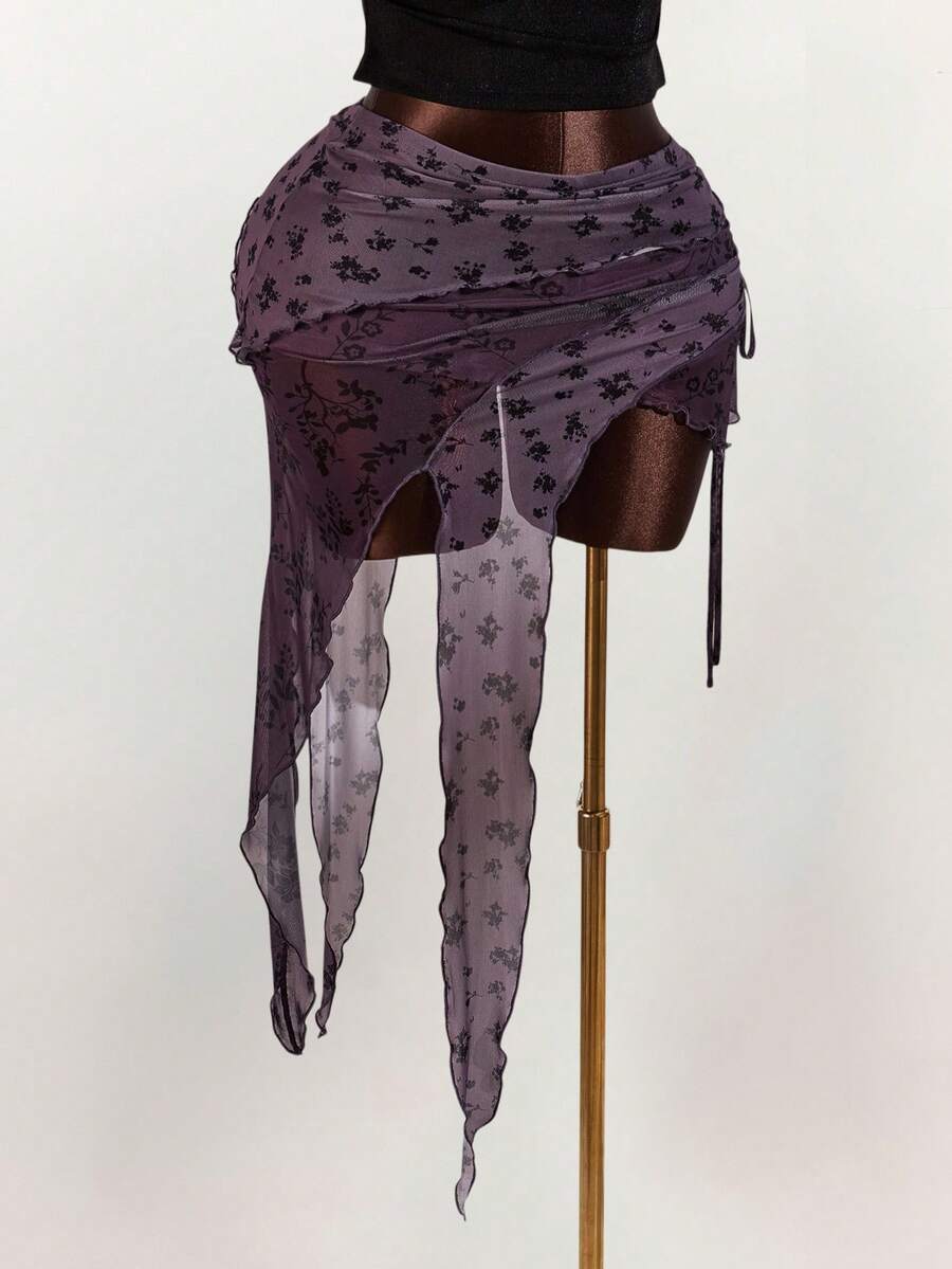 Amplova falda asimetrica de malla con estampado floral y efecto flockado para tallas grandes