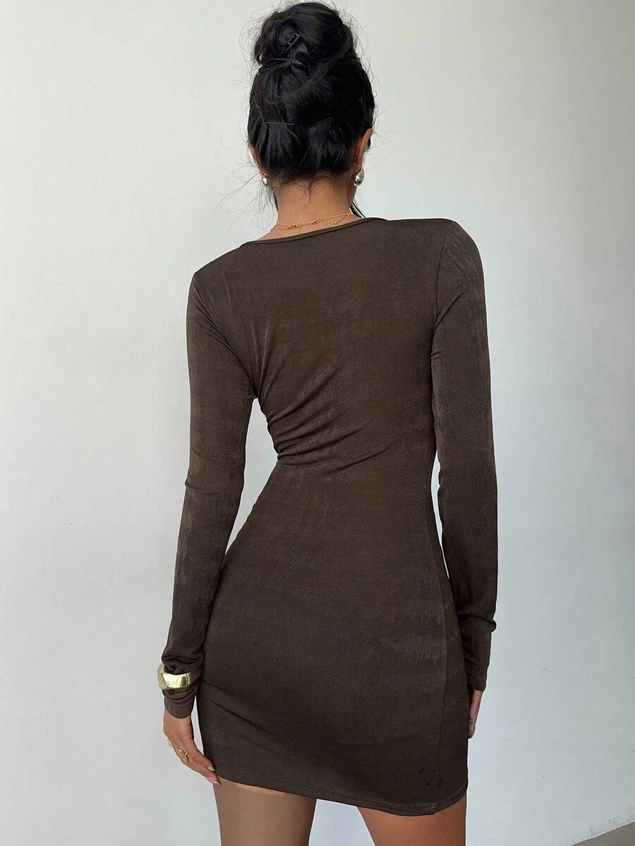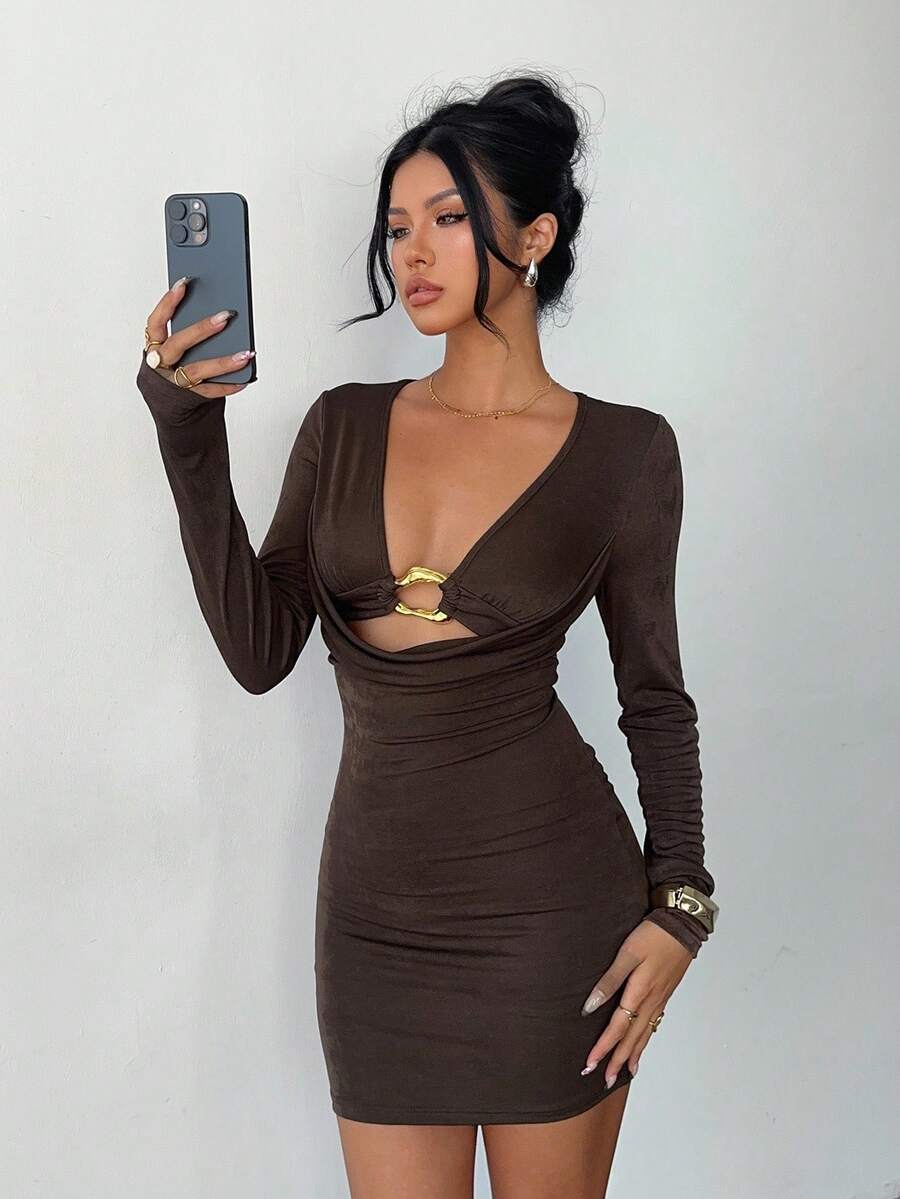 Vestido de mujer para otono/invierno, vestido de manga larga, sistema de color marron maillard, diseno de copa, decoracion metalica, vestido con escote en v retro y2k, vestido 2 en 1, mini vestido de mujer