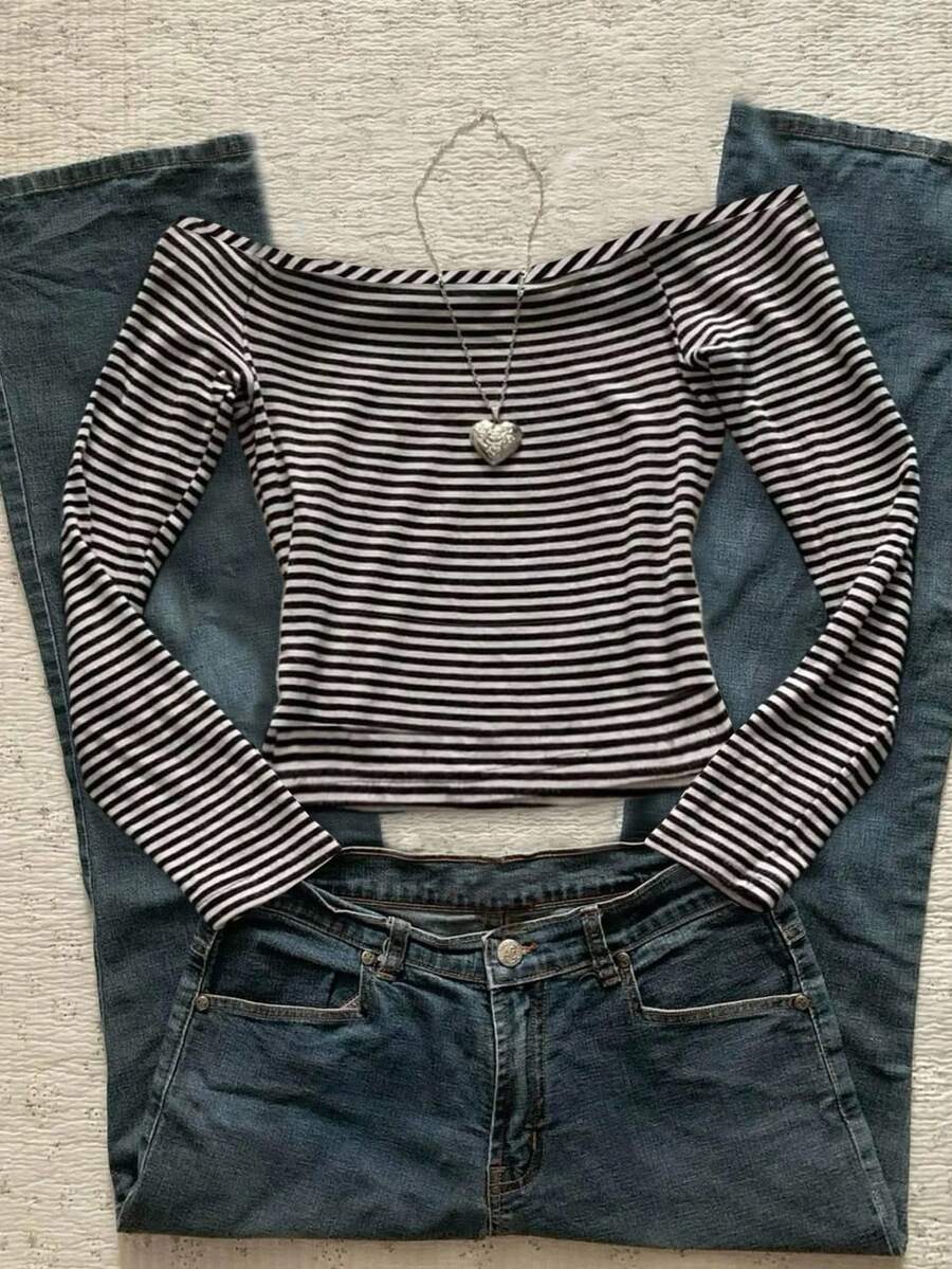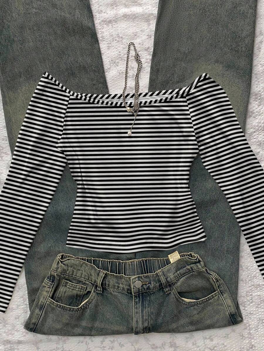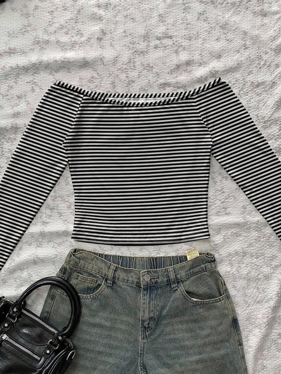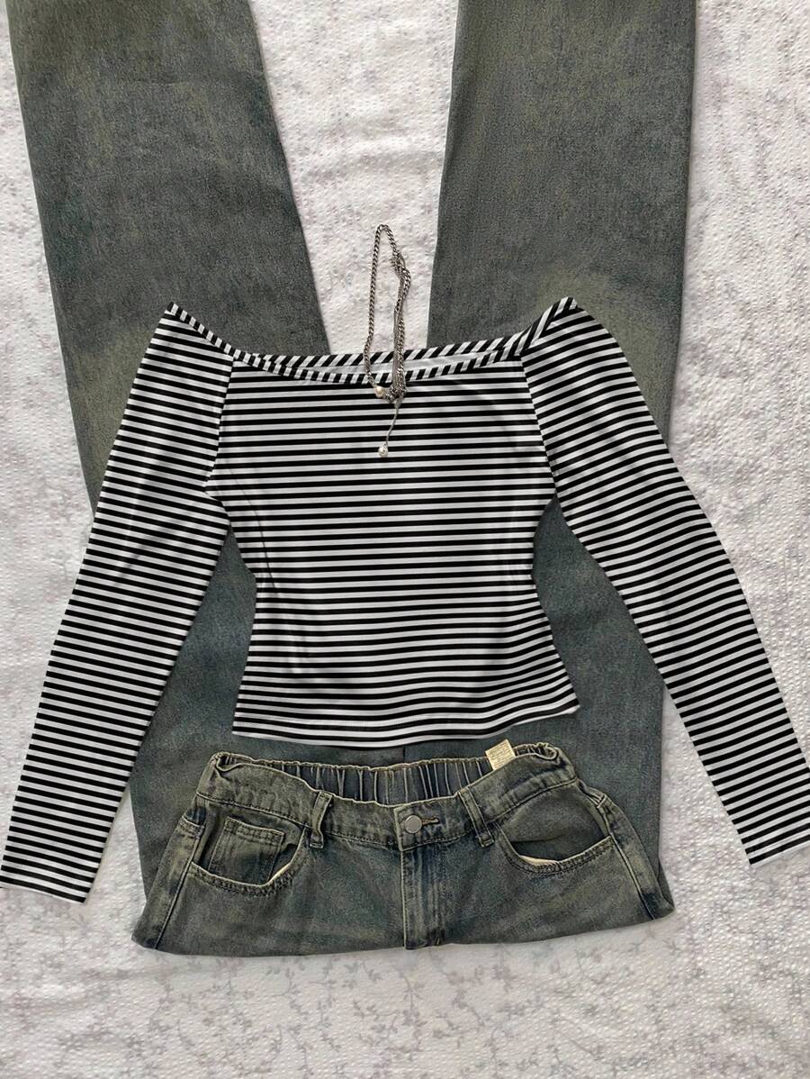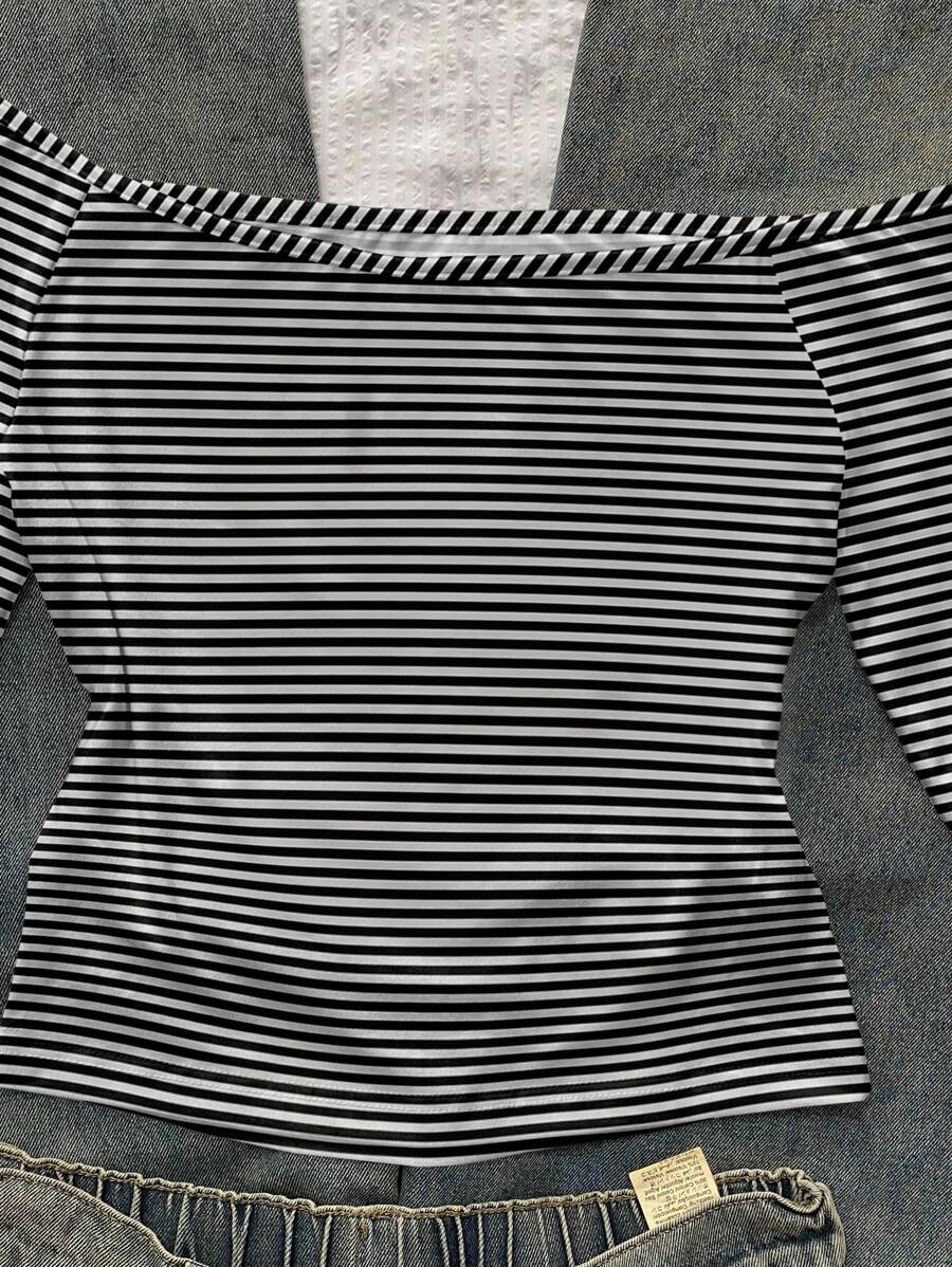 Attitoon camiseta de mujer con hombros descubiertos a rayas negras y grises de estilo casual vintage, adecuada para otono/invierno, vintage, sexy, linda, y2k, bohemia, hippie, festival de musica, punk, y2k, sexy, gotica