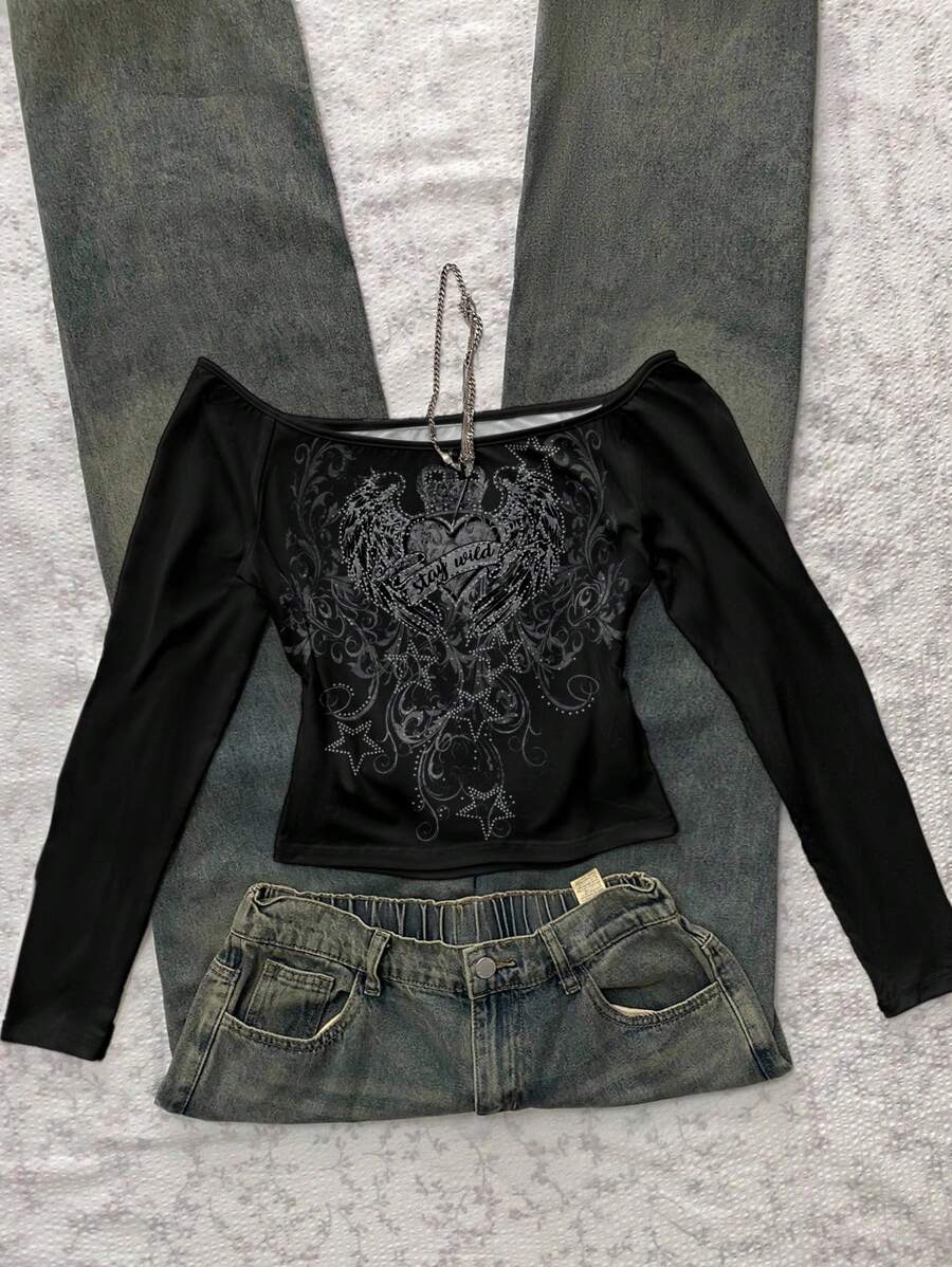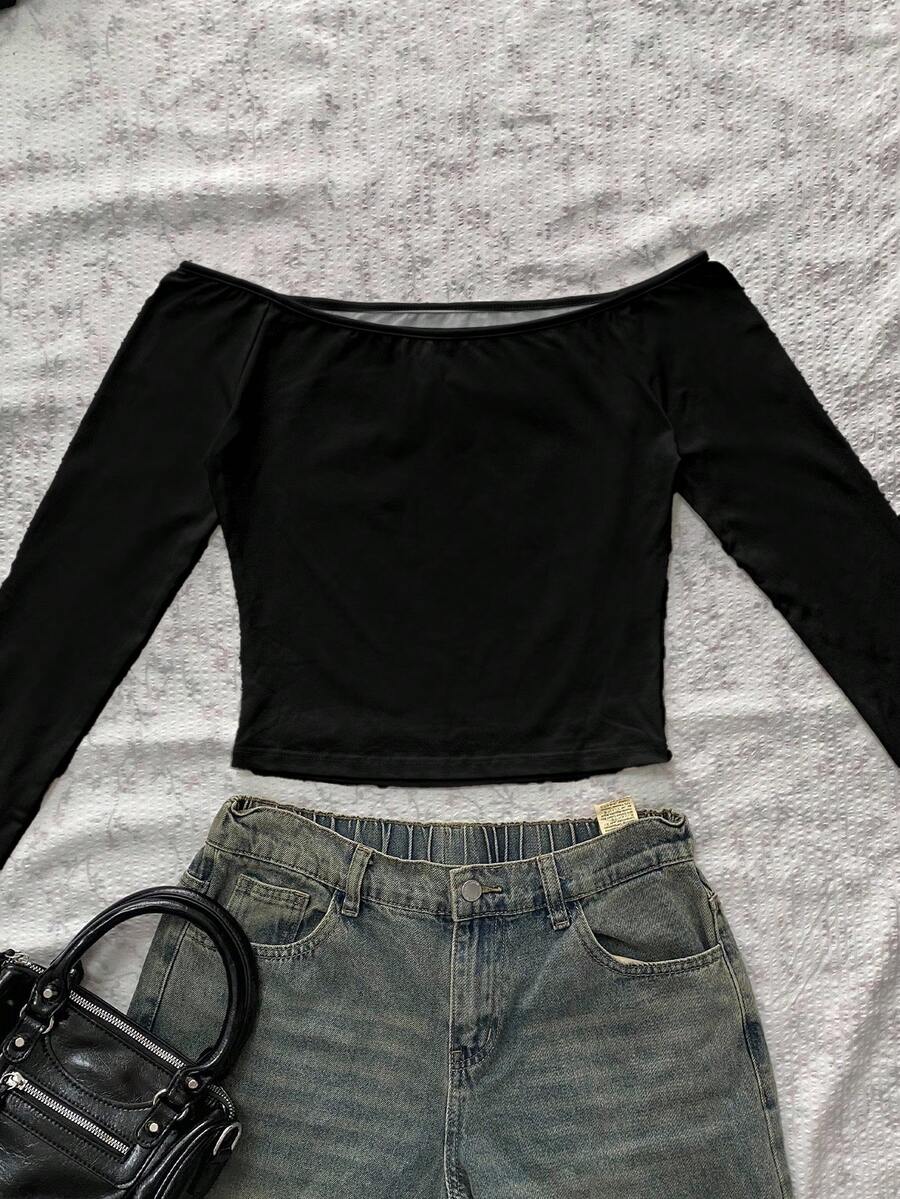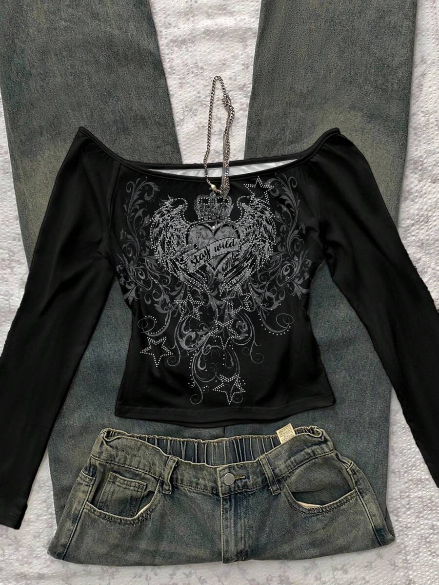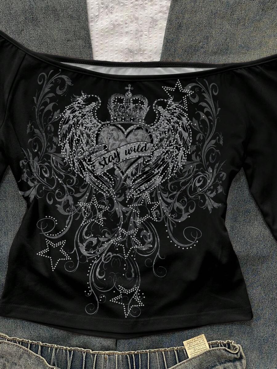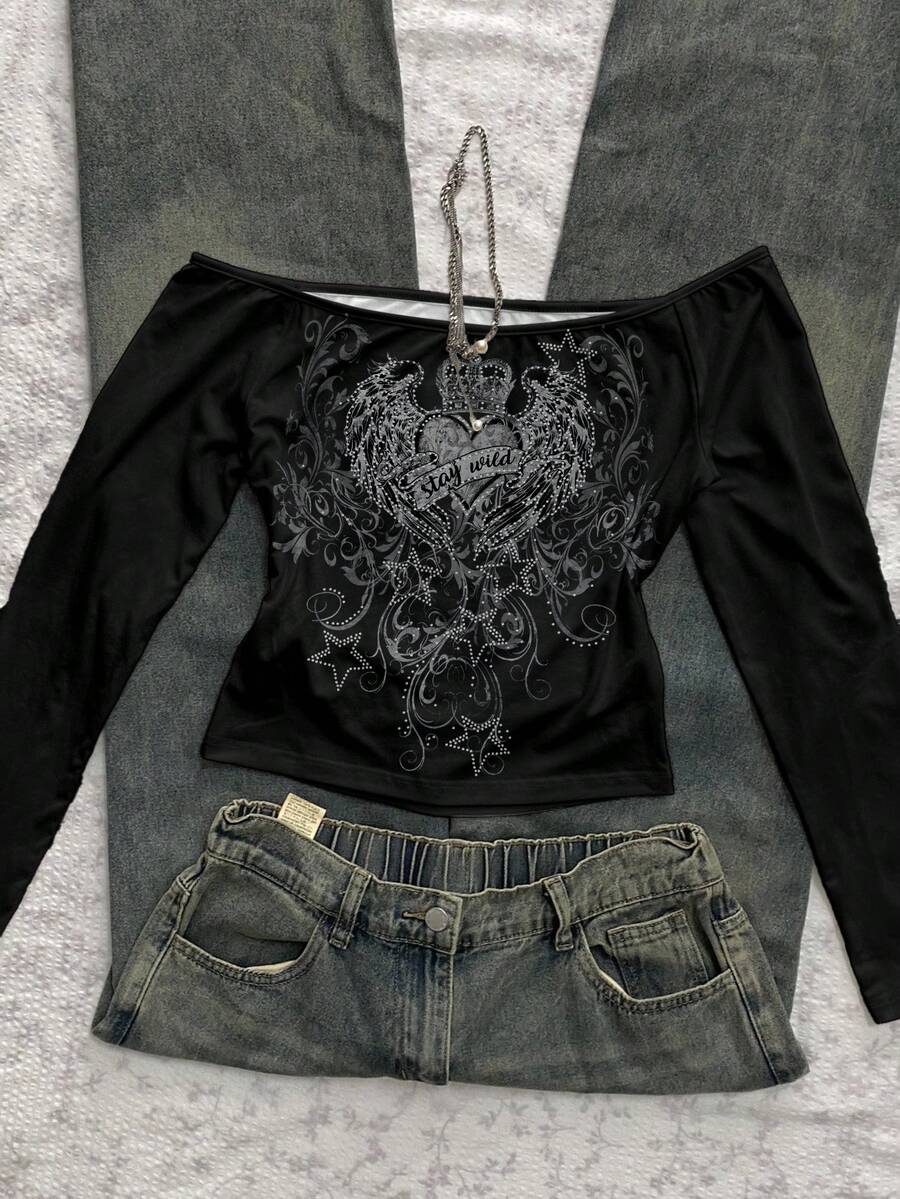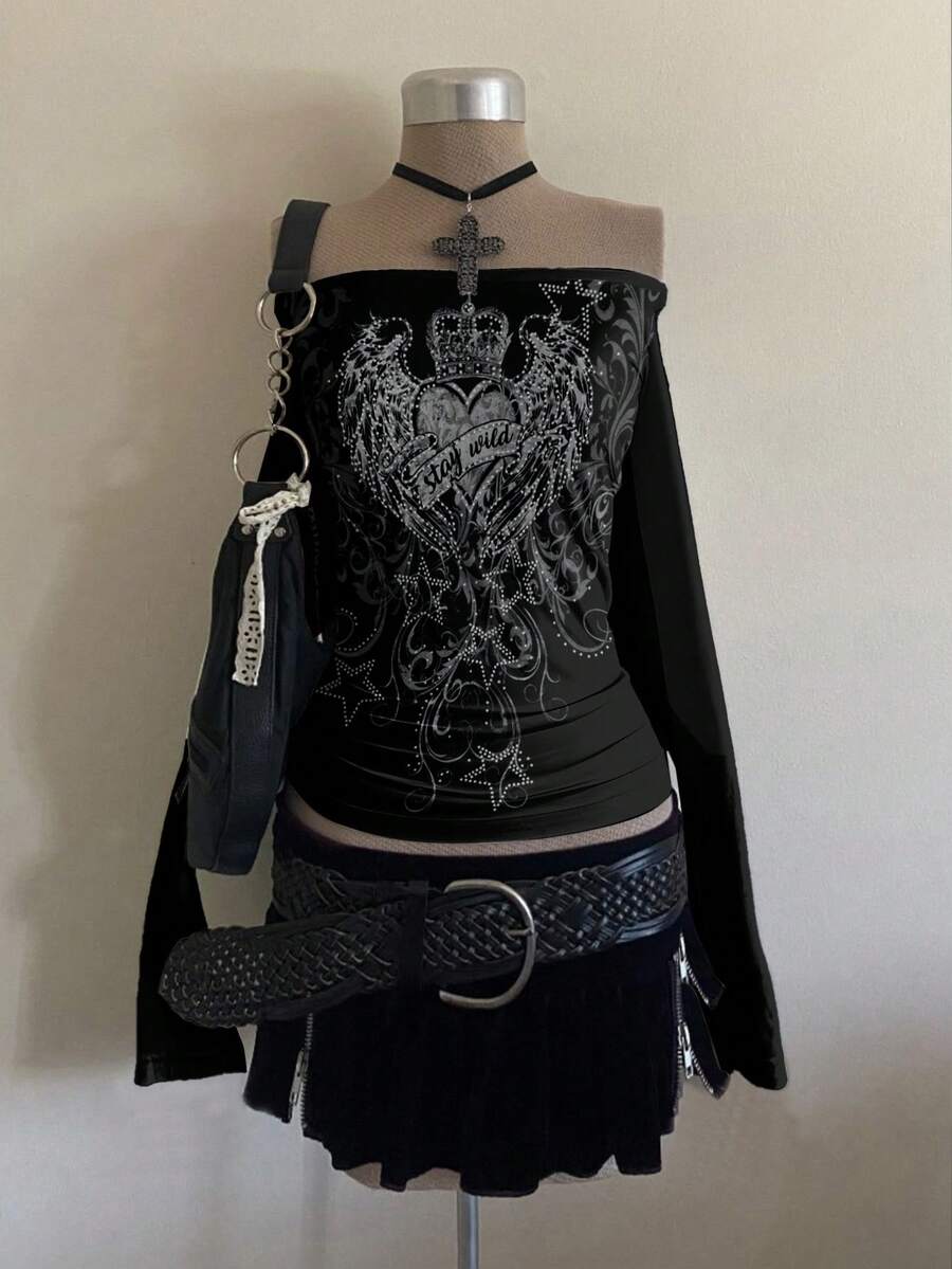 Attitoon camiseta de mujer con hombros descubiertos a rayas negras y grises de estilo casual vintage, adecuada para otono/invierno, vintage, sexy, linda, y2k, bohemia, hippie, festival de musica, punk, y2k, sexy, gotica