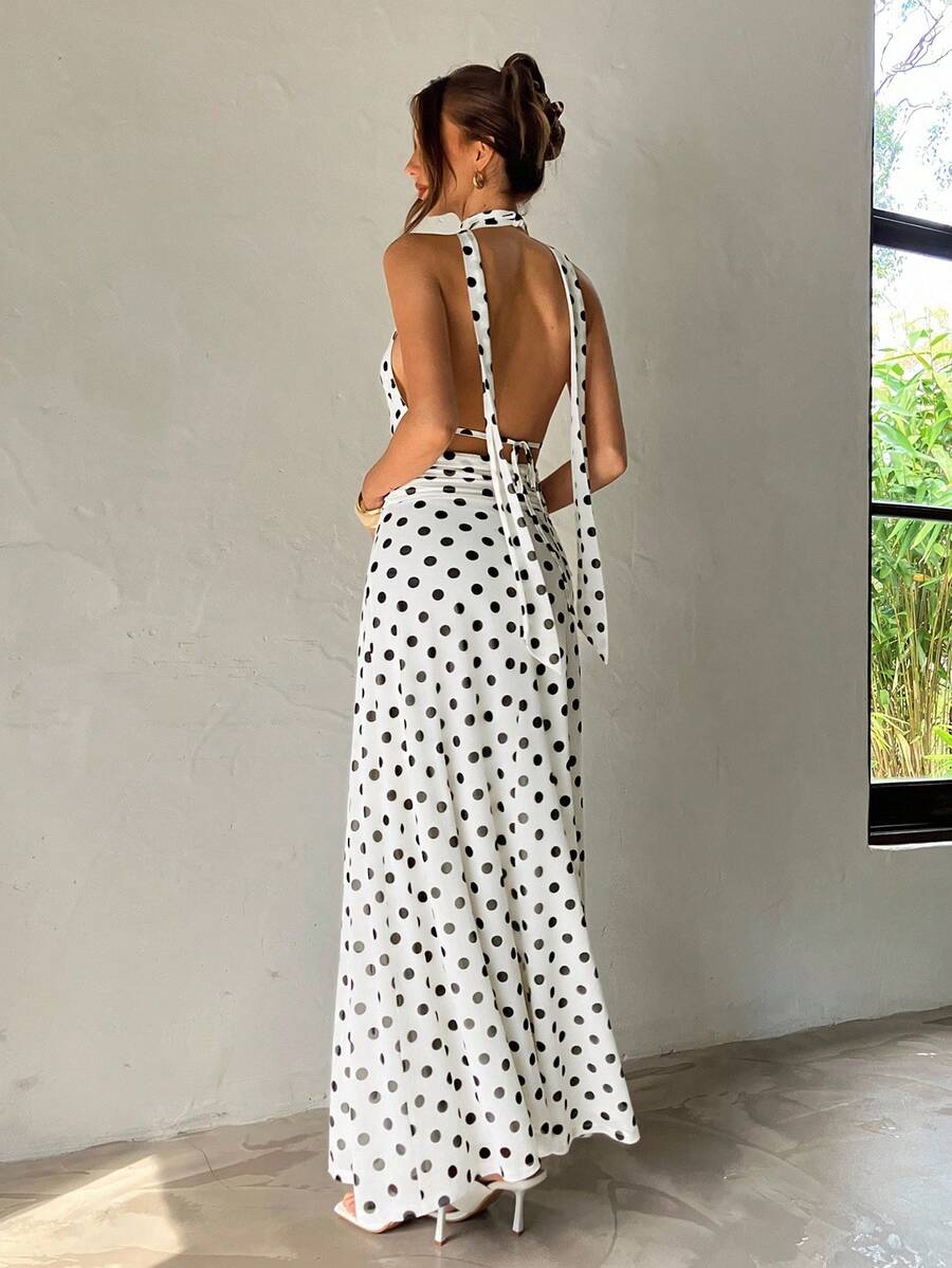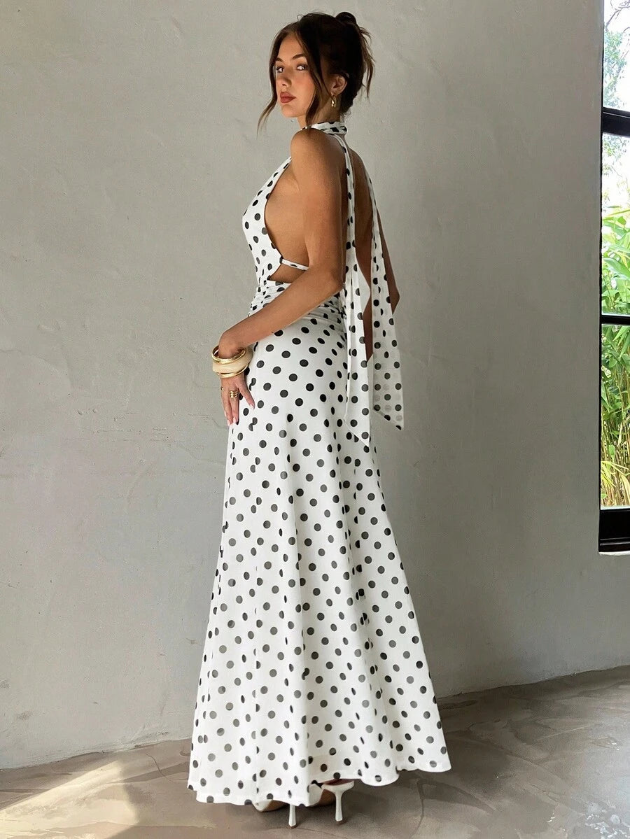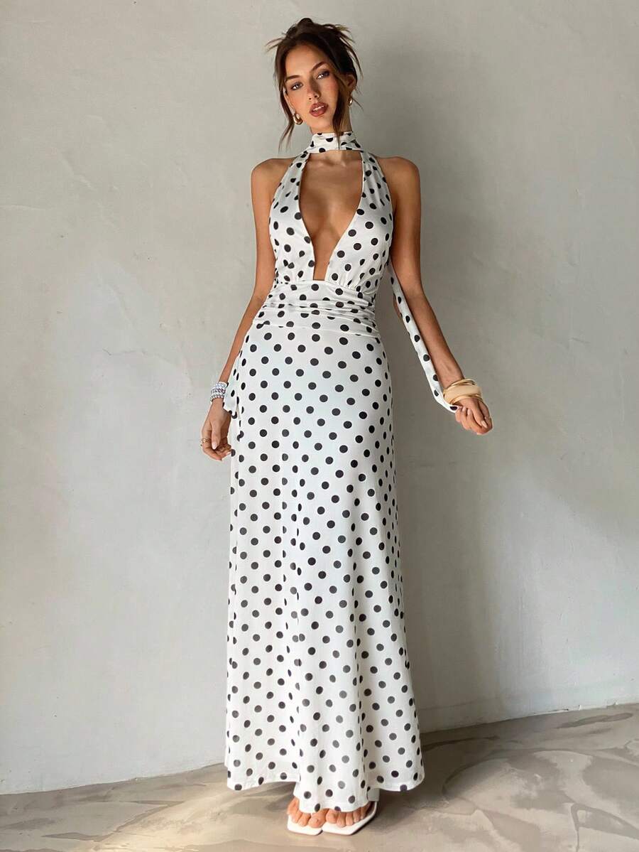 Vestido largo con cuello halter, escote en v profundo y lazo, con estampado de lunares, vestido elegante vintage para salidas y citas, otono/invierno