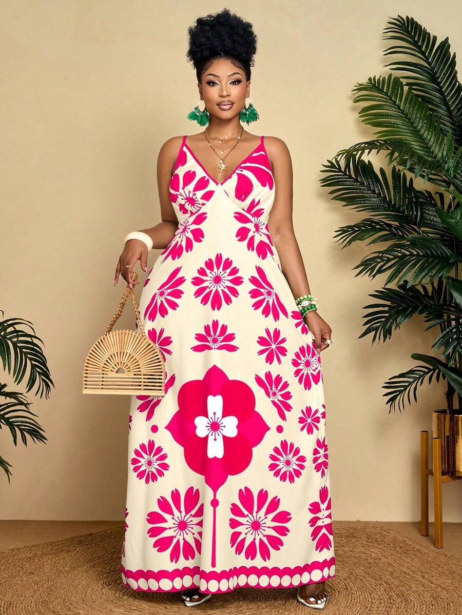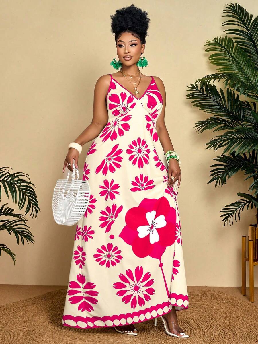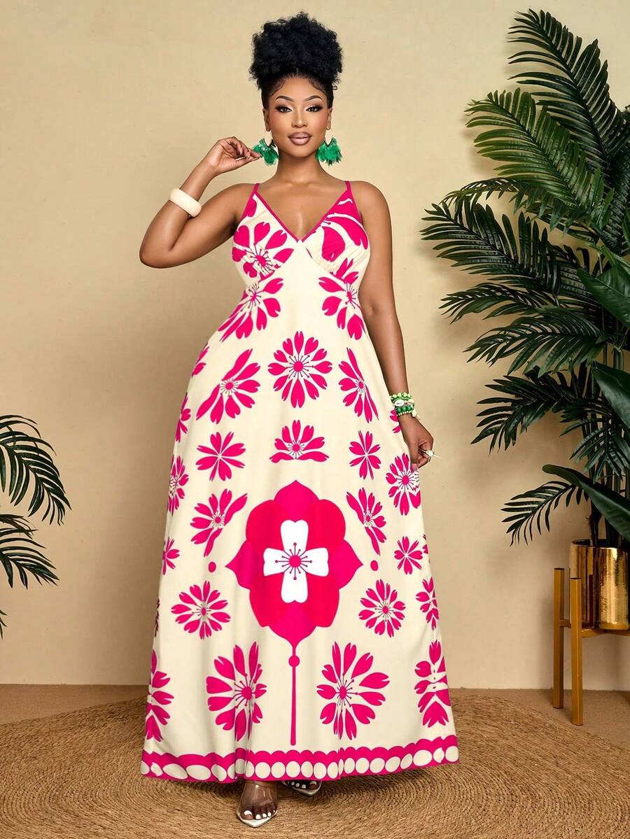 Vestido de verano con escote en v y espalda abierta con estampado floral, talla grande, para mujer. estilo tropical, casual de vacaciones, fresco y soleado (estampado aleatorio)